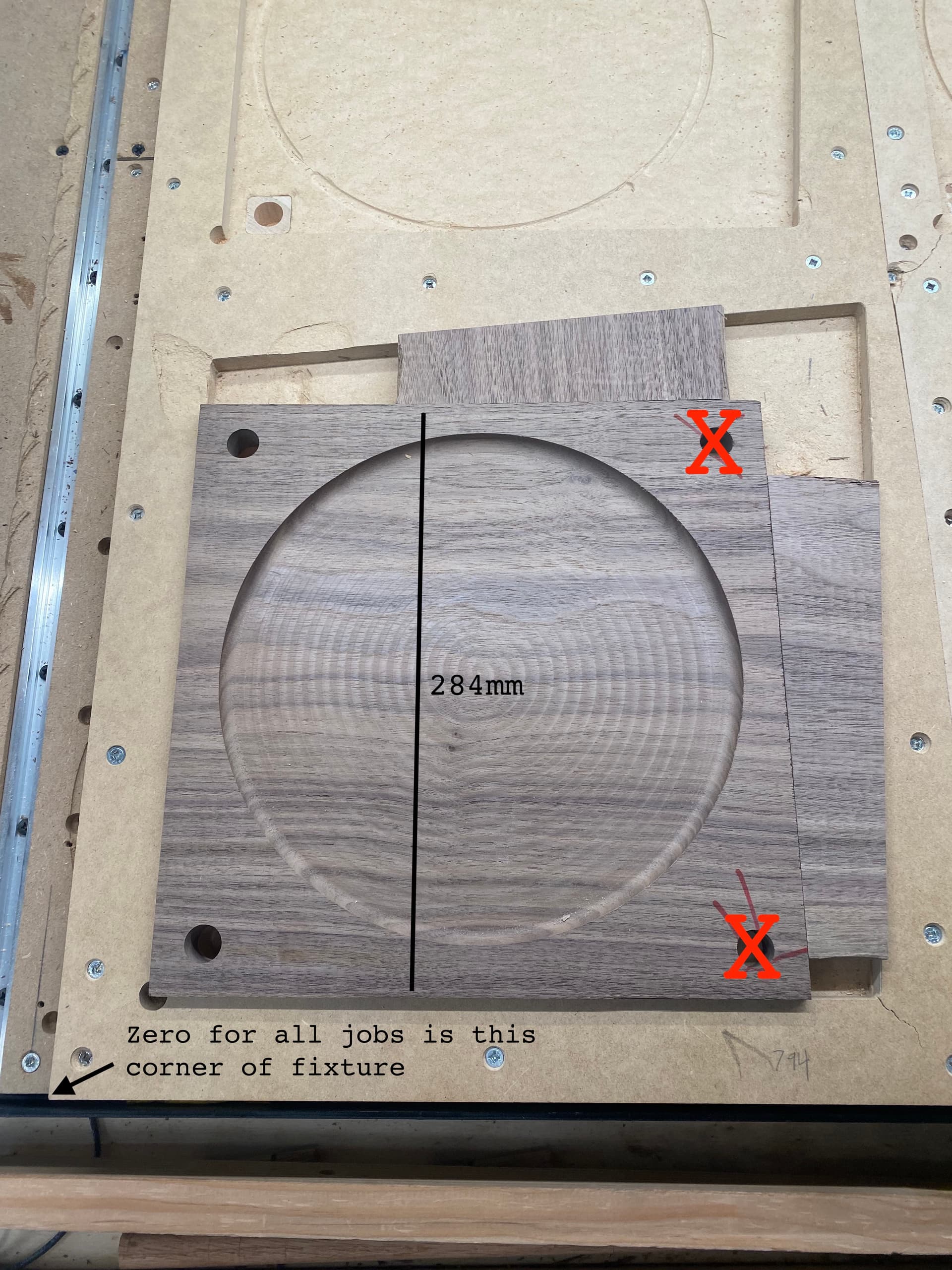 I had been using the dowel holes for this - to check that the alignment was good I created a 2mm deep contour around each of them, which should have worked … except when things went wrong I assumed the issue was with my setup, so even though I saw there was an alignment issue, it didn’t occur to me it was due to lost steps. Oh well. Next time I’ll get it!
