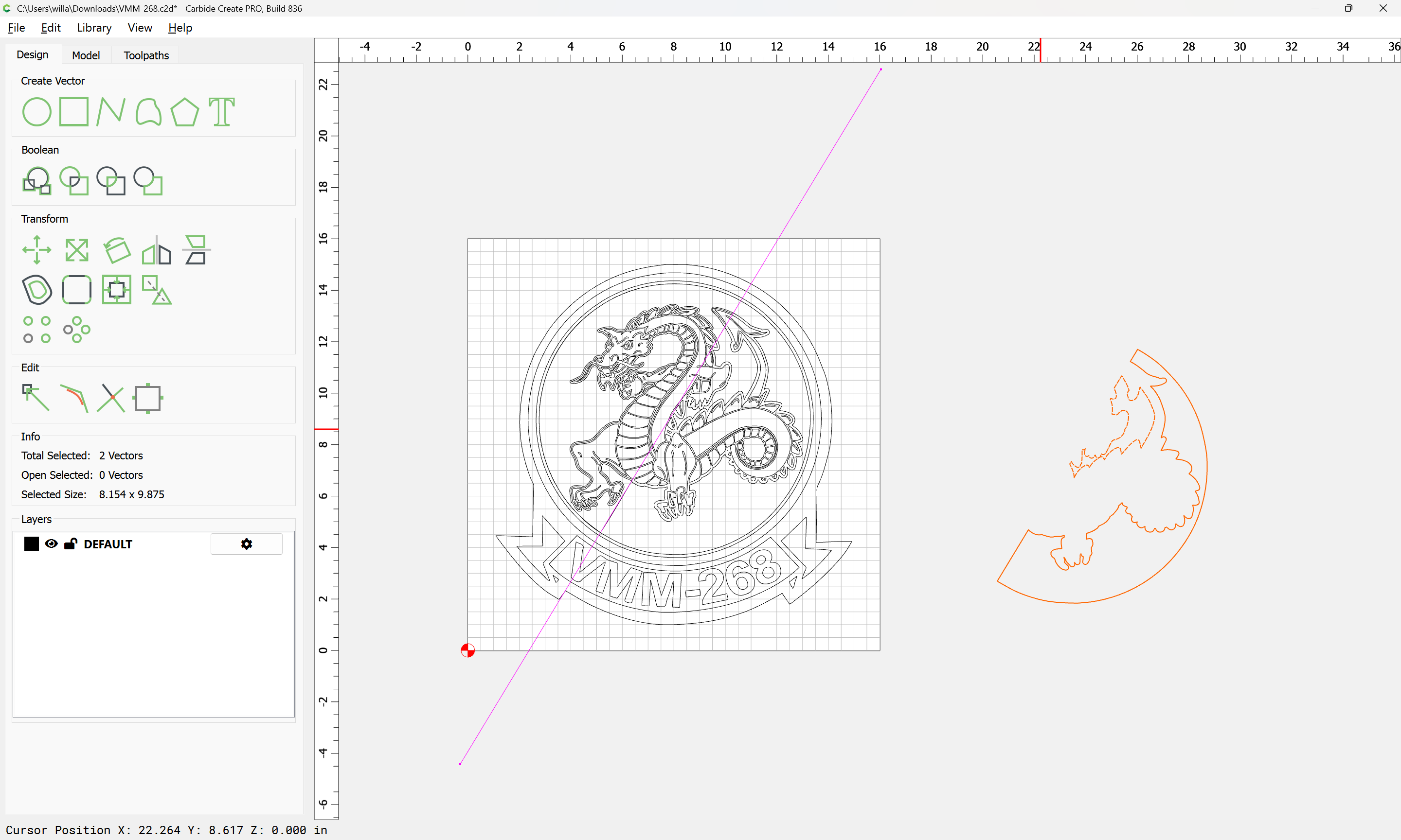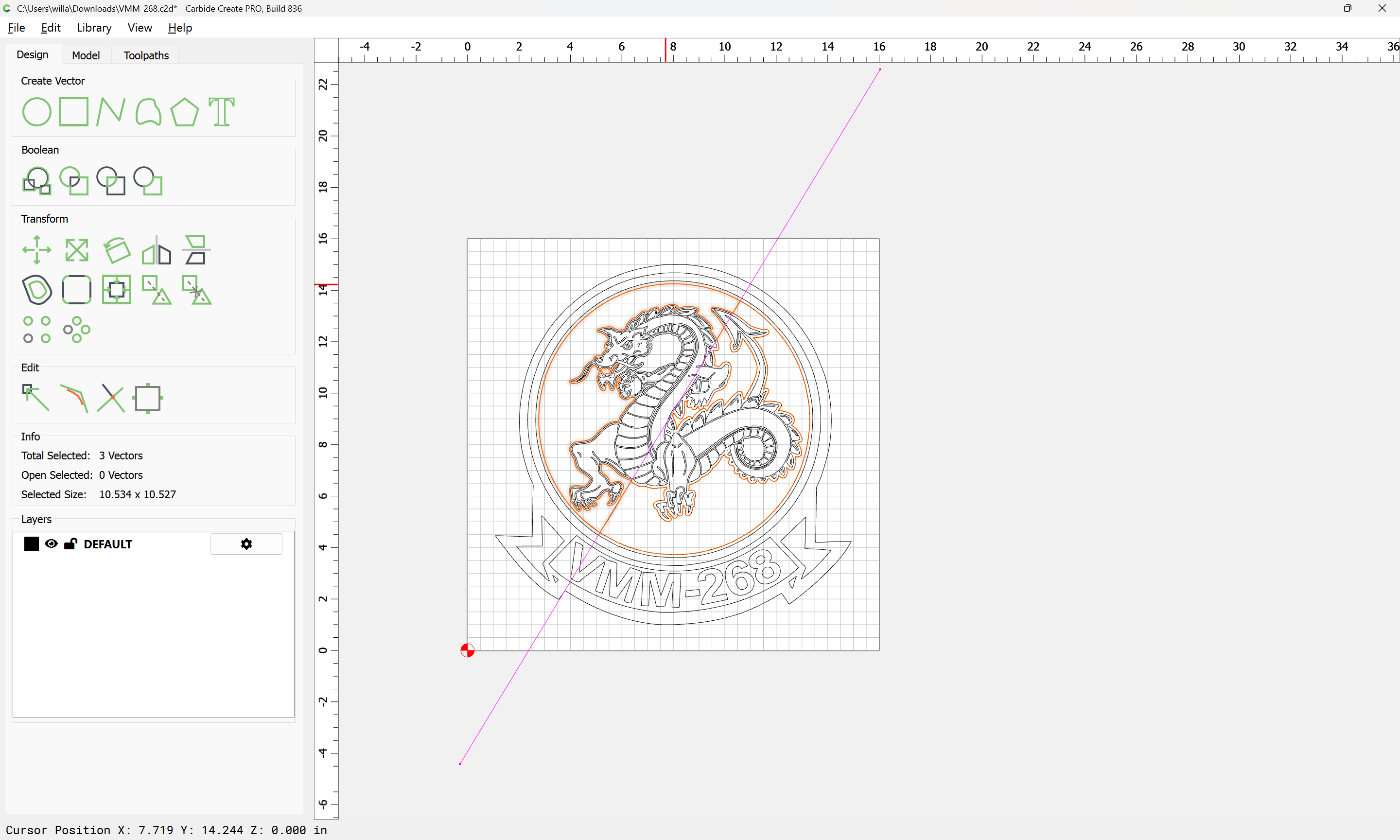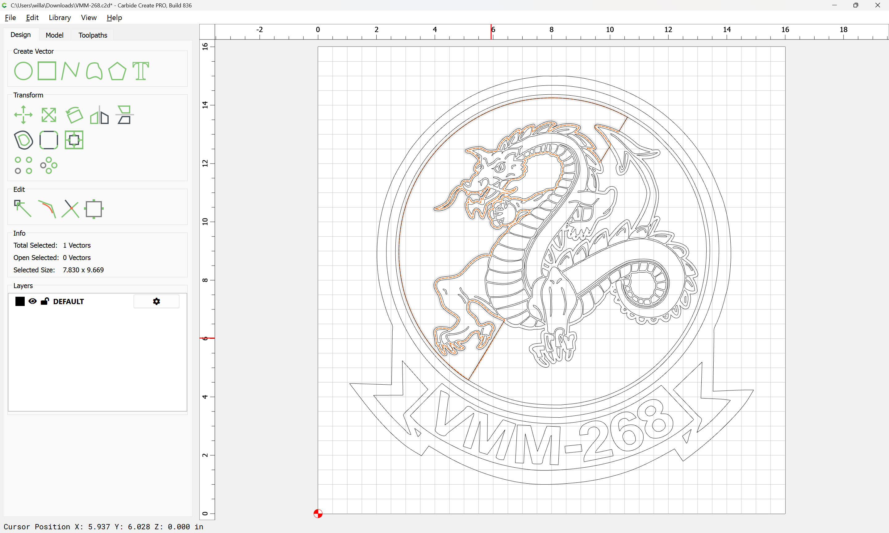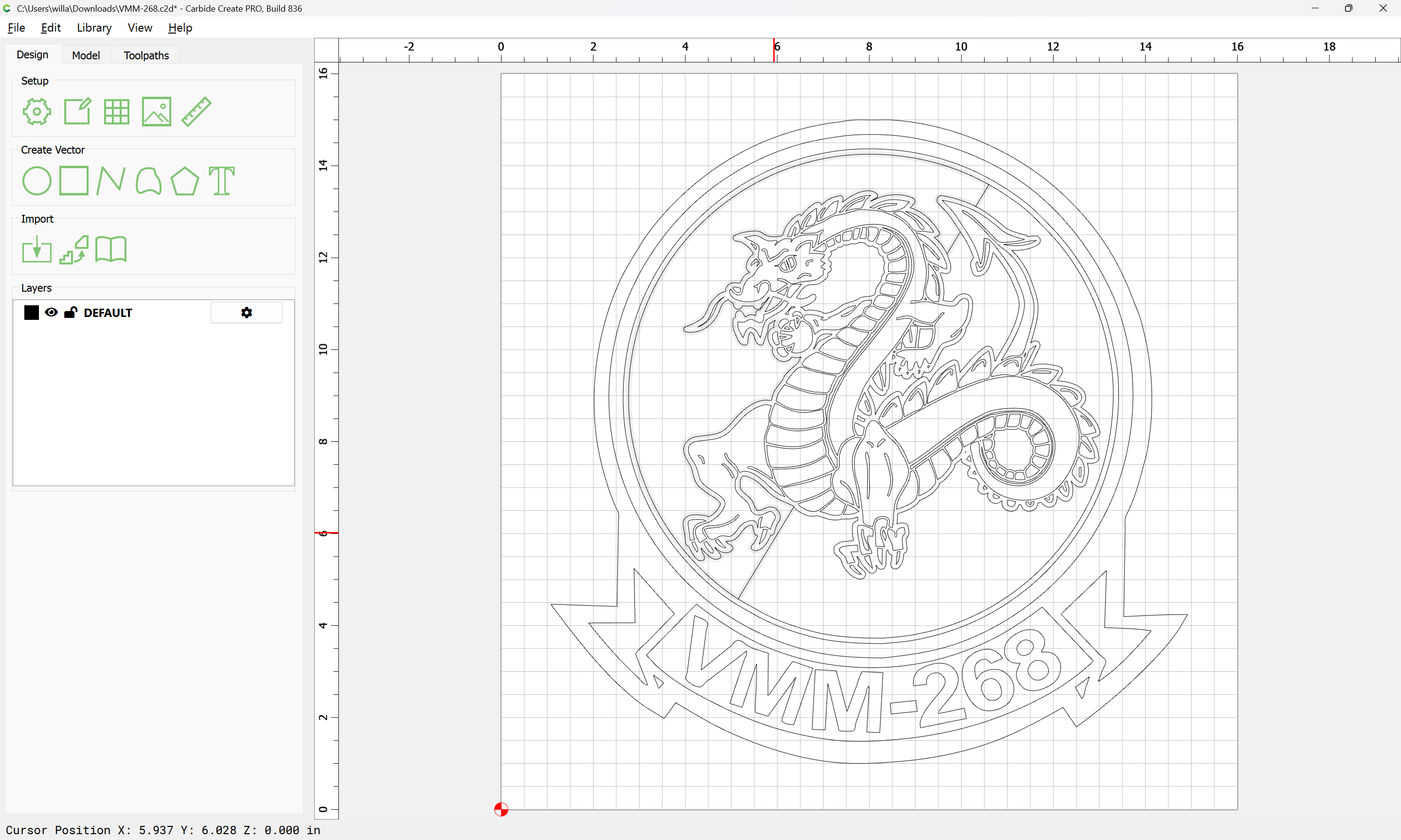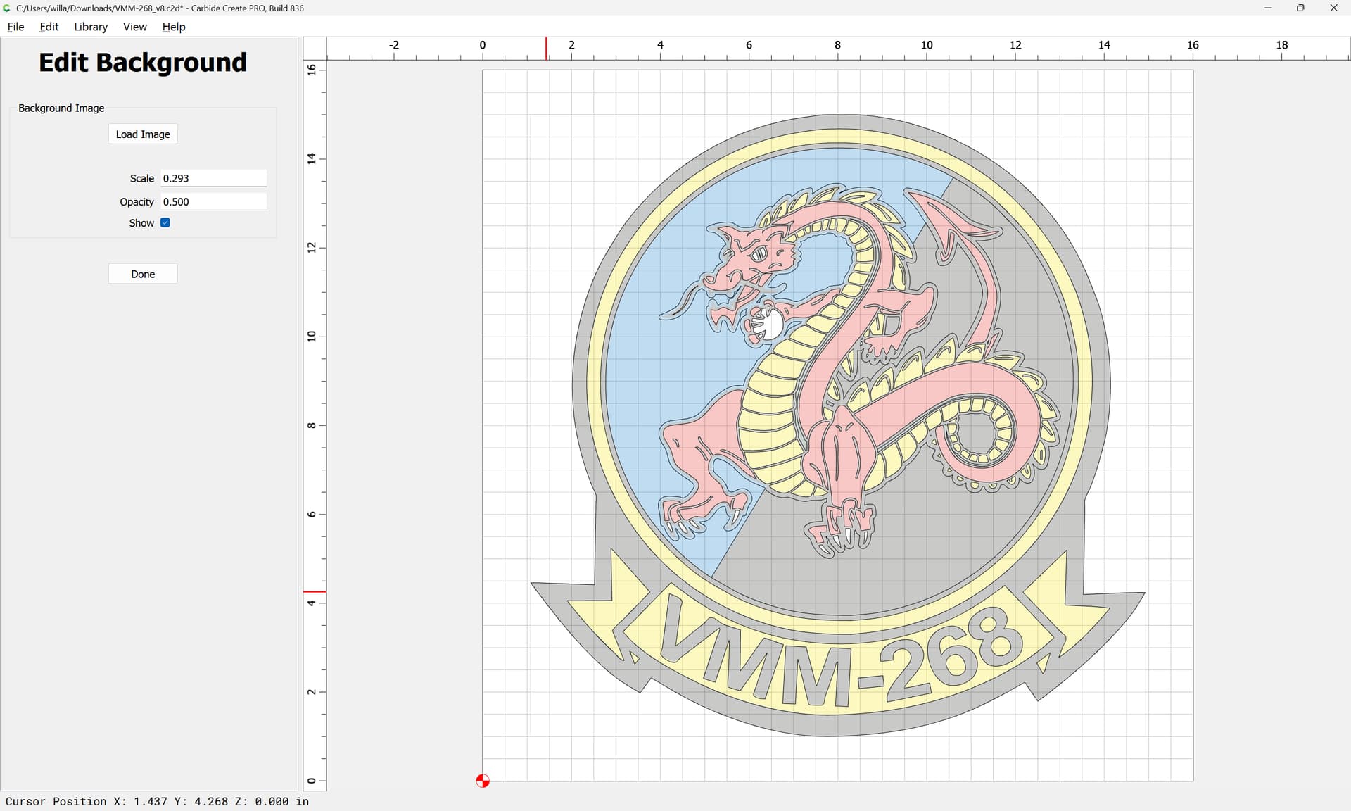 I am looking for help in carving this Logo for my brothers Military unit. Dimensions will be approximately 16x16 carved in 1" thick poplar. I would like to do something similar to what Cornbread Customs does. For those with more experience, how would you go about setting this up? Do you use a separate software to break everything up by color? What would be your painting process? I have a CC file drawn up, but I just feel that there has to be a better way.