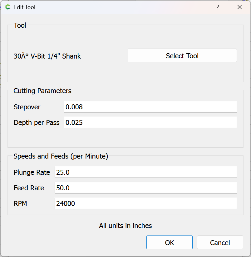 I have no idea why it shows up like that. I have the IDC library added and I load it from there. It matches the settings recommended from the site for the exact bit I bought. I think I have selected the right one. It acts as expected in all projects I run with a 30 degree vbit. I am just having trouble finding the right depth settings. I think I might be too shallow on the inlay and need to go deeper with those settings but I keep changing things and not quite getting a really tight fit, everything is slightly off!
