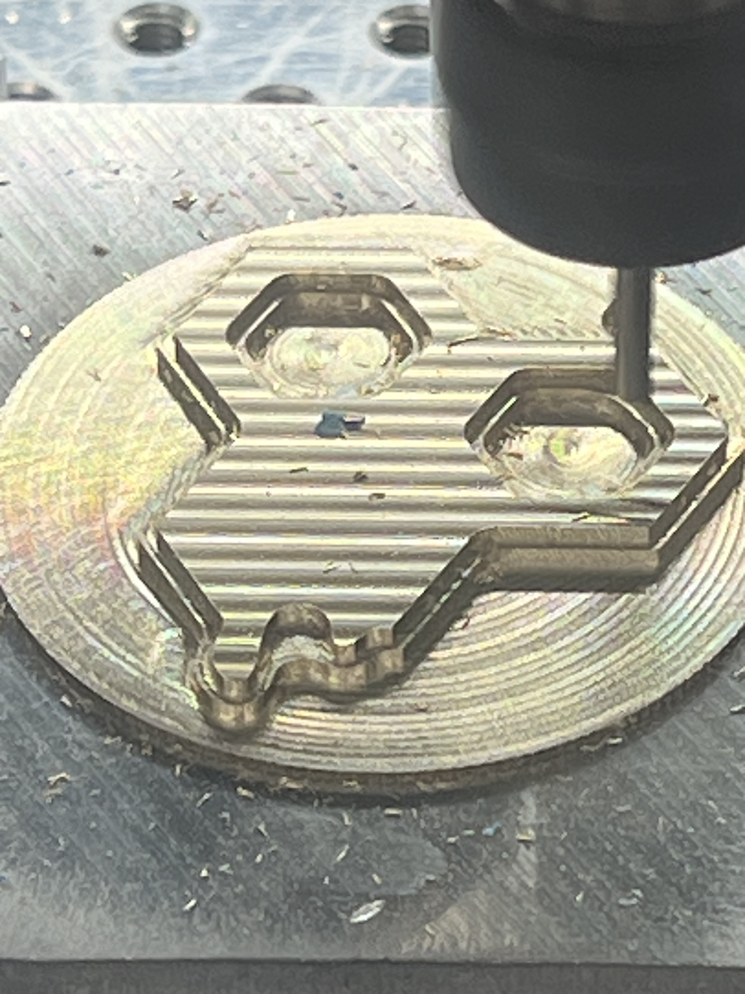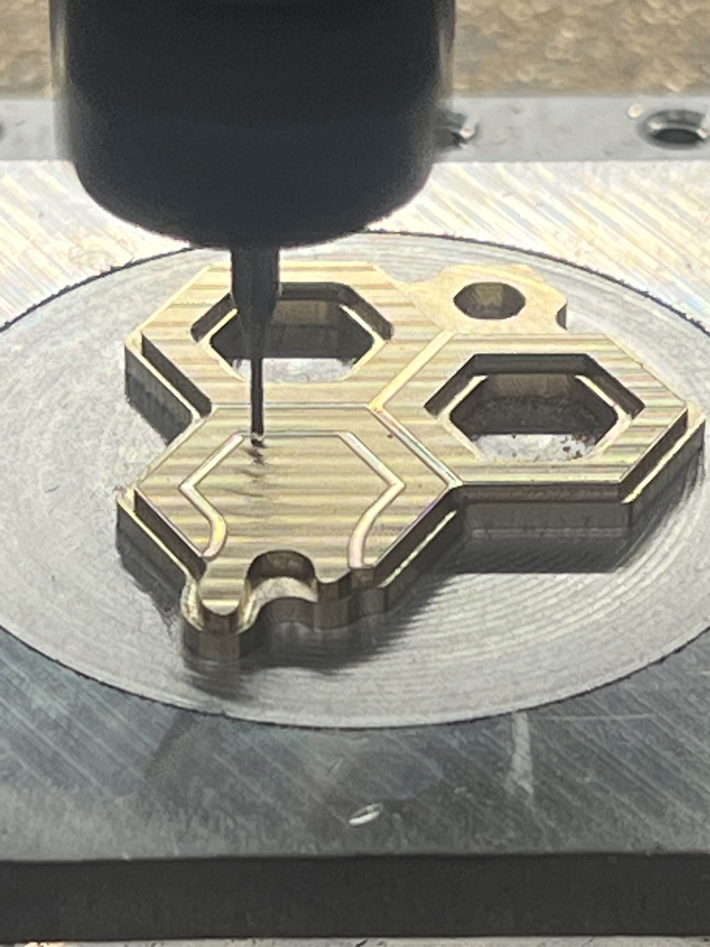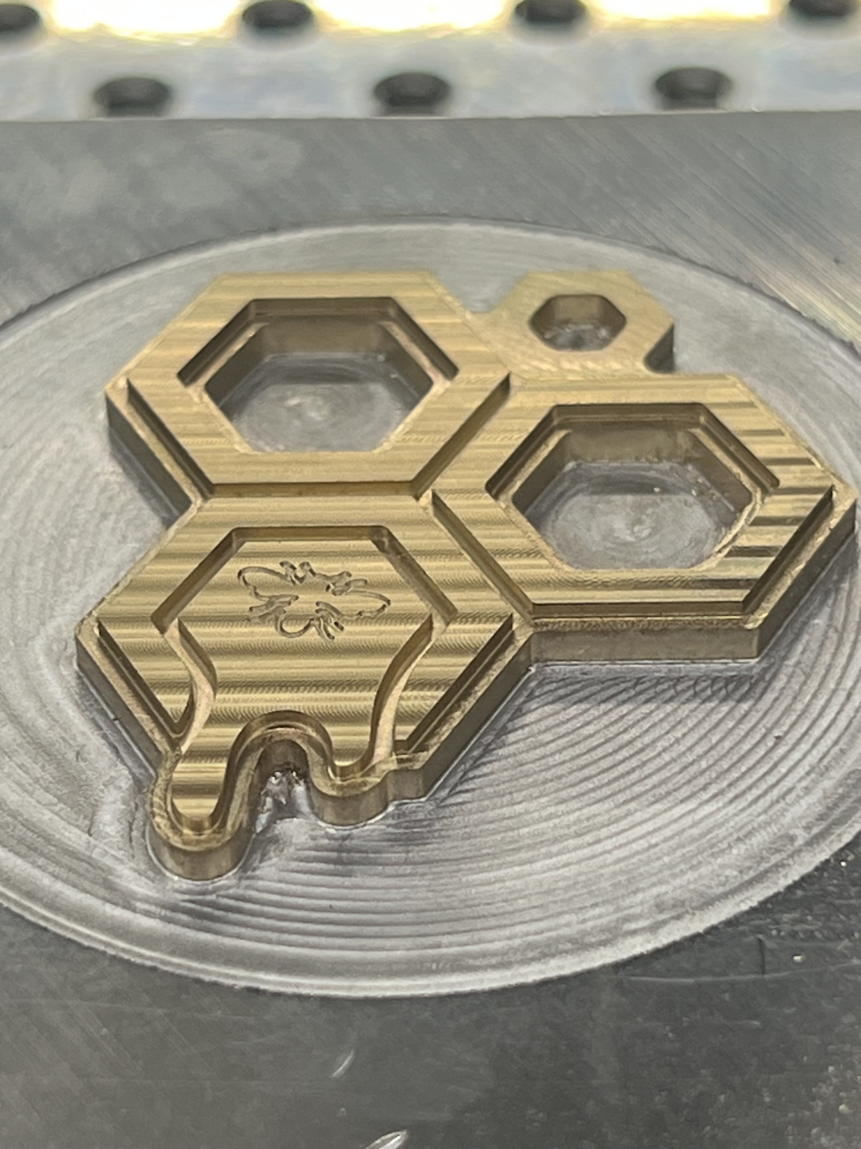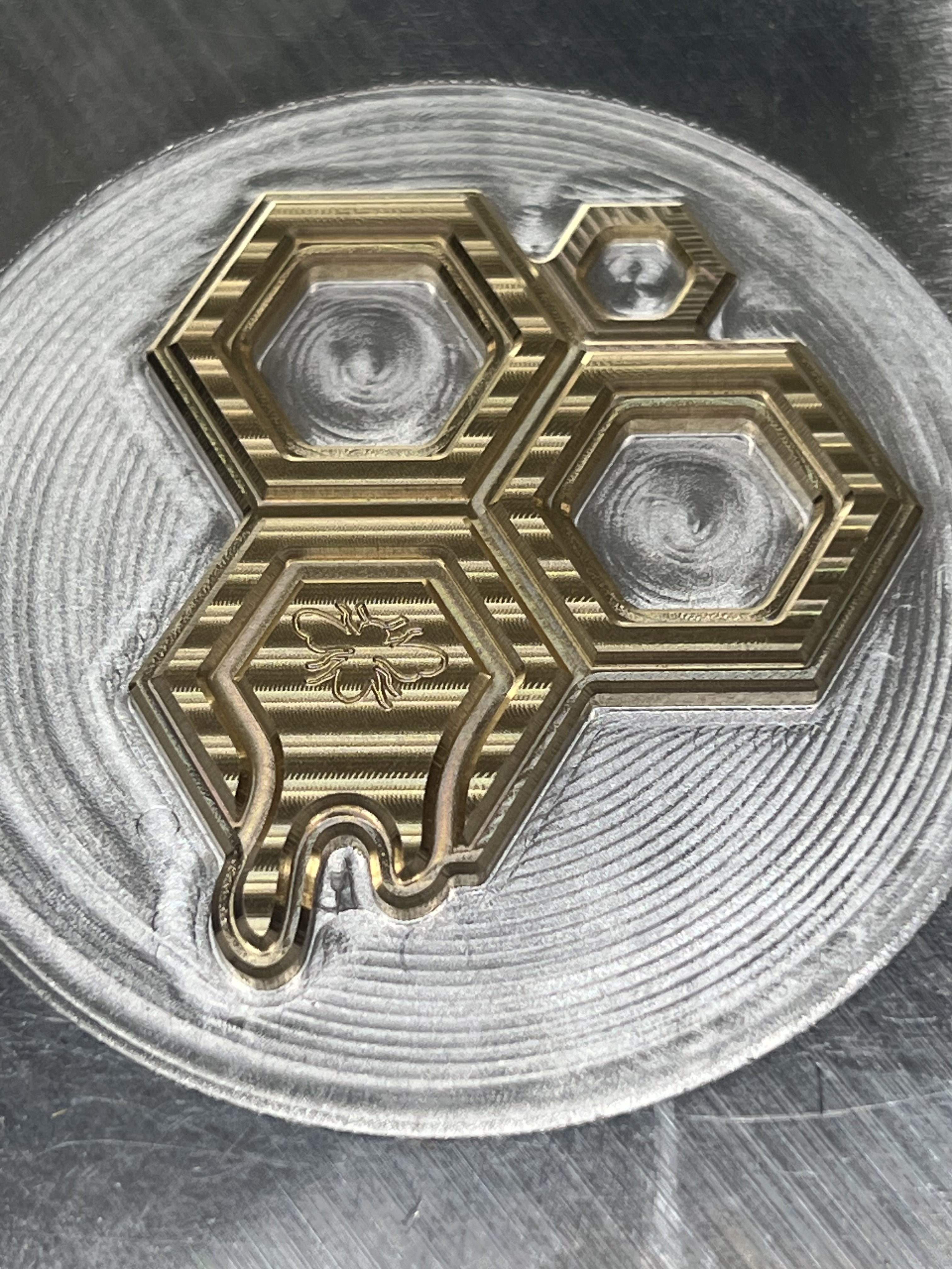 The intention of the bee engraving was to go deep enough that the nickel plating would stick around when I lapped the top surface. A subtle highlight to the engraving surrounded by brass.