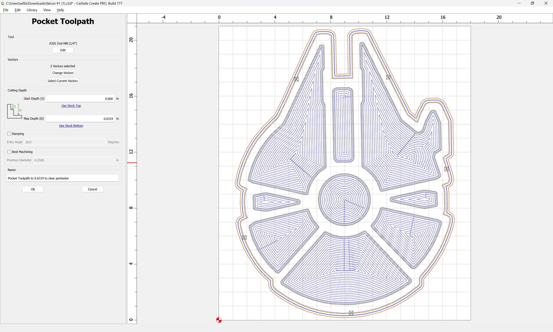 Using a #201 in hardwood the default Depth per Pass is 0.125":