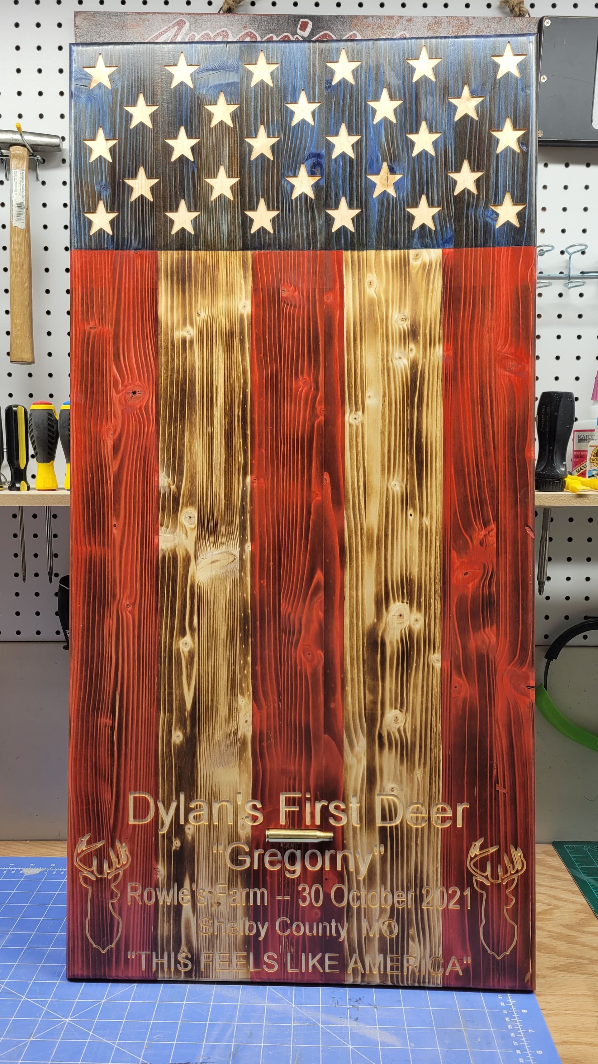 I’ve had my Shapeoko XL for close to a year now and have learned a few things through a lot of trial and error. Here are a couple pictures of some of my latest projects. The Americana design is a personalized deer head mount for my grandson that shot his first deer this season. The black and silver plaque is made of painted aluminum with pocketed lettering. Yes, the Shapeoko XL does carve aluminum very well. I’m having a lot of fun learning this new skill.