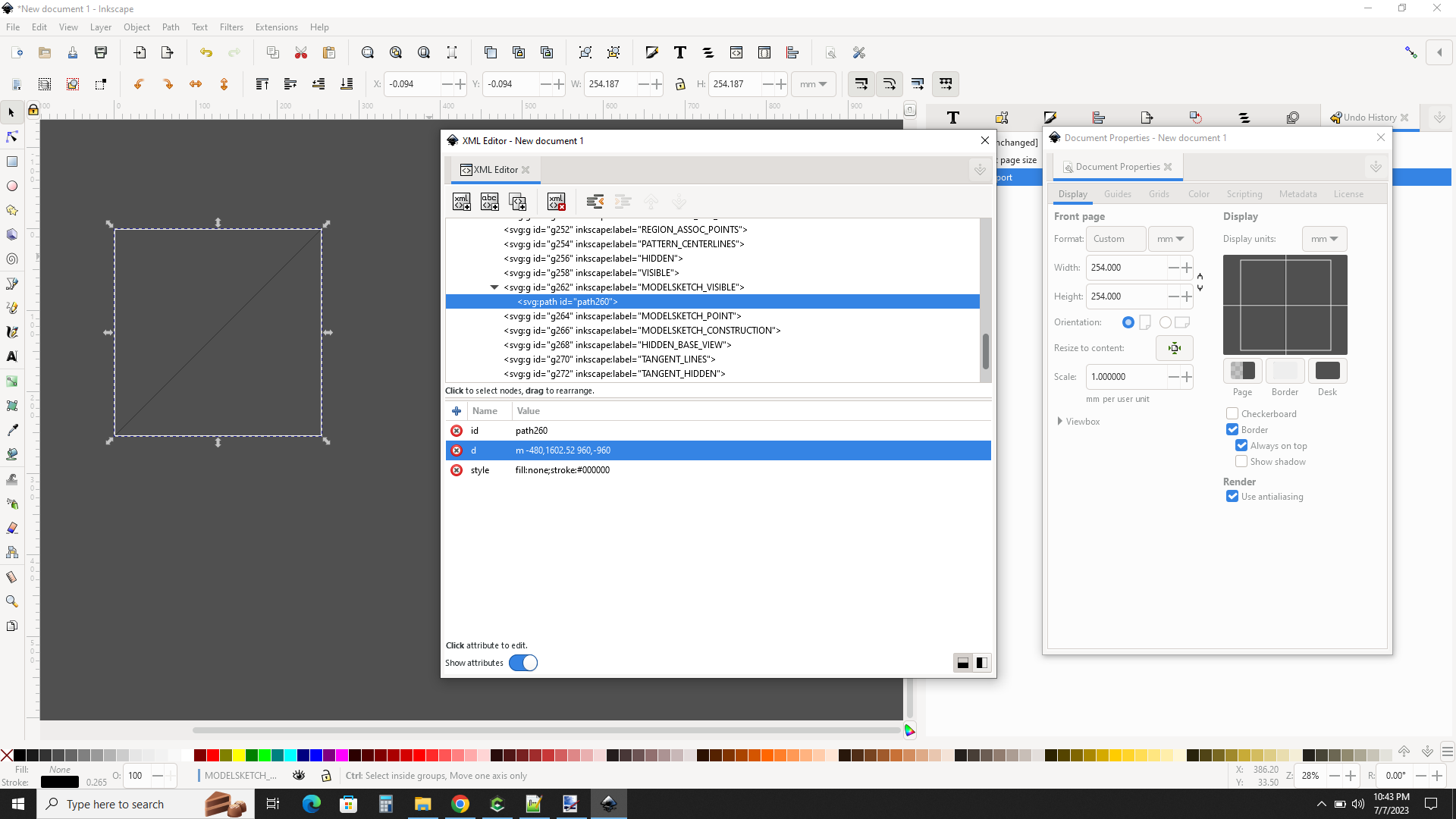 The Document Properties Dialog on the right shows the canvas size
