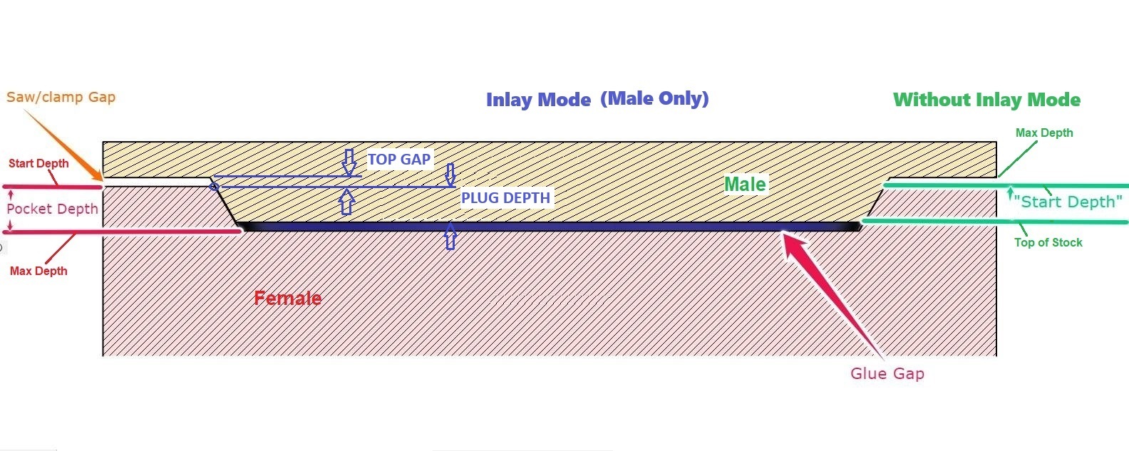 The starting depth of the male side should be zero. If you make the starting point deeper, the V bit will go too deep in the male side, thus causing the plug to be cut deeper. The deeper you cut the male the more pointed the top edge of the plug/male side. This will reduce your glue gap, or even completely eliminate it altogether.