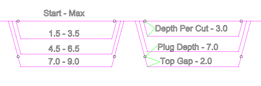 This is the difference between the old method using Start & Max depth, and the new method using Plug Depth & Top Gap. The small circles are the vectors on the top surface, and the vectors projected to the start depth or plug depth. 7.0 in this example.