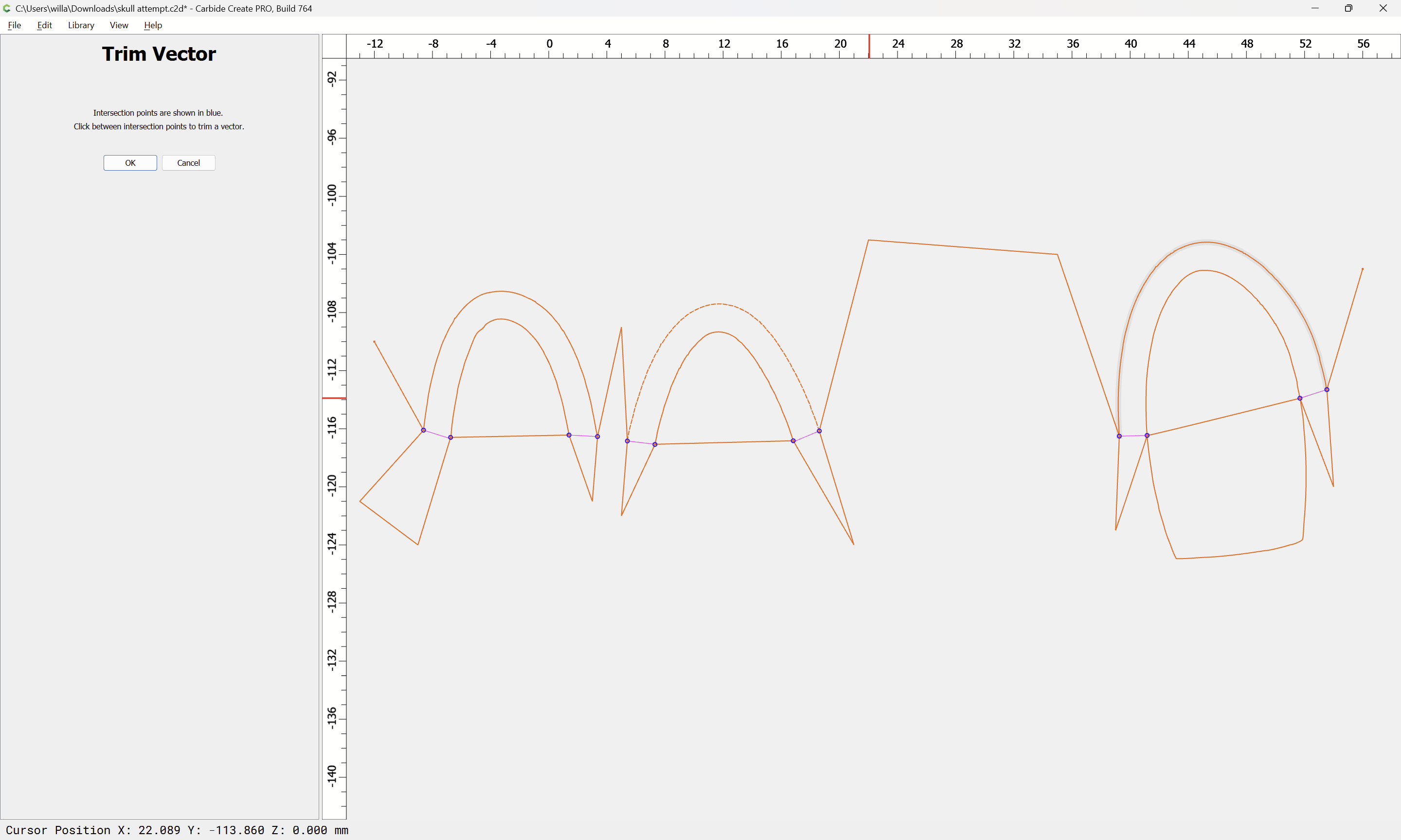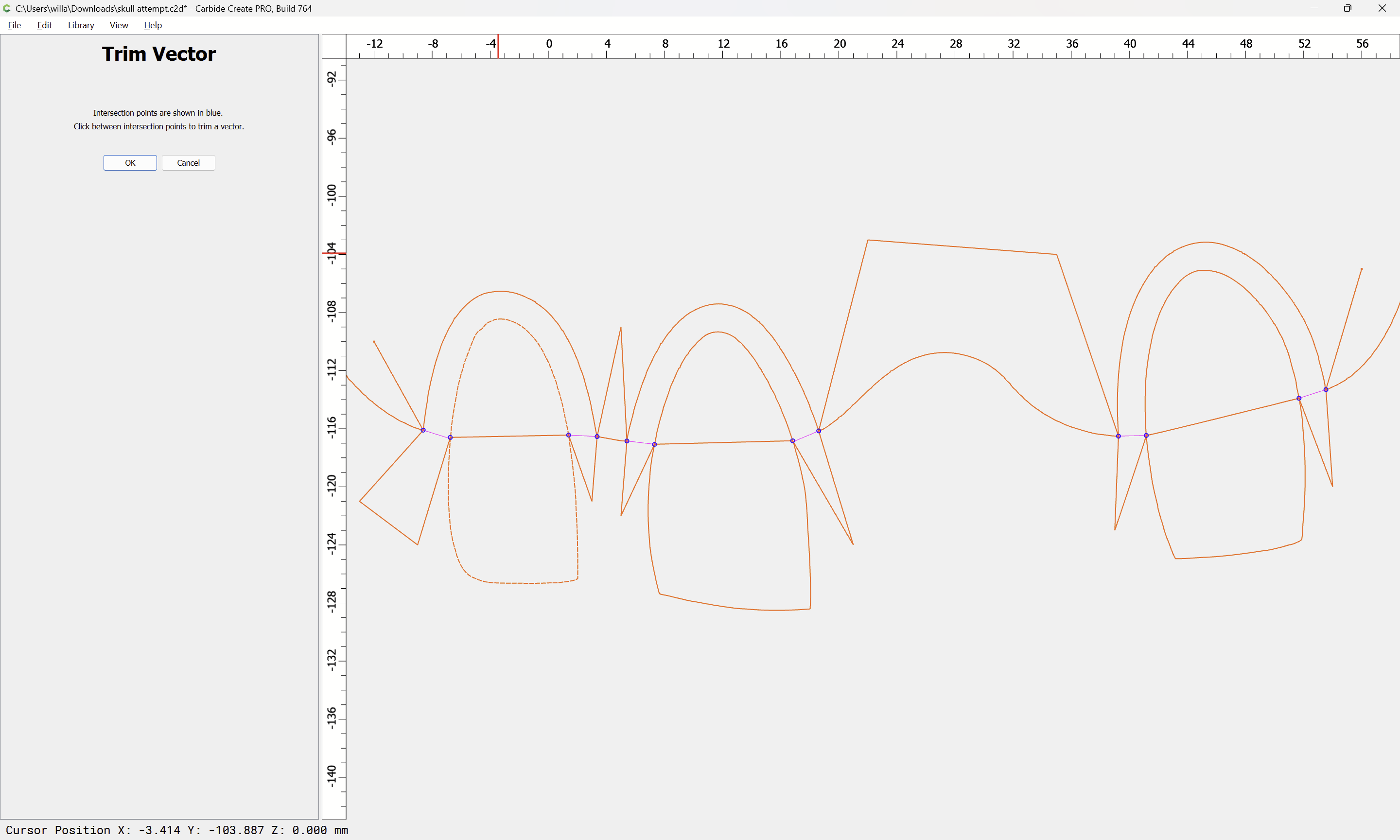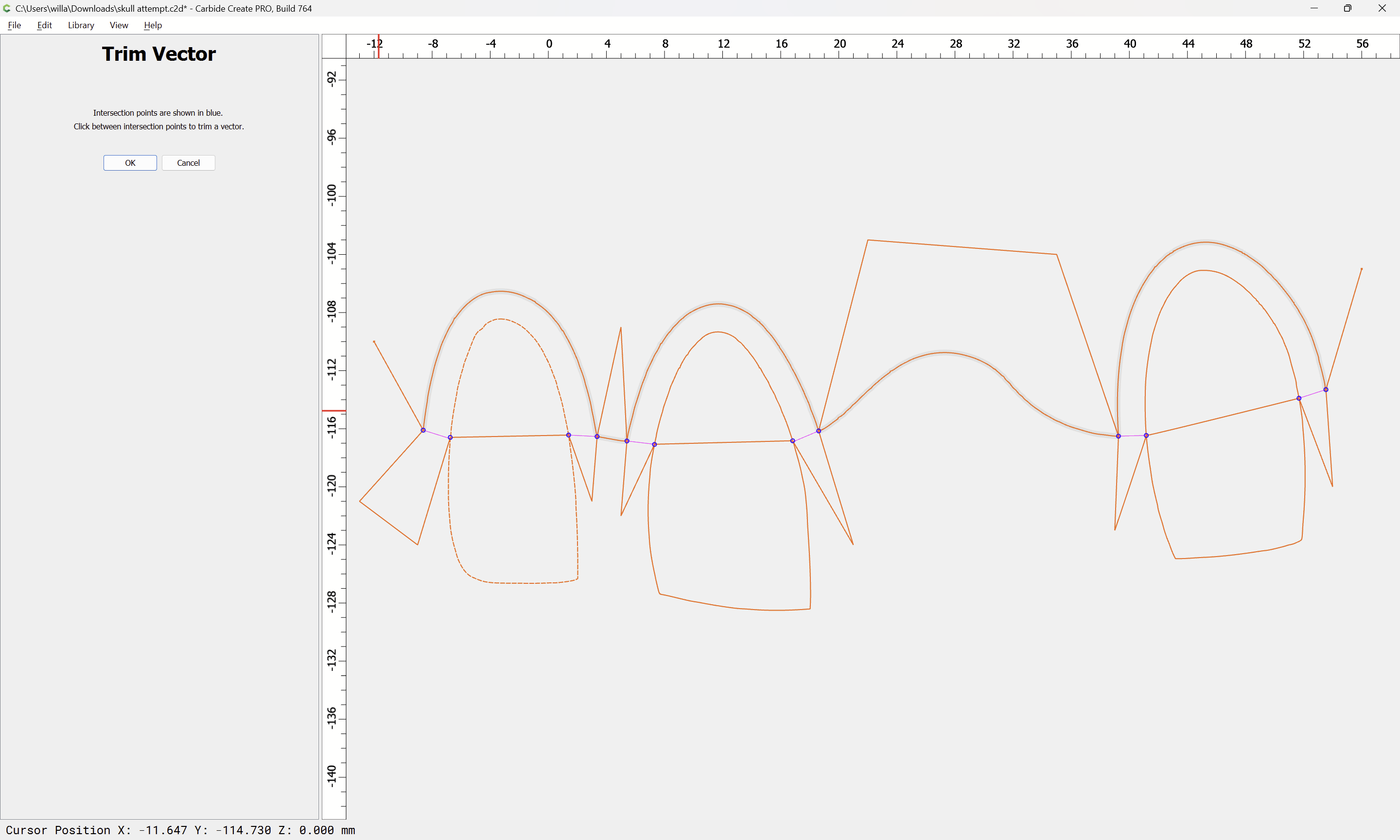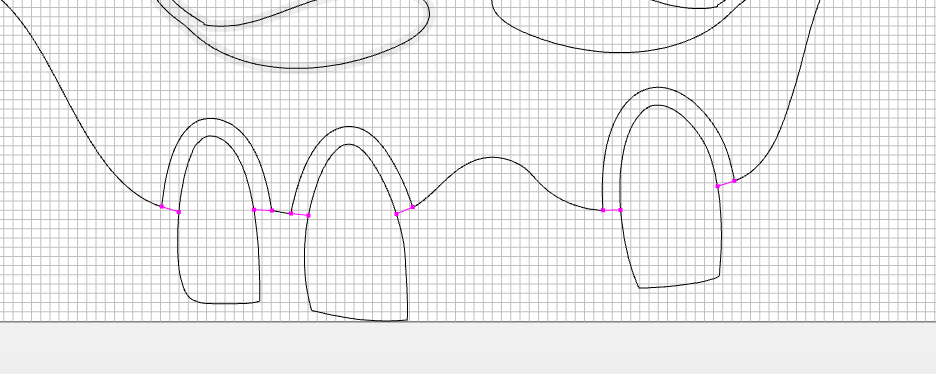 If I make an offset vector end mill width around the outside features to use as a full surround contour. Then contour around each tooth I don’t need vectors for the gums actually. Yup, thanks. I still wish I knew why I can join some vectors and not others.