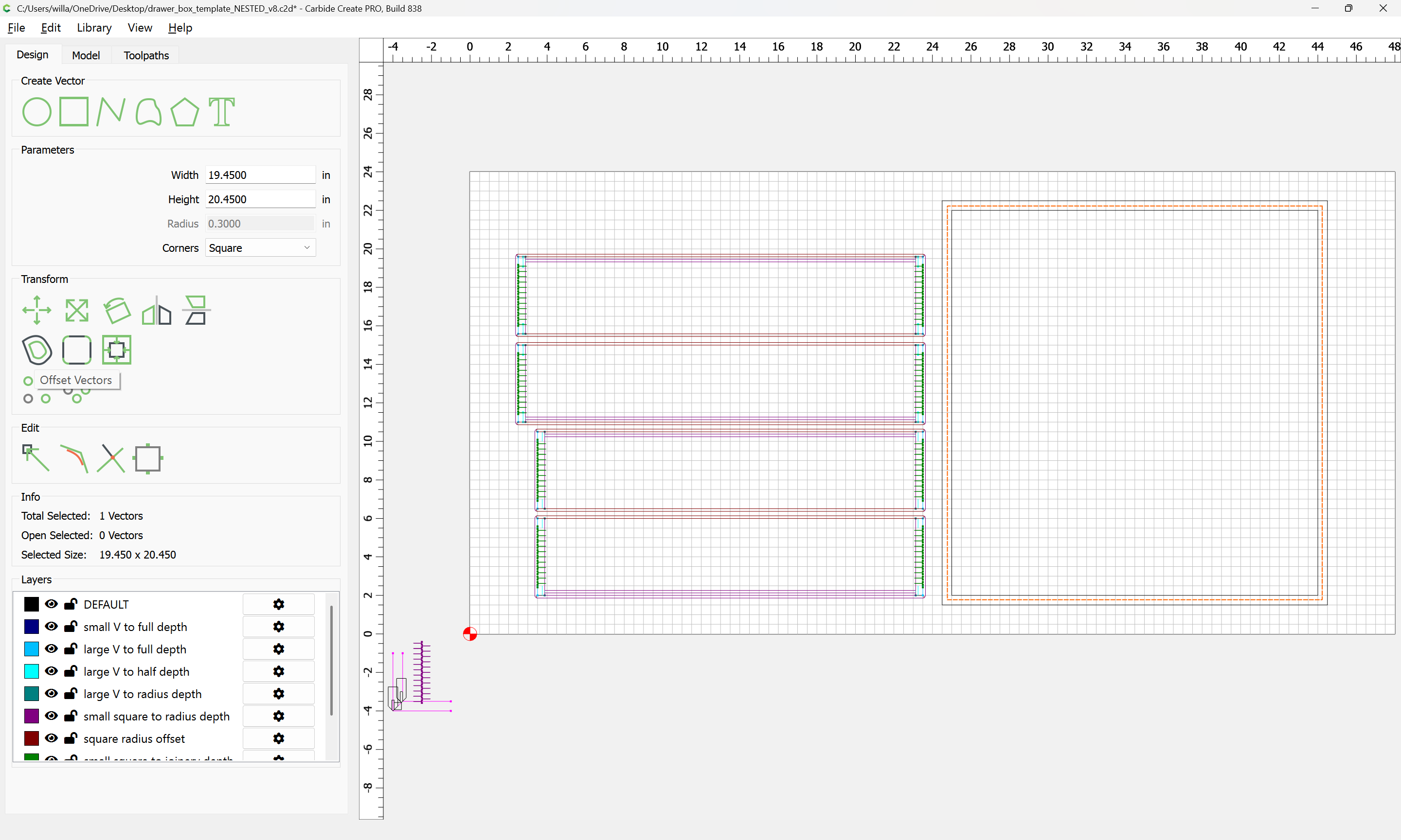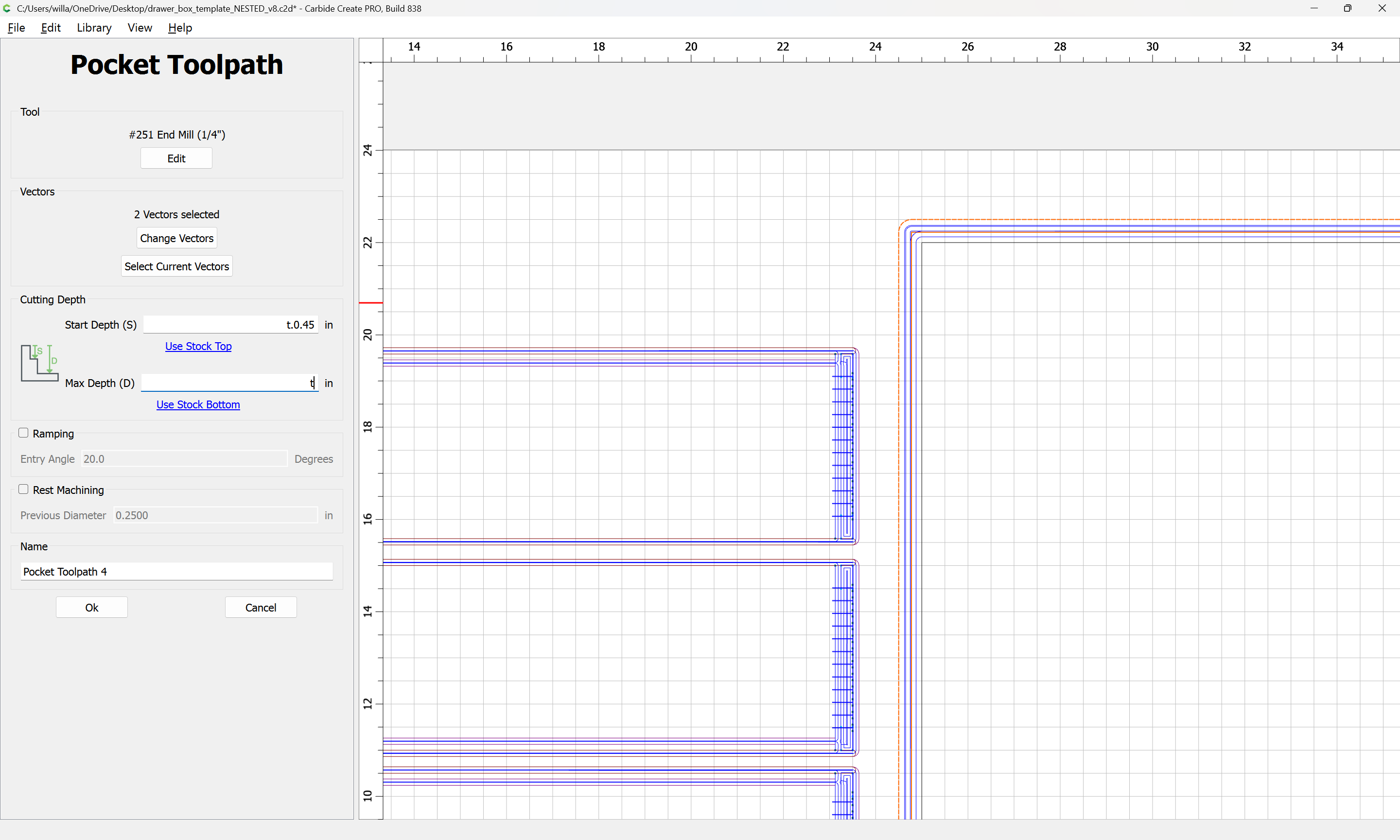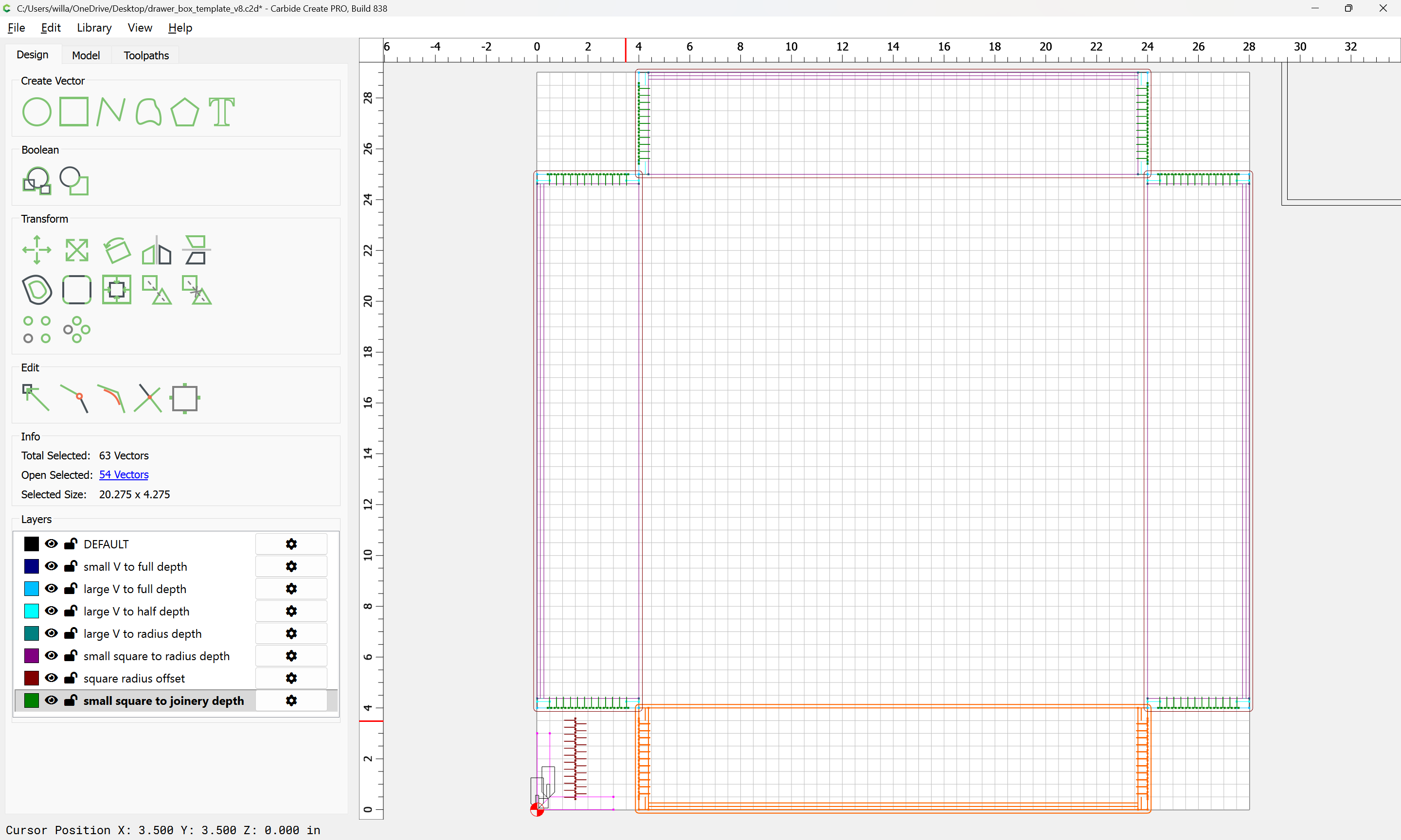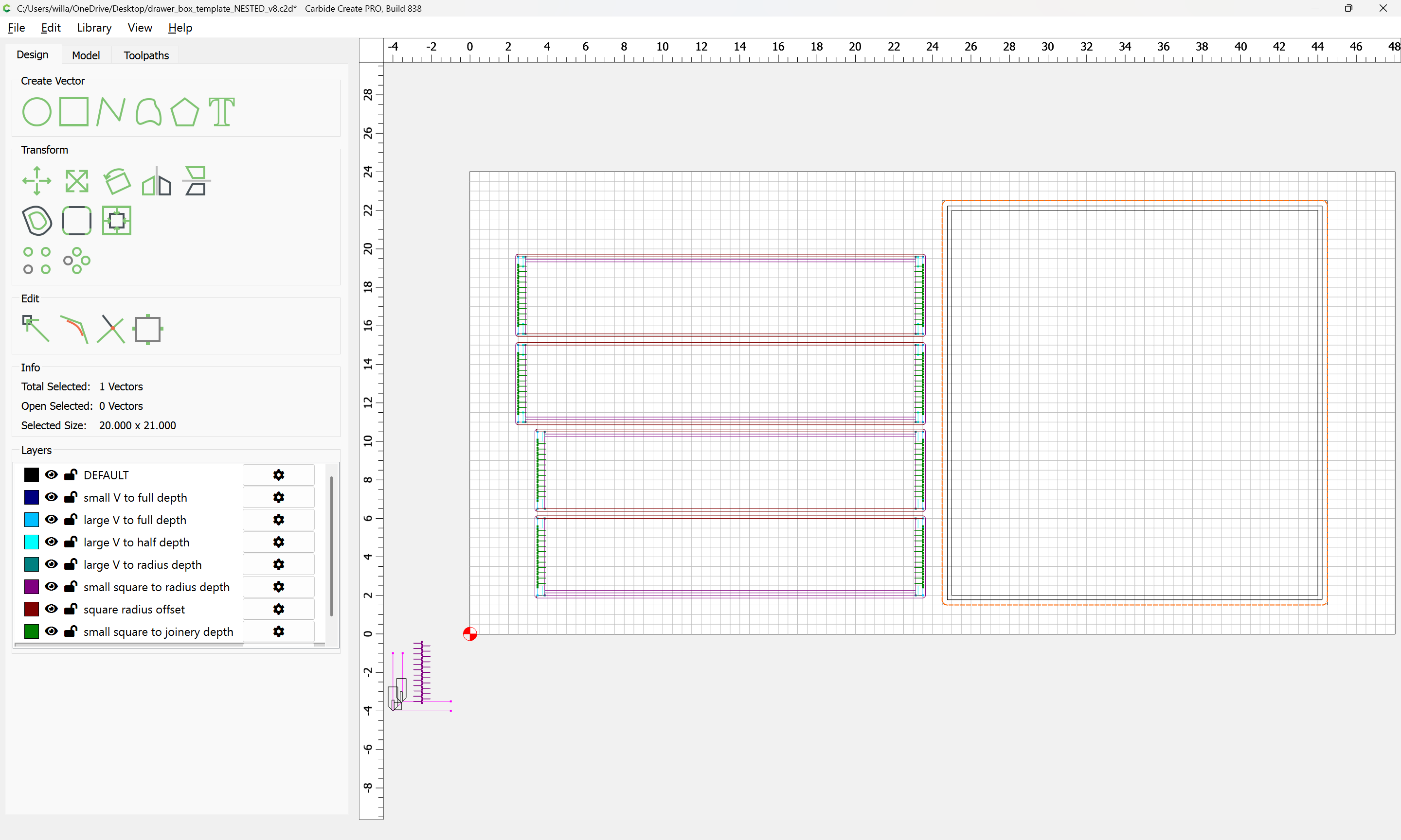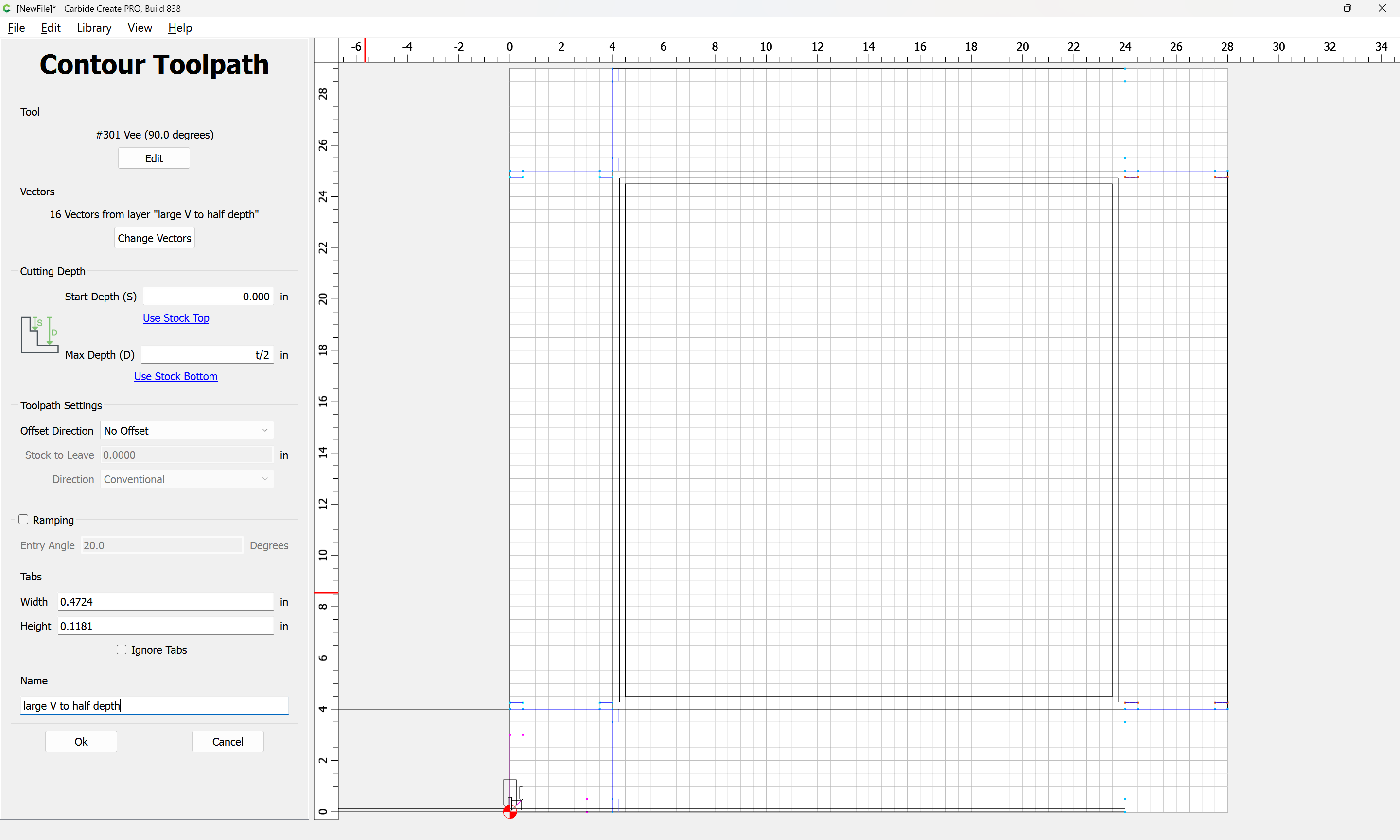 Lastly, the toolpaths will need to be arranged and ordered adjust for optimal material removal — in particular, the small V to full depth toolpath should be cut last and may have its Start Depth set to the bottom of the joinery depth toolpath.