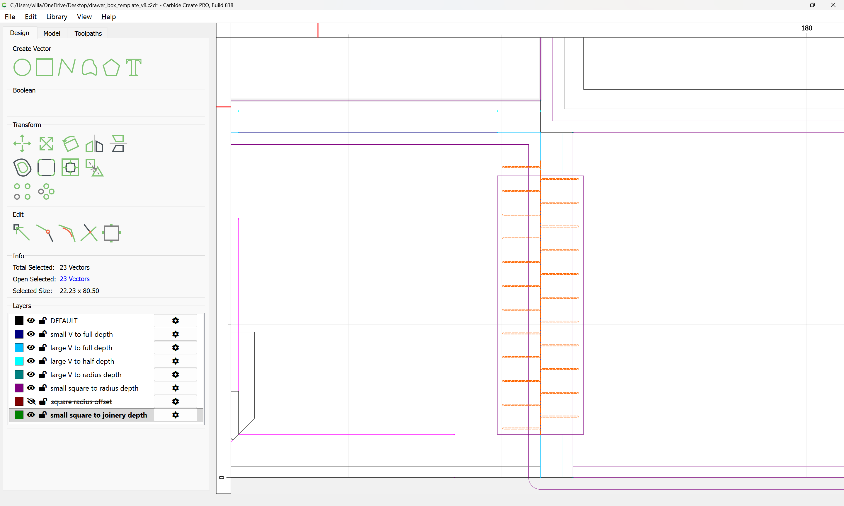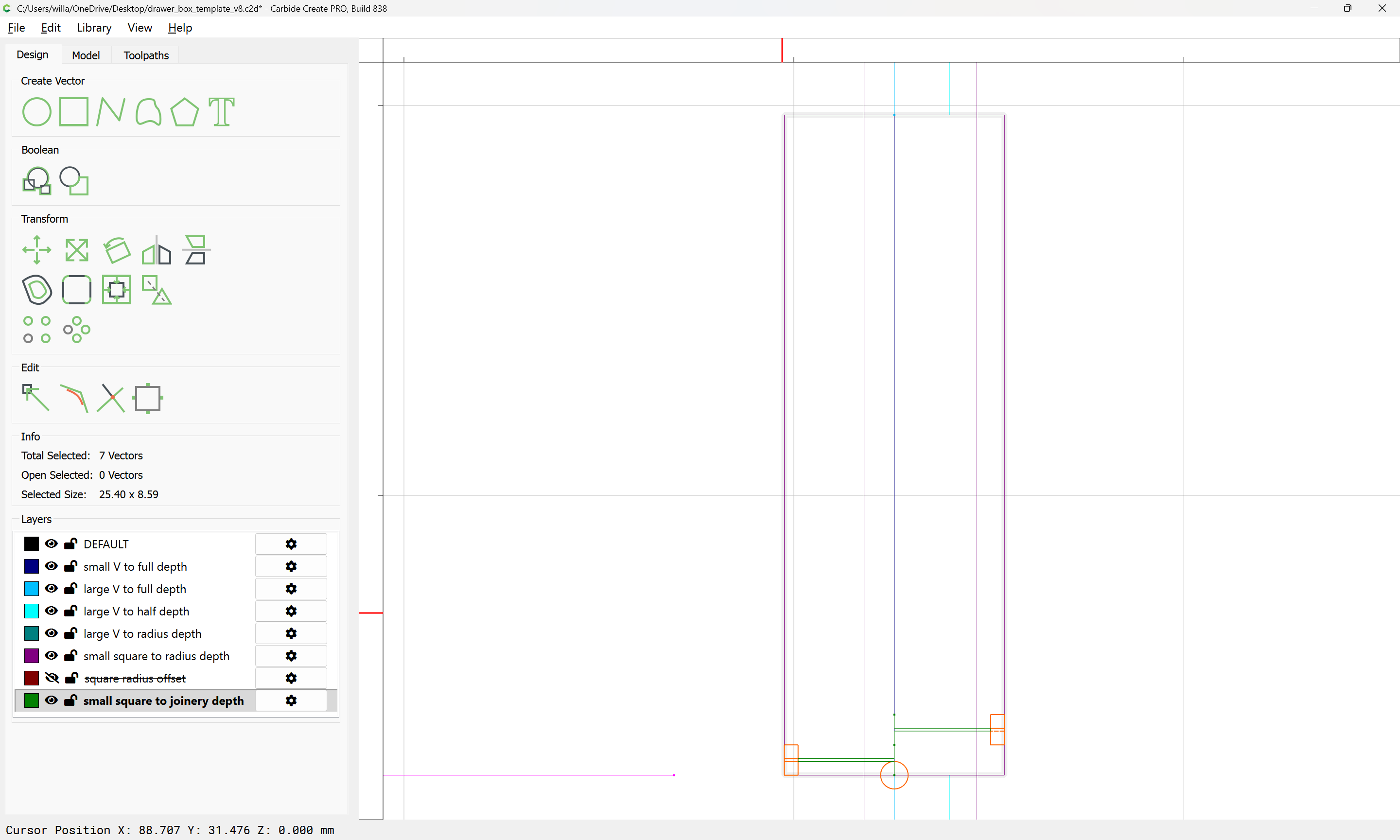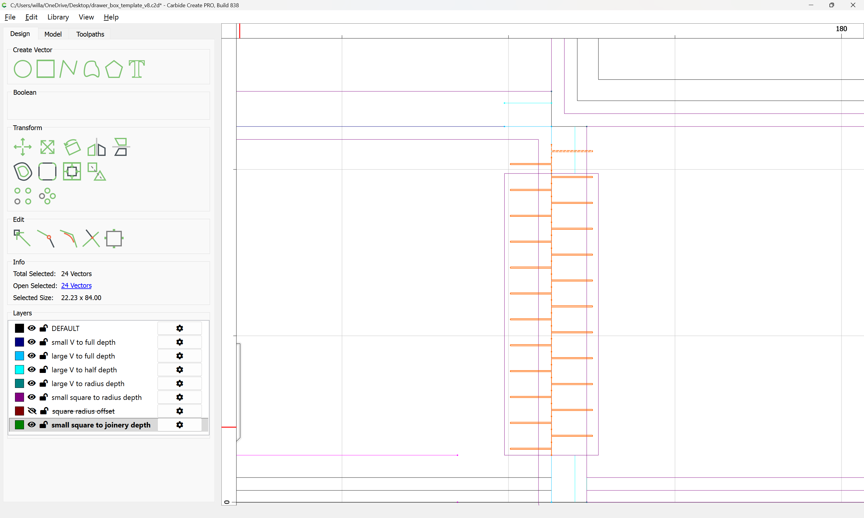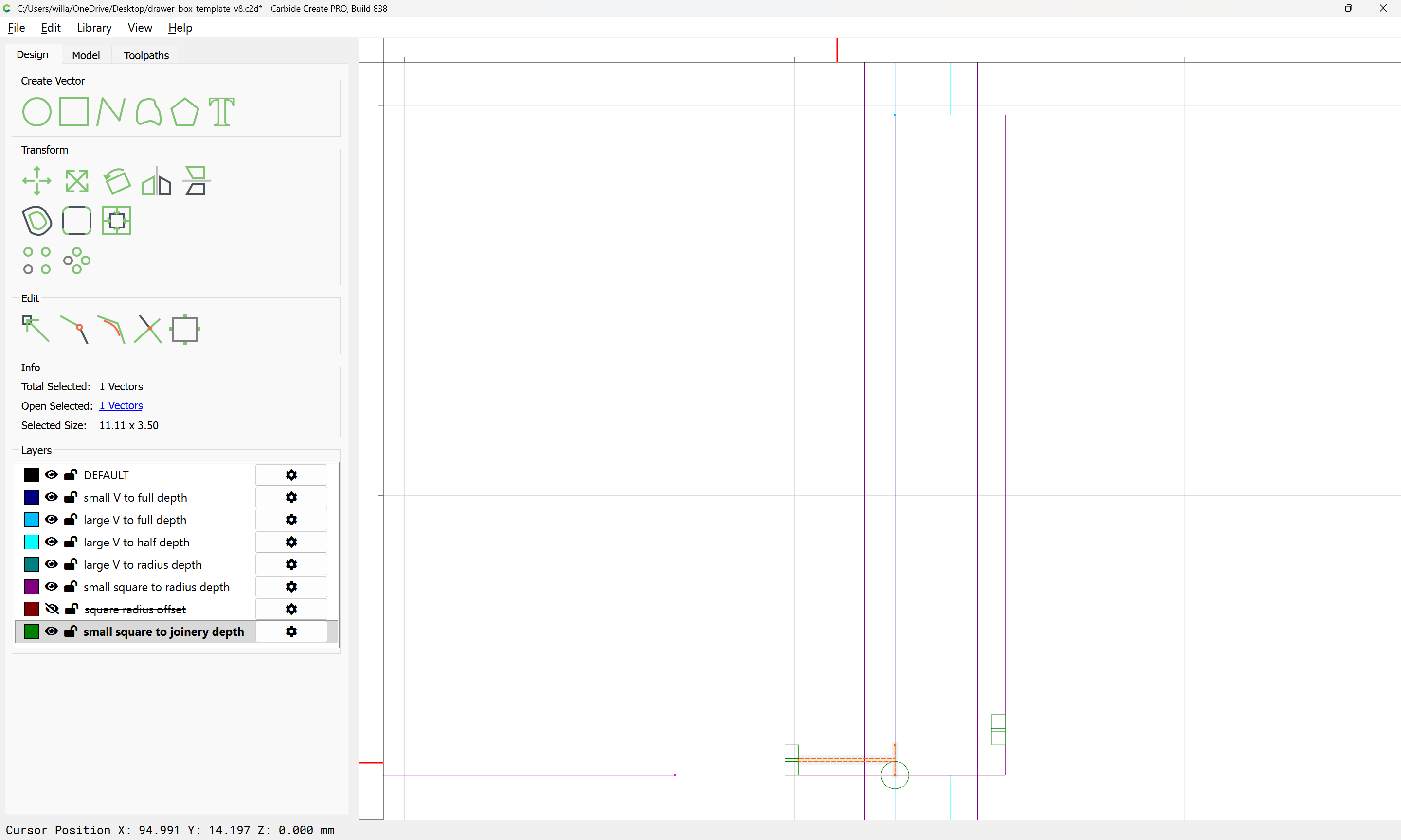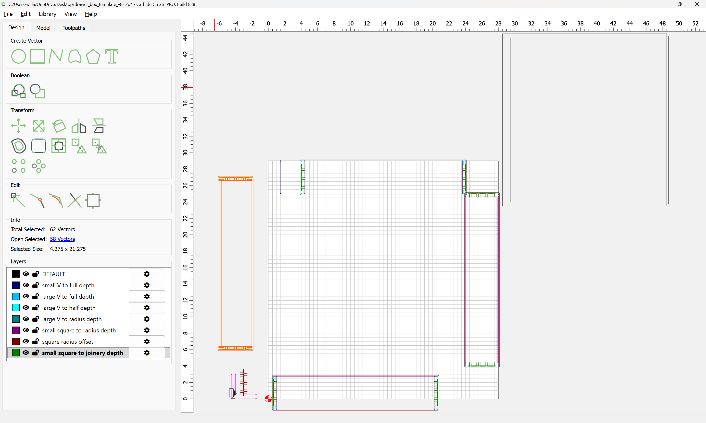 Lastly, the toolpaths will need to be arranged and ordered adjust for optimal material removal — in particular, the small V to full depth toolpath should be cut last and may have its Start Depth set to the bottom of the joinery depth toolpath.