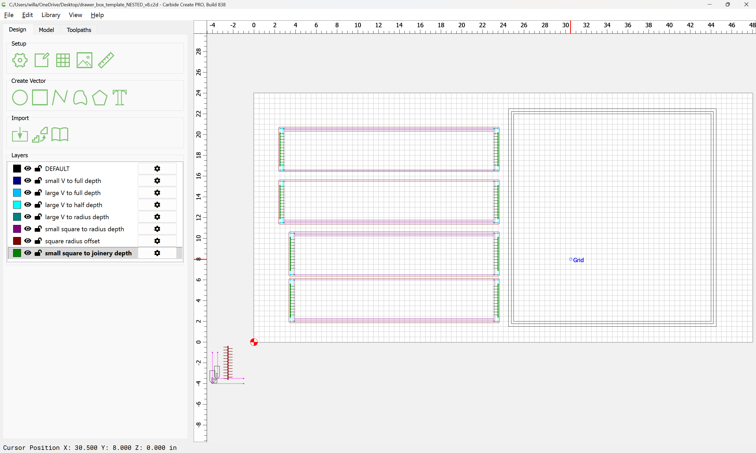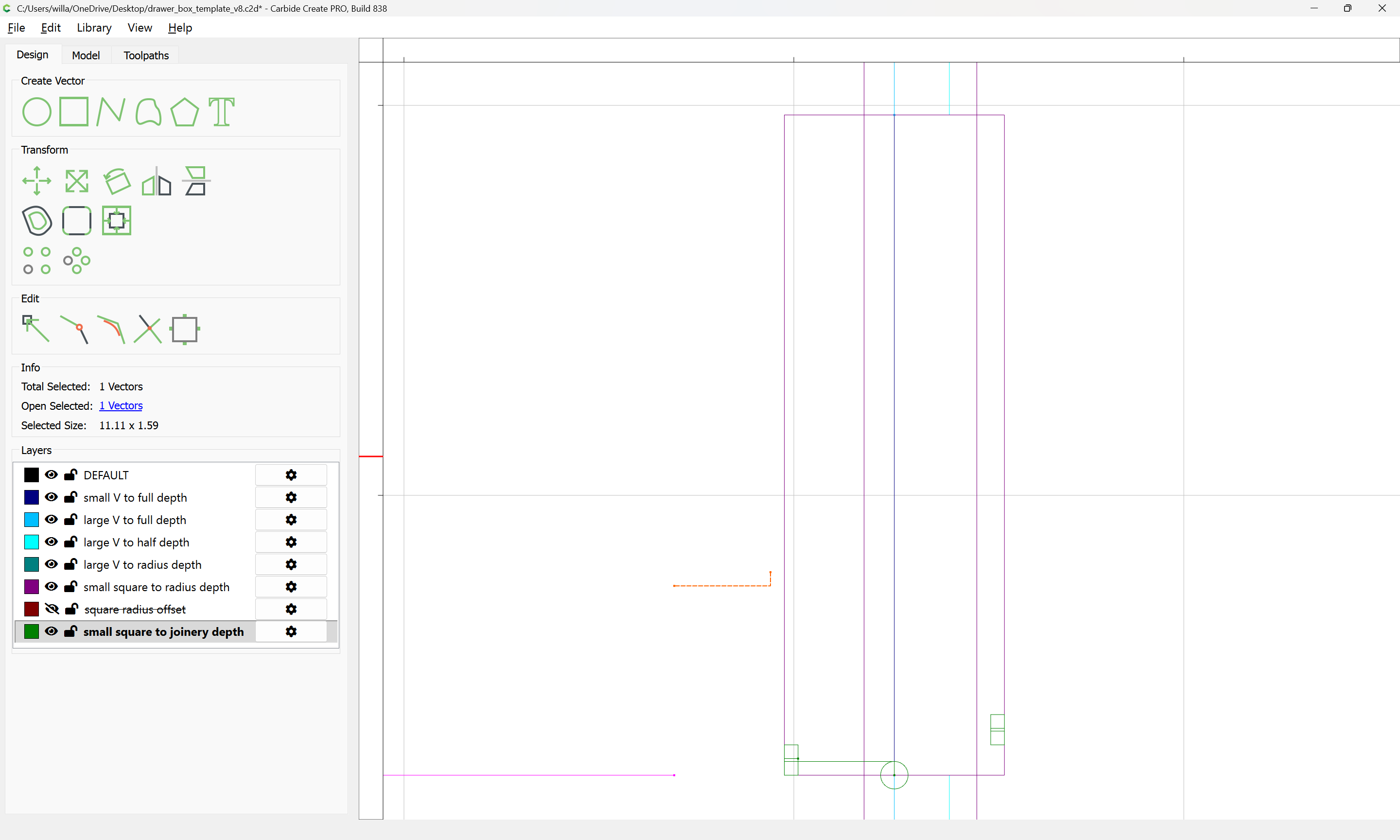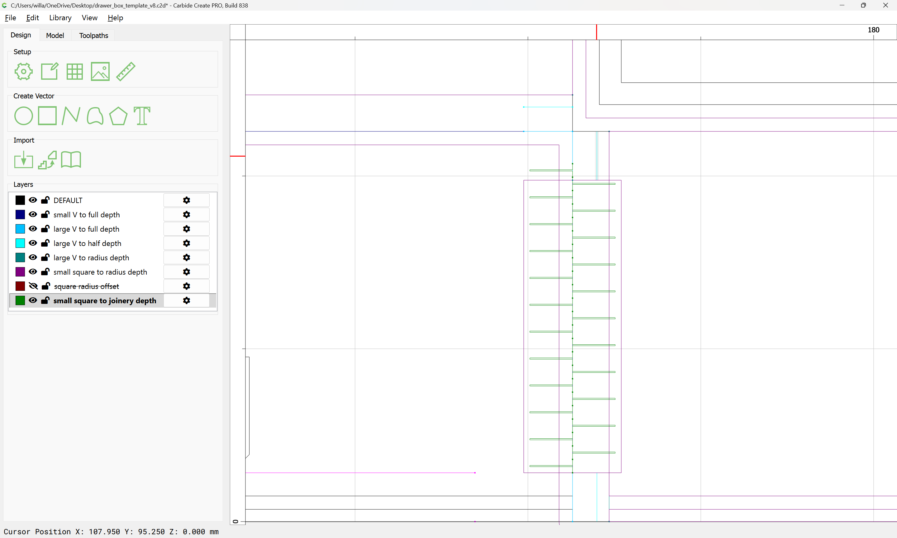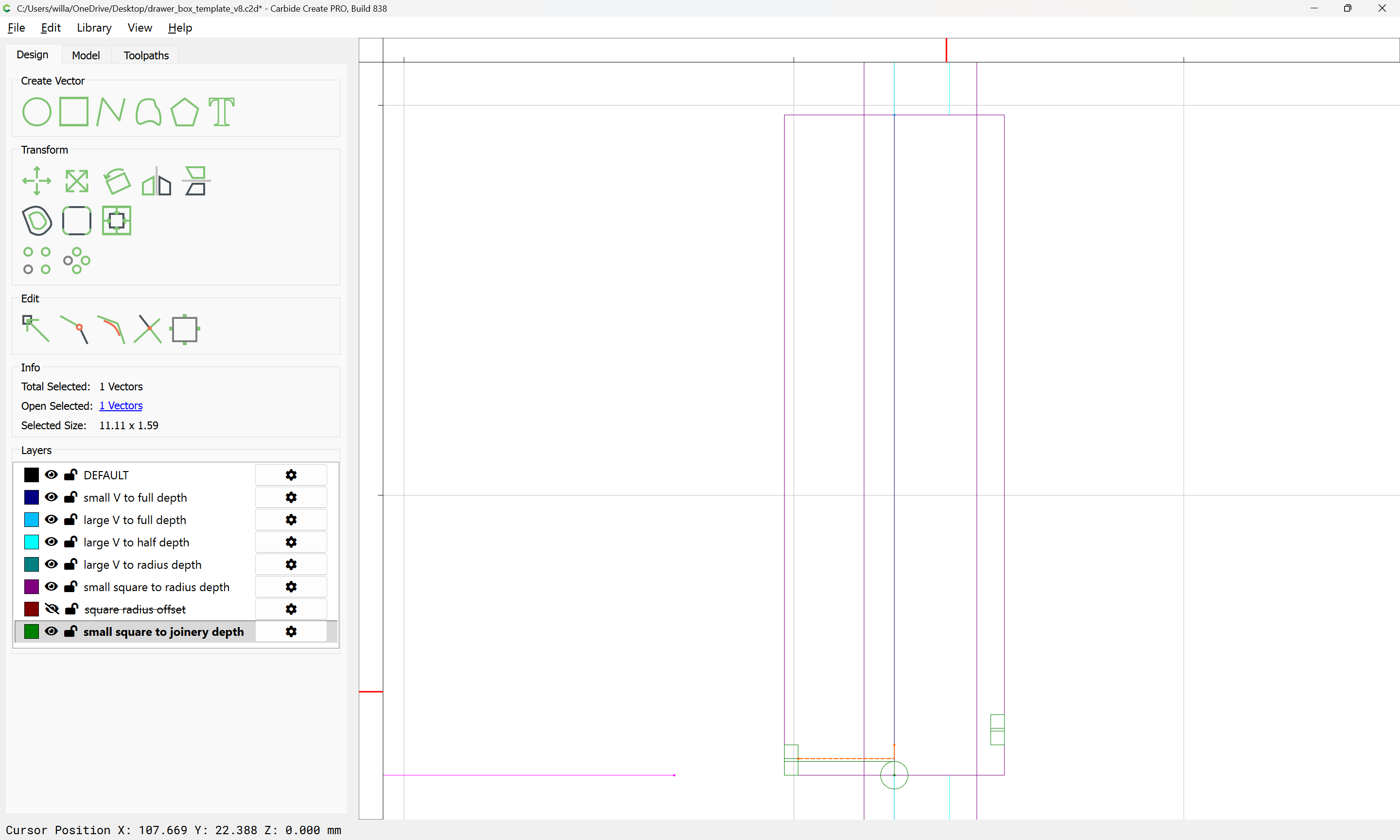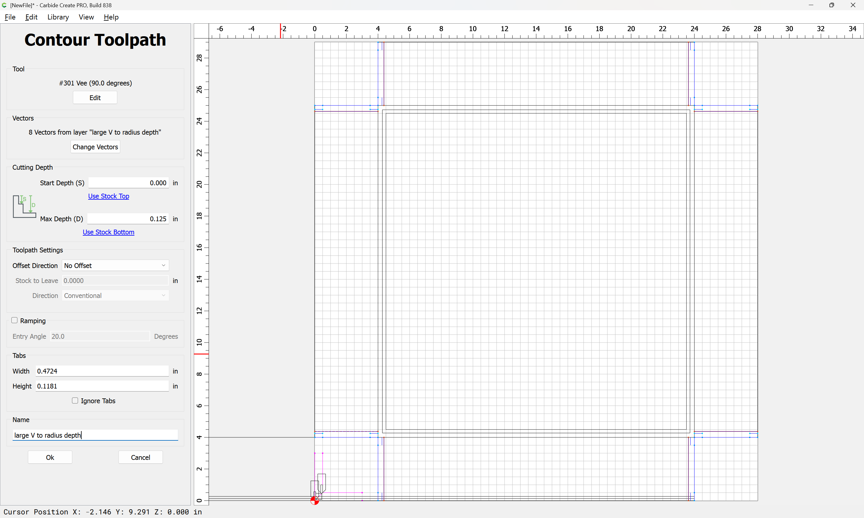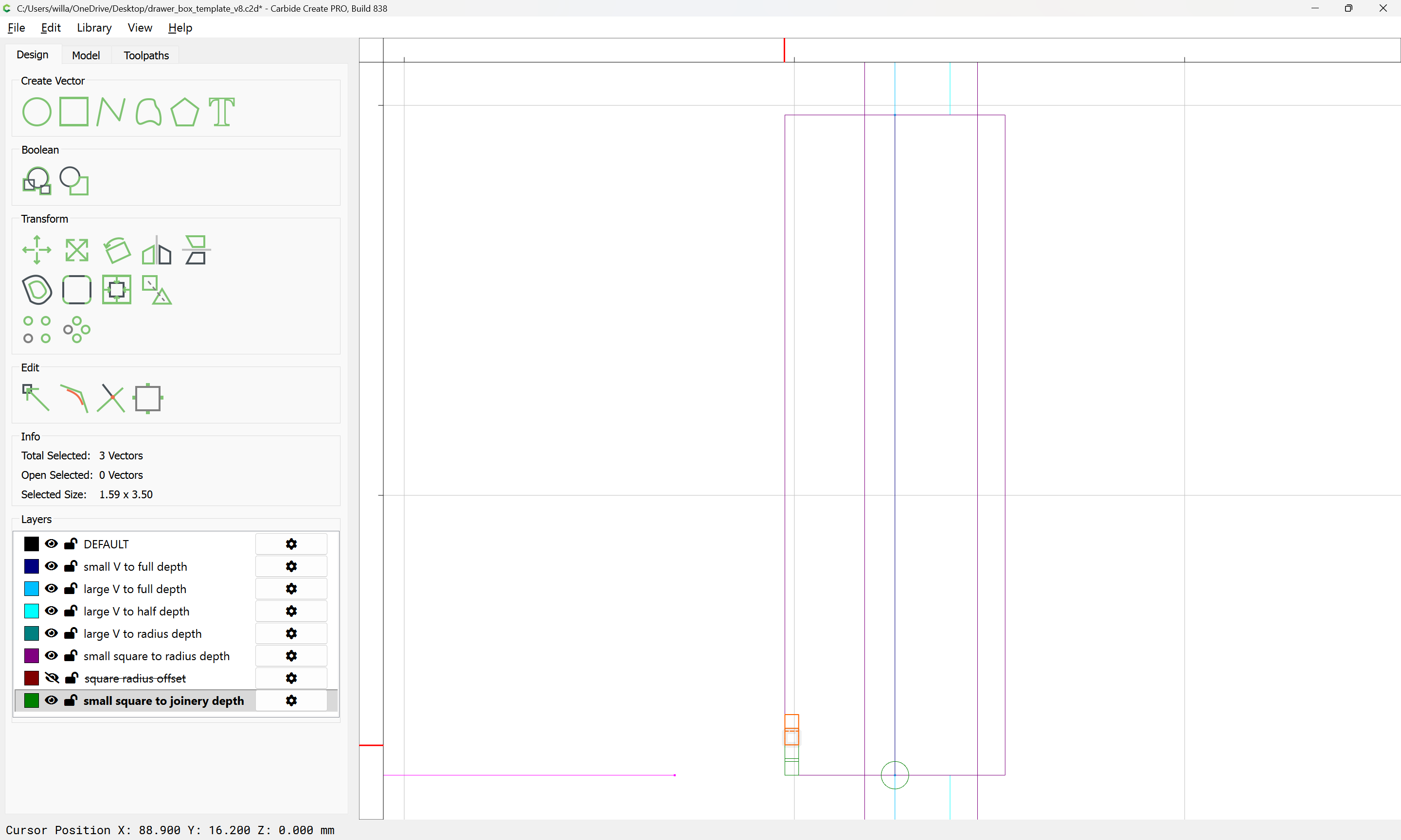 Lastly, the toolpaths will need to be arranged and ordered adjust for optimal material removal — in particular, the small V to full depth toolpath should be cut last and may have its Start Depth set to the bottom of the joinery depth toolpath.