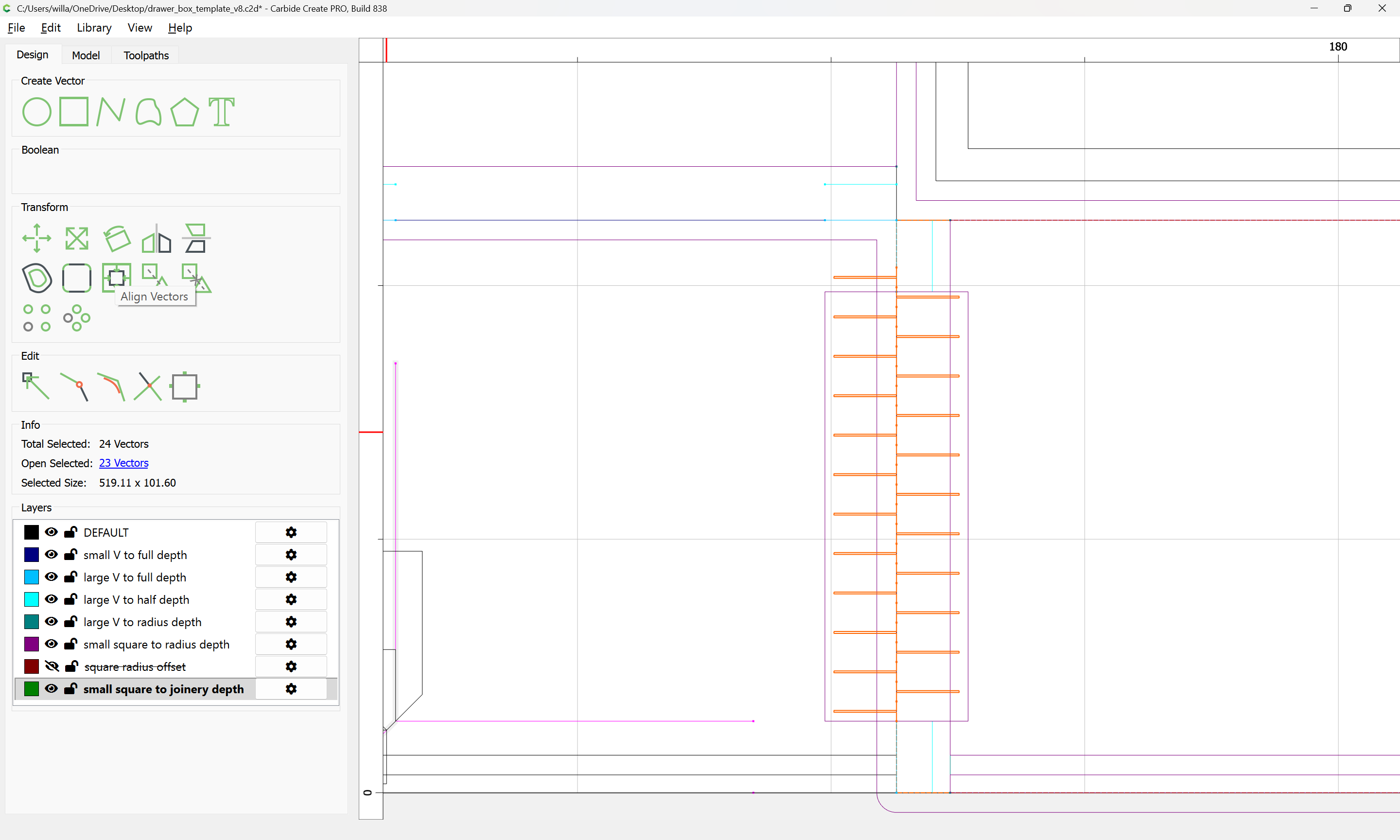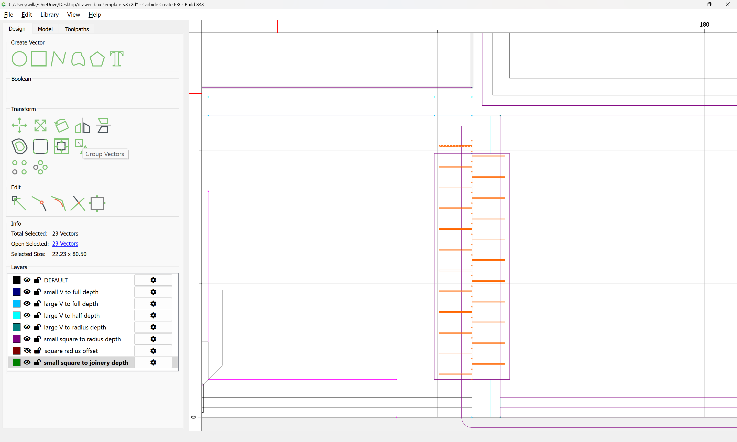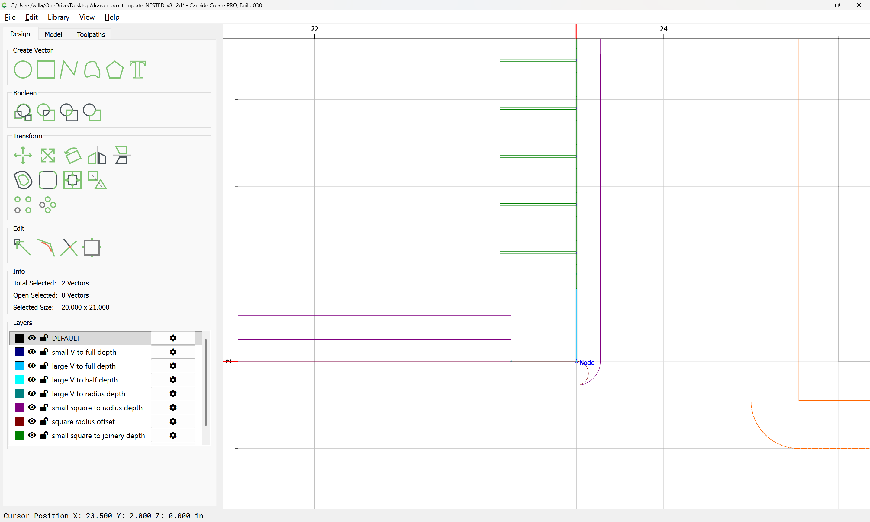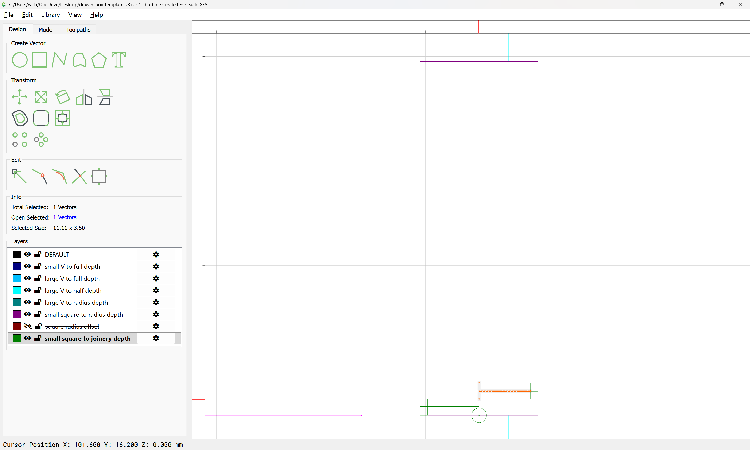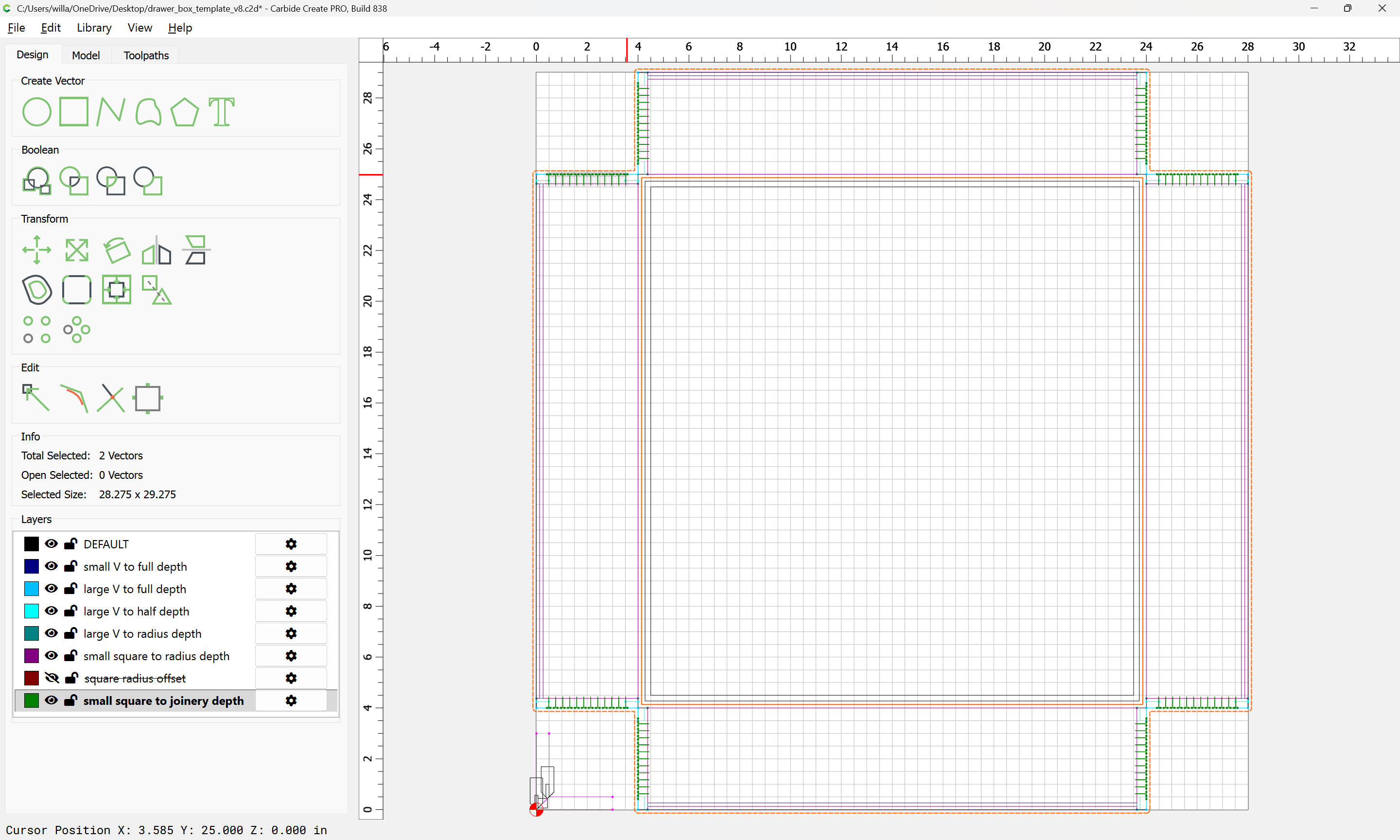 Lastly, the toolpaths will need to be arranged and ordered adjust for optimal material removal — in particular, the small V to full depth toolpath should be cut last and may have its Start Depth set to the bottom of the joinery depth toolpath.