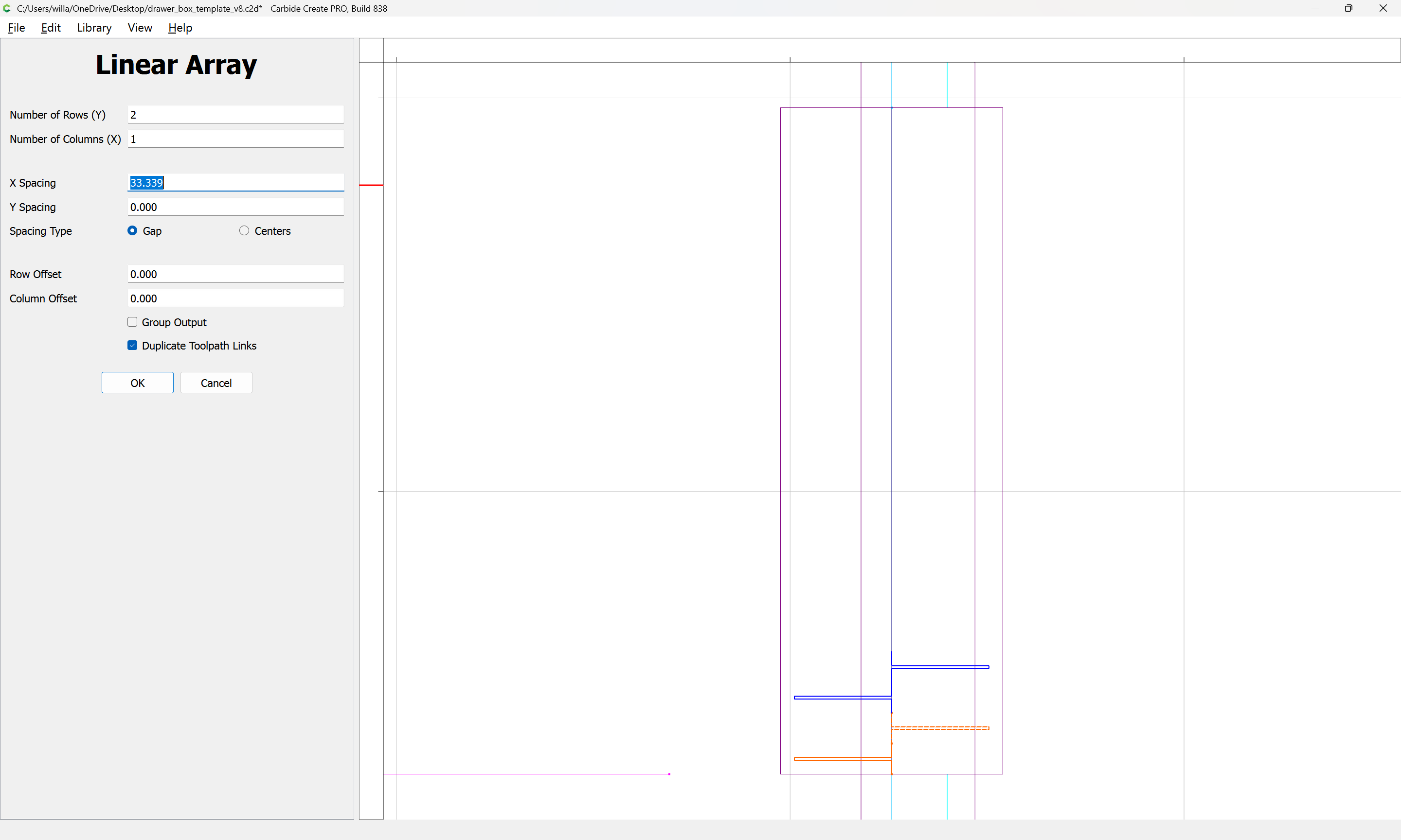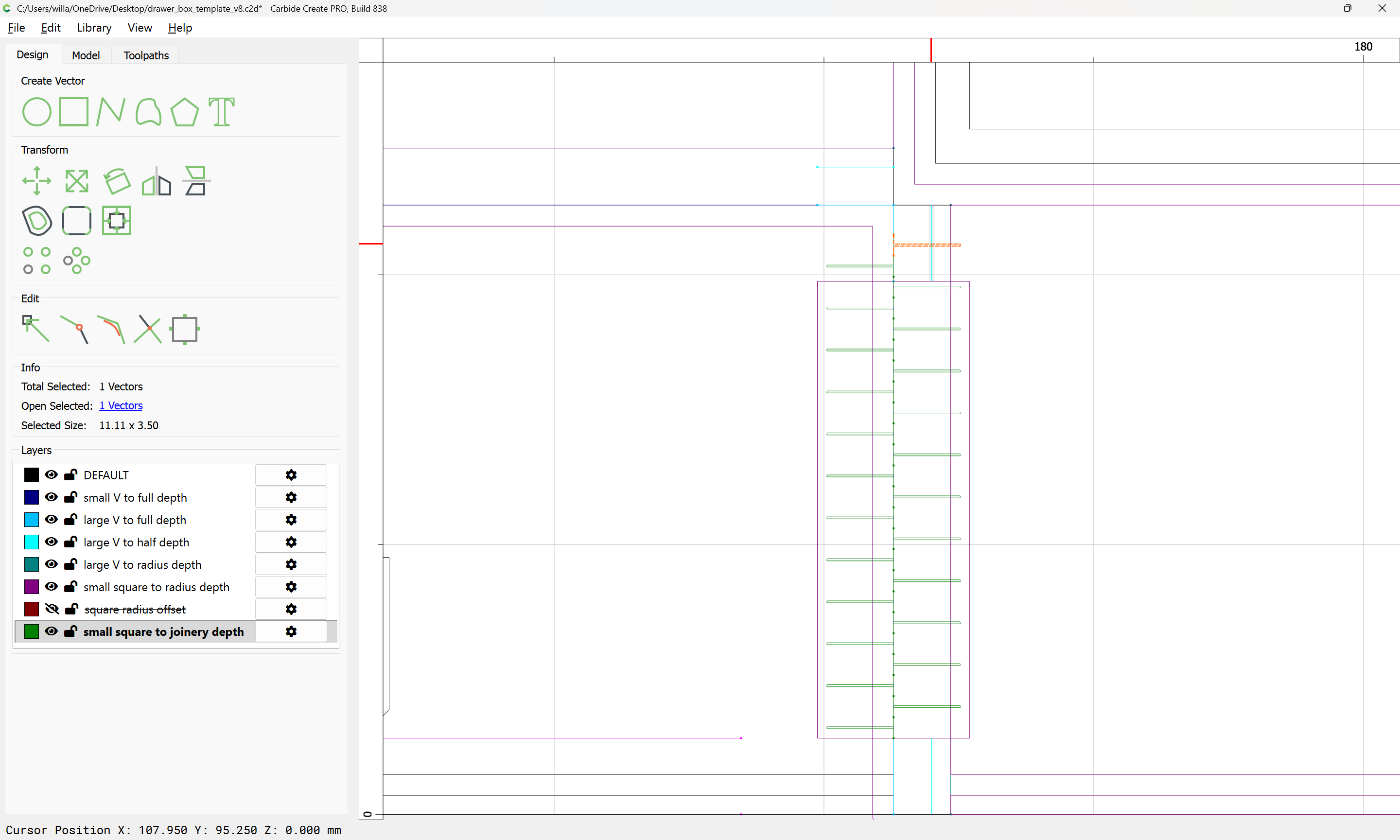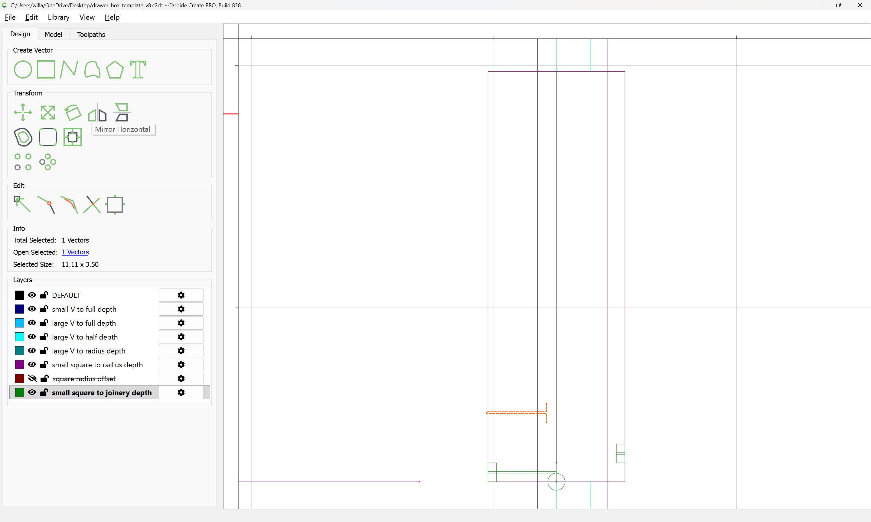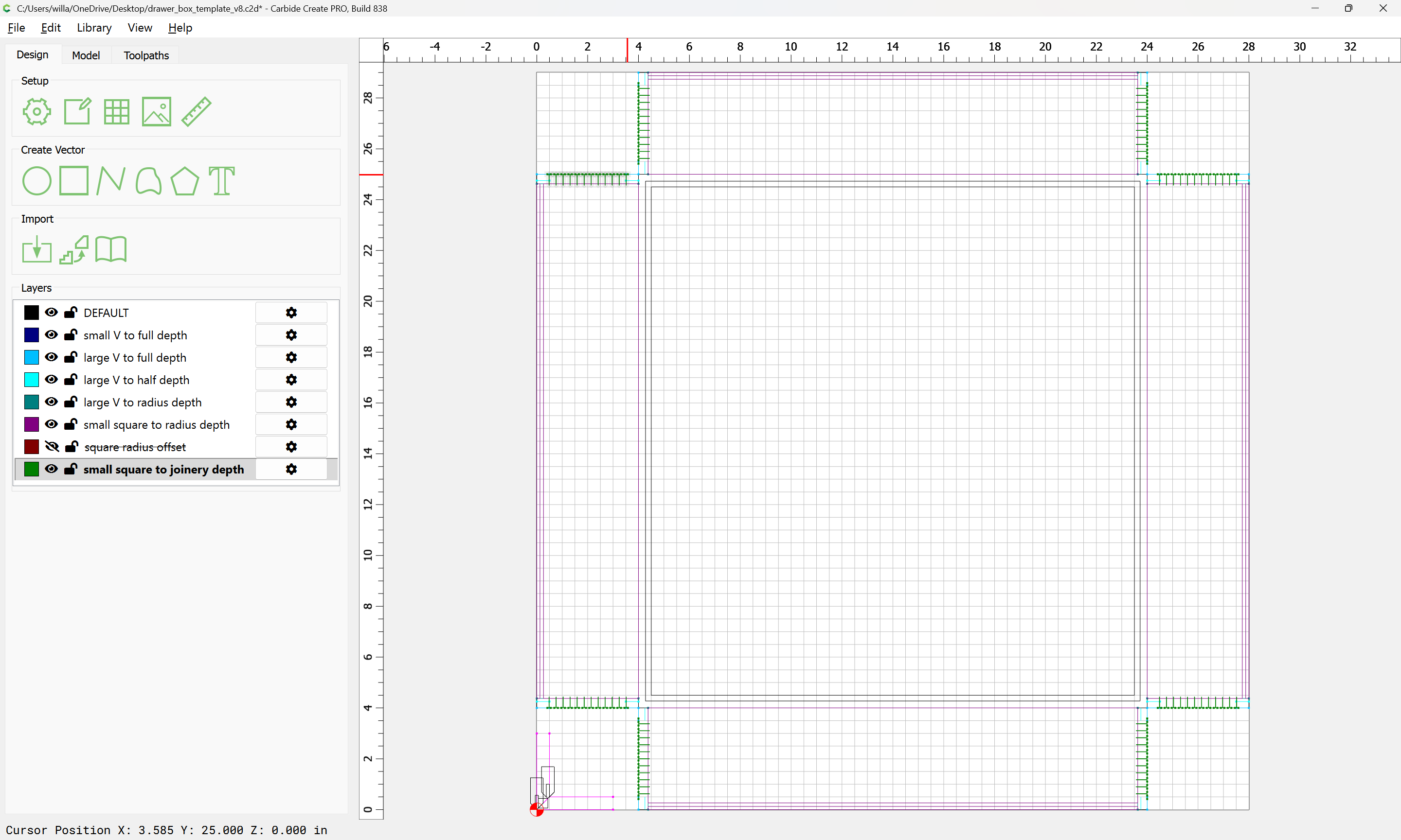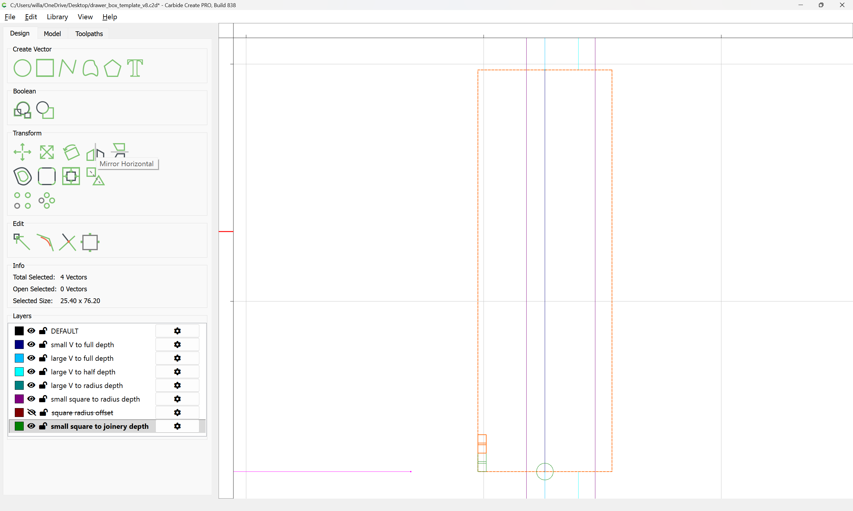 Lastly, the toolpaths will need to be arranged and ordered adjust for optimal material removal — in particular, the small V to full depth toolpath should be cut last and may have its Start Depth set to the bottom of the joinery depth toolpath.