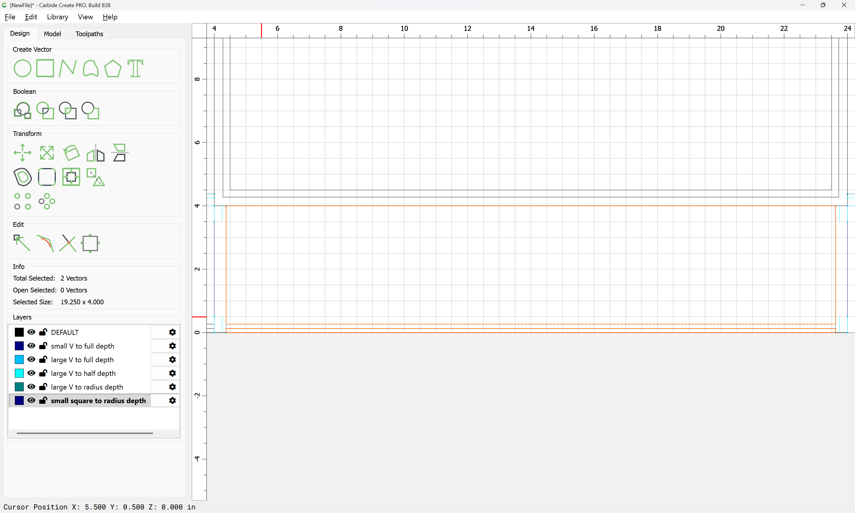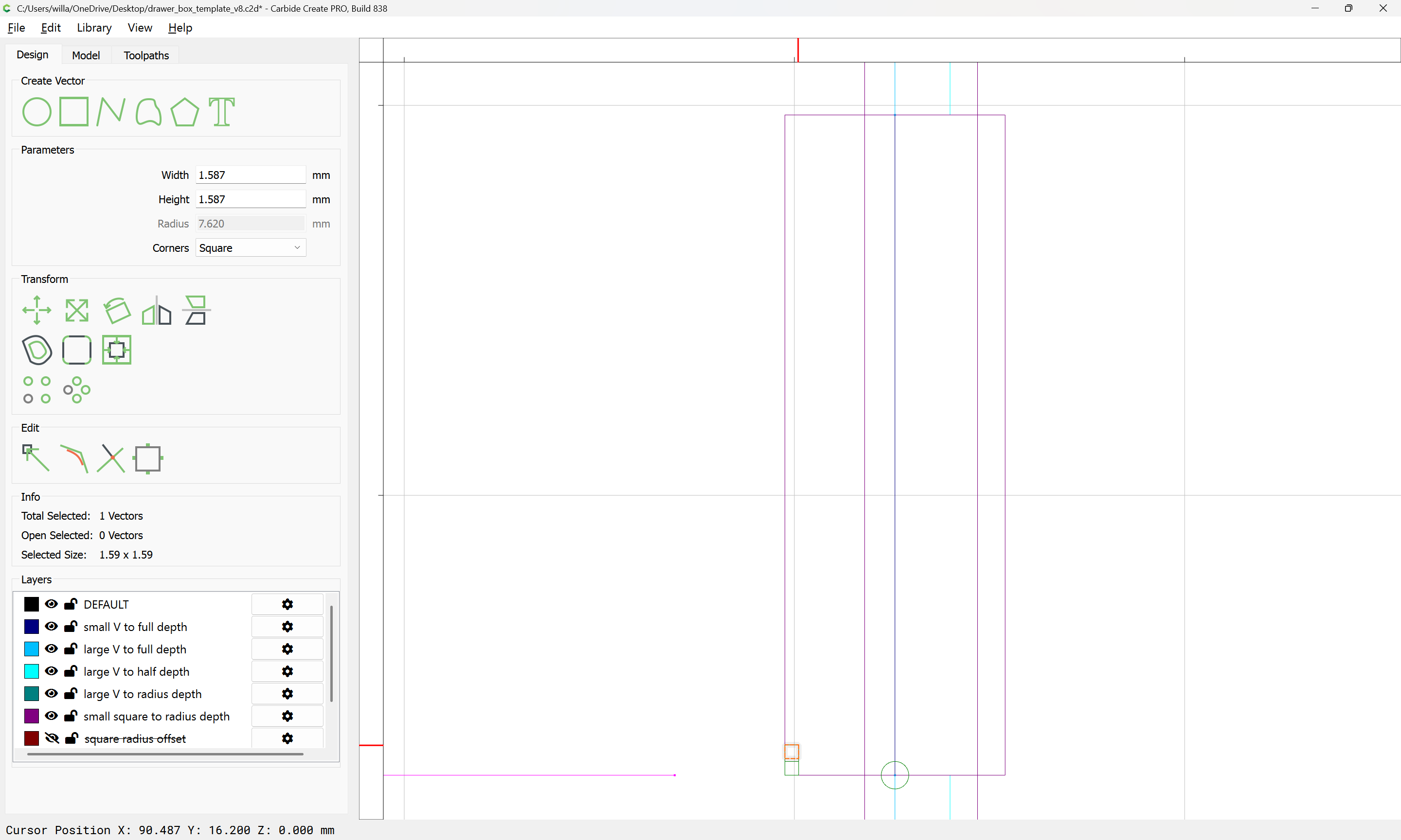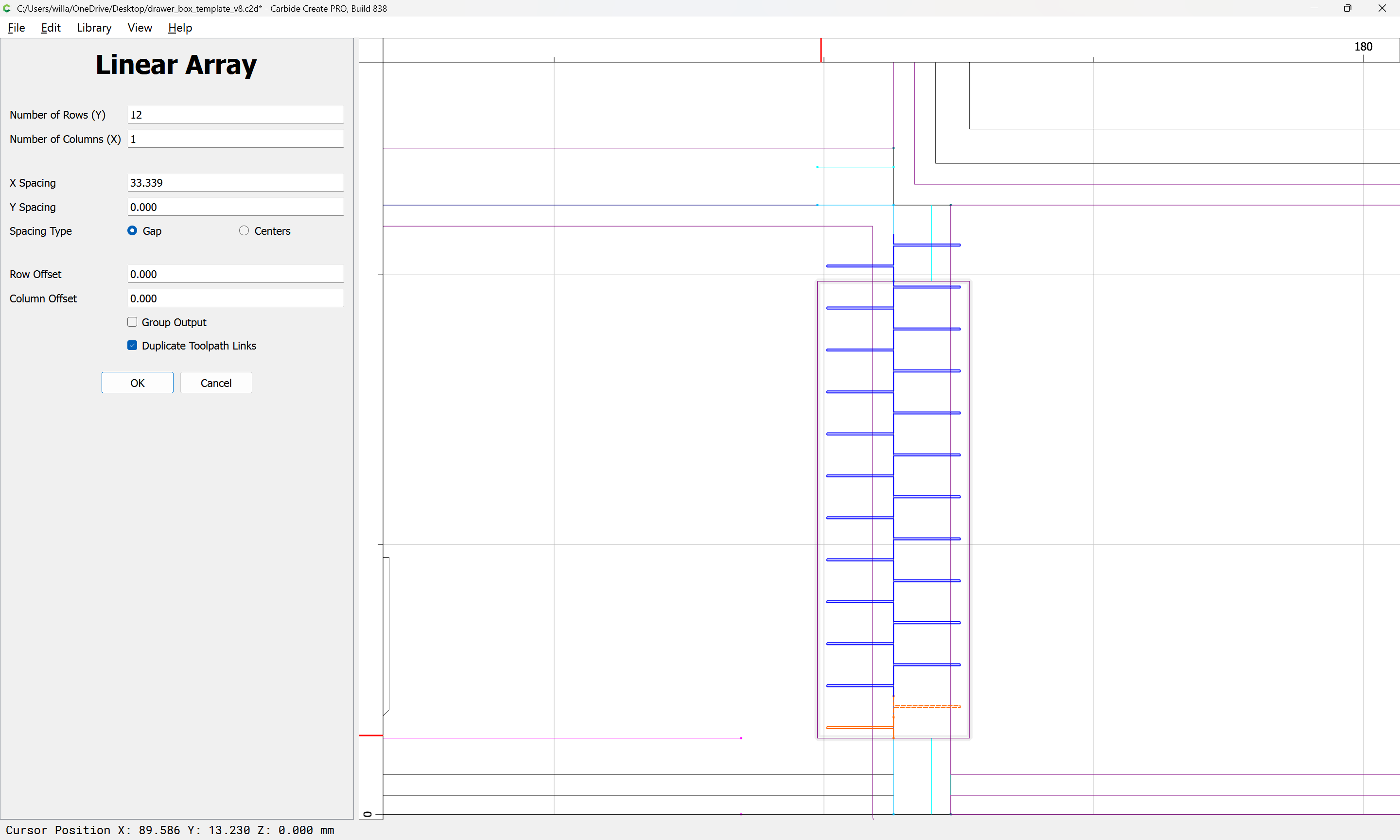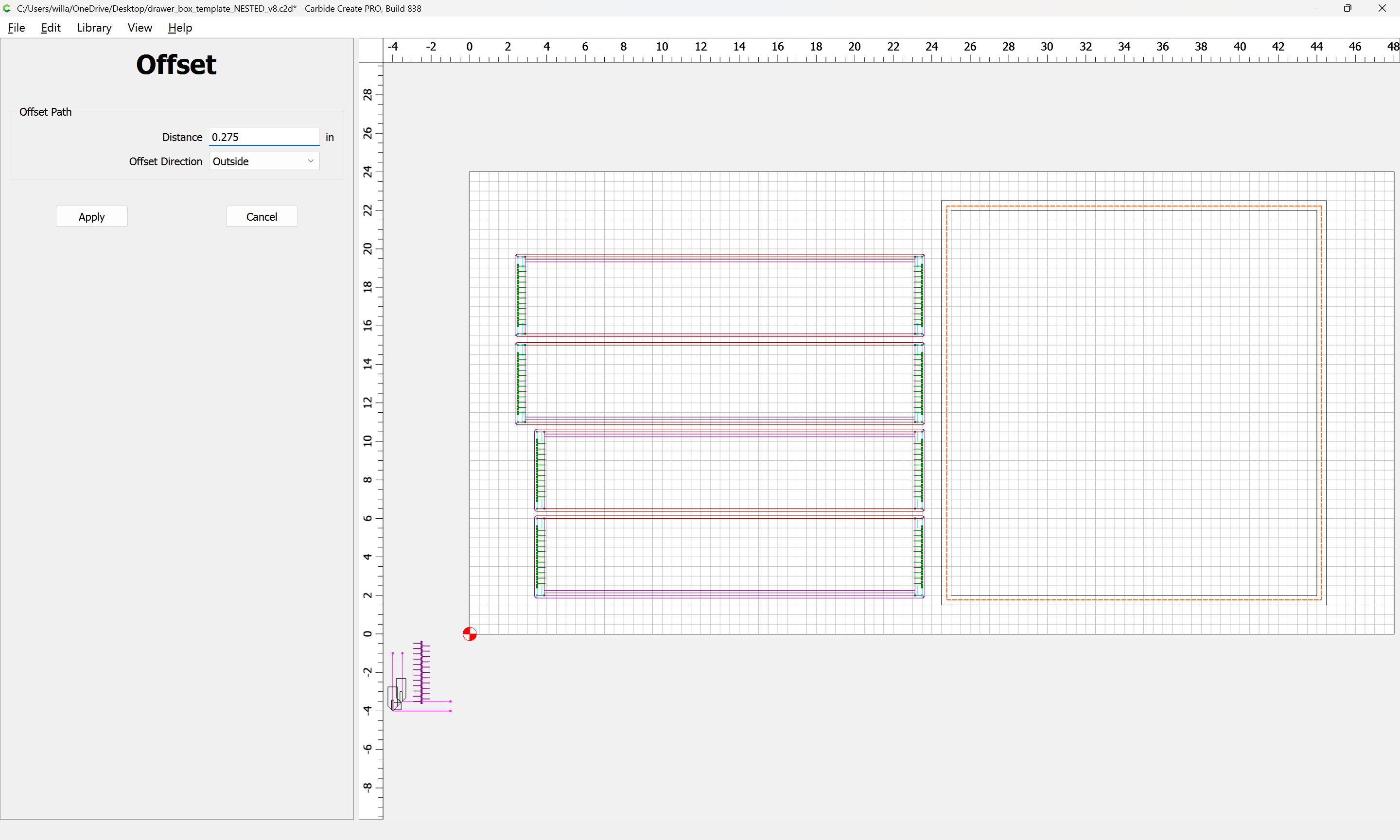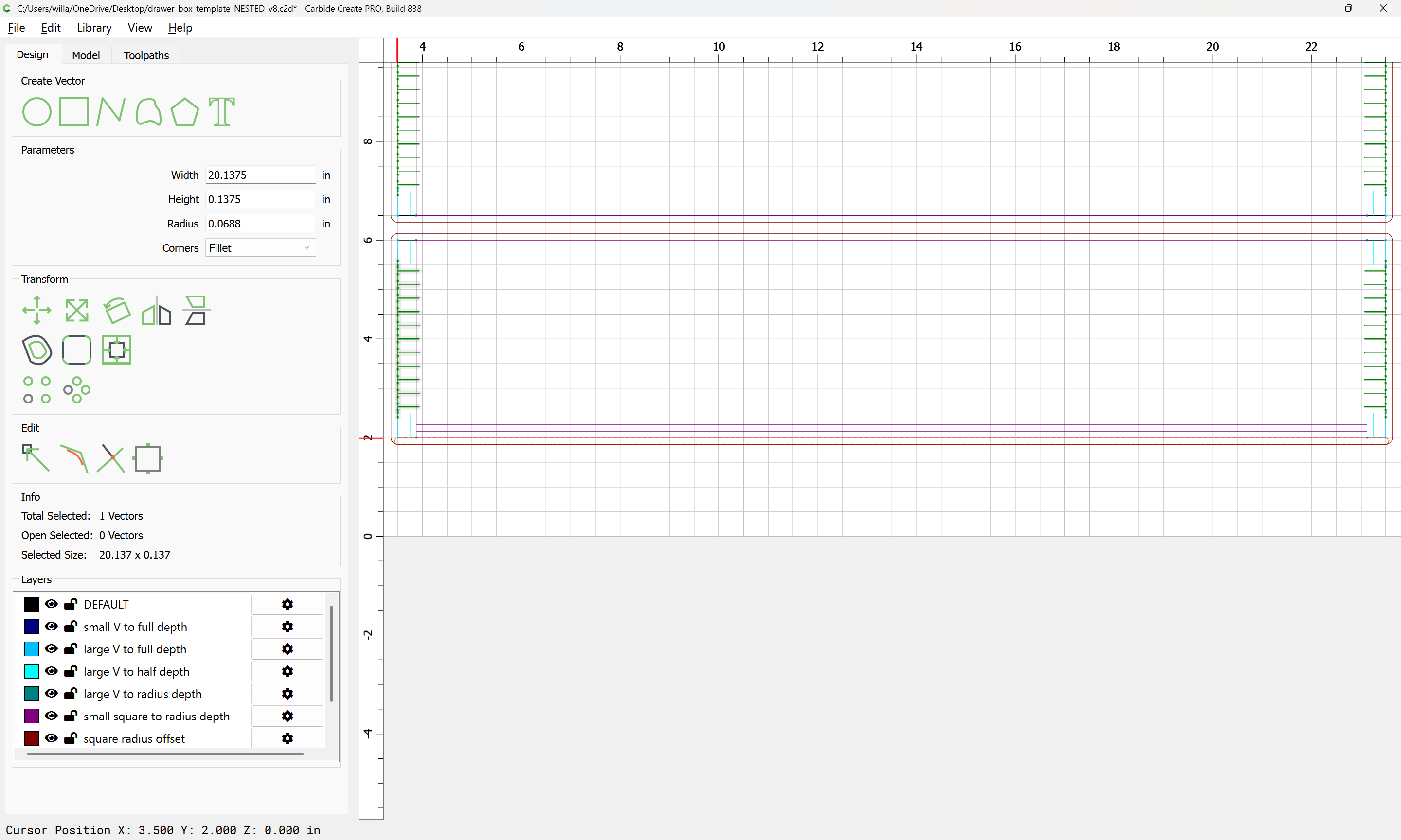 Lastly, the toolpaths will need to be arranged and ordered adjust for optimal material removal — in particular, the small V to full depth toolpath should be cut last and may have its Start Depth set to the bottom of the joinery depth toolpath.