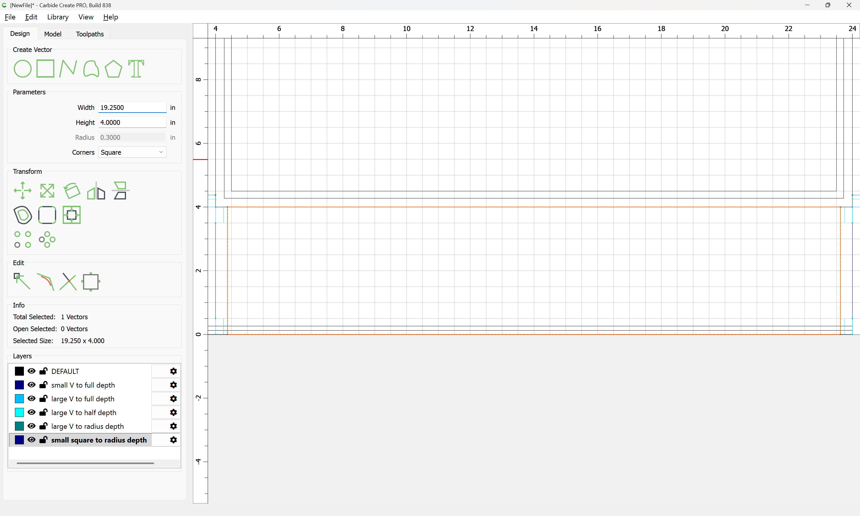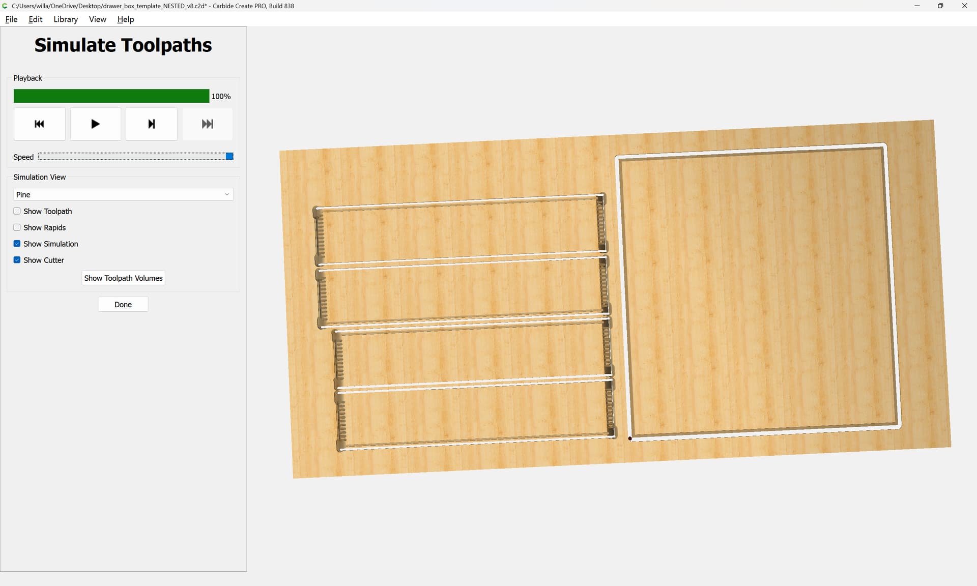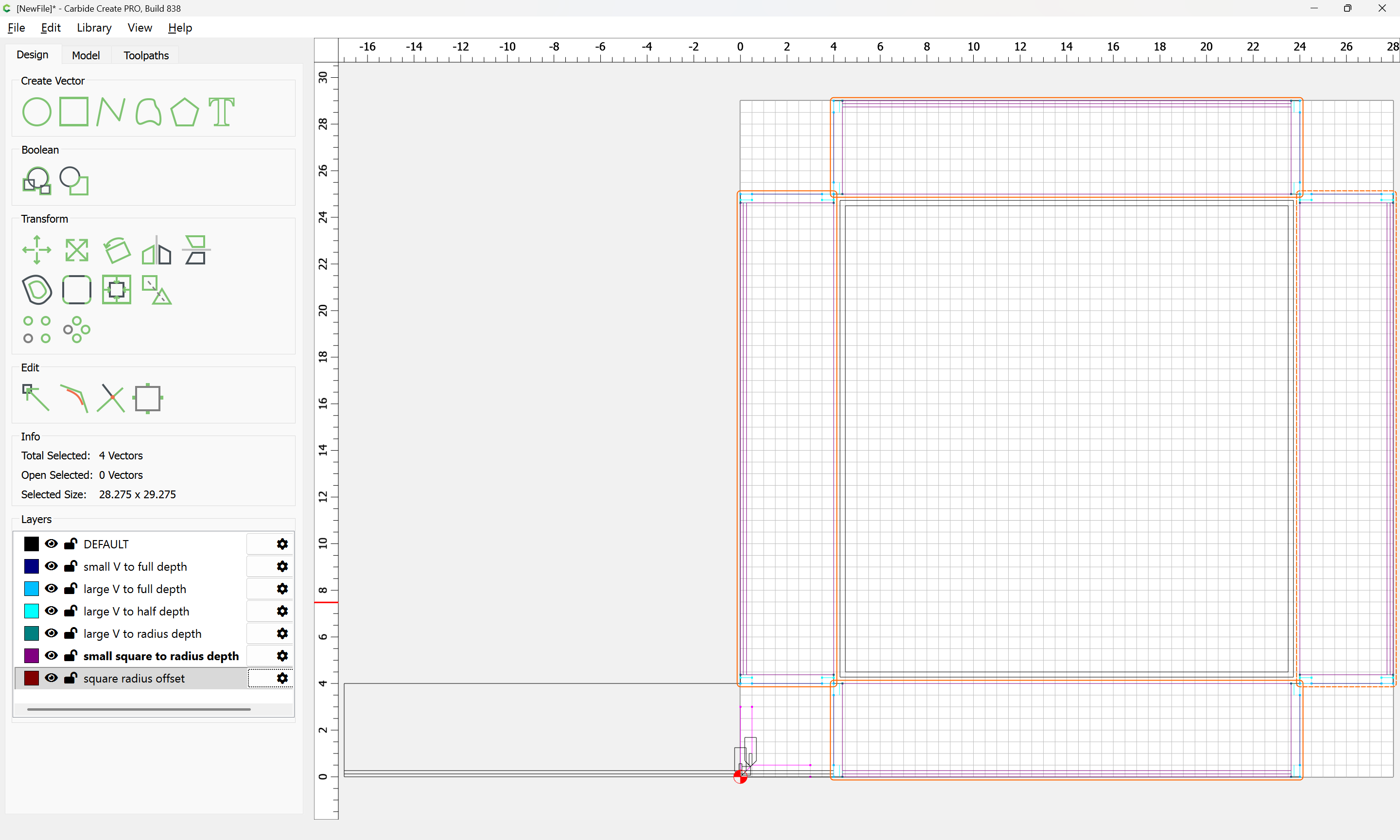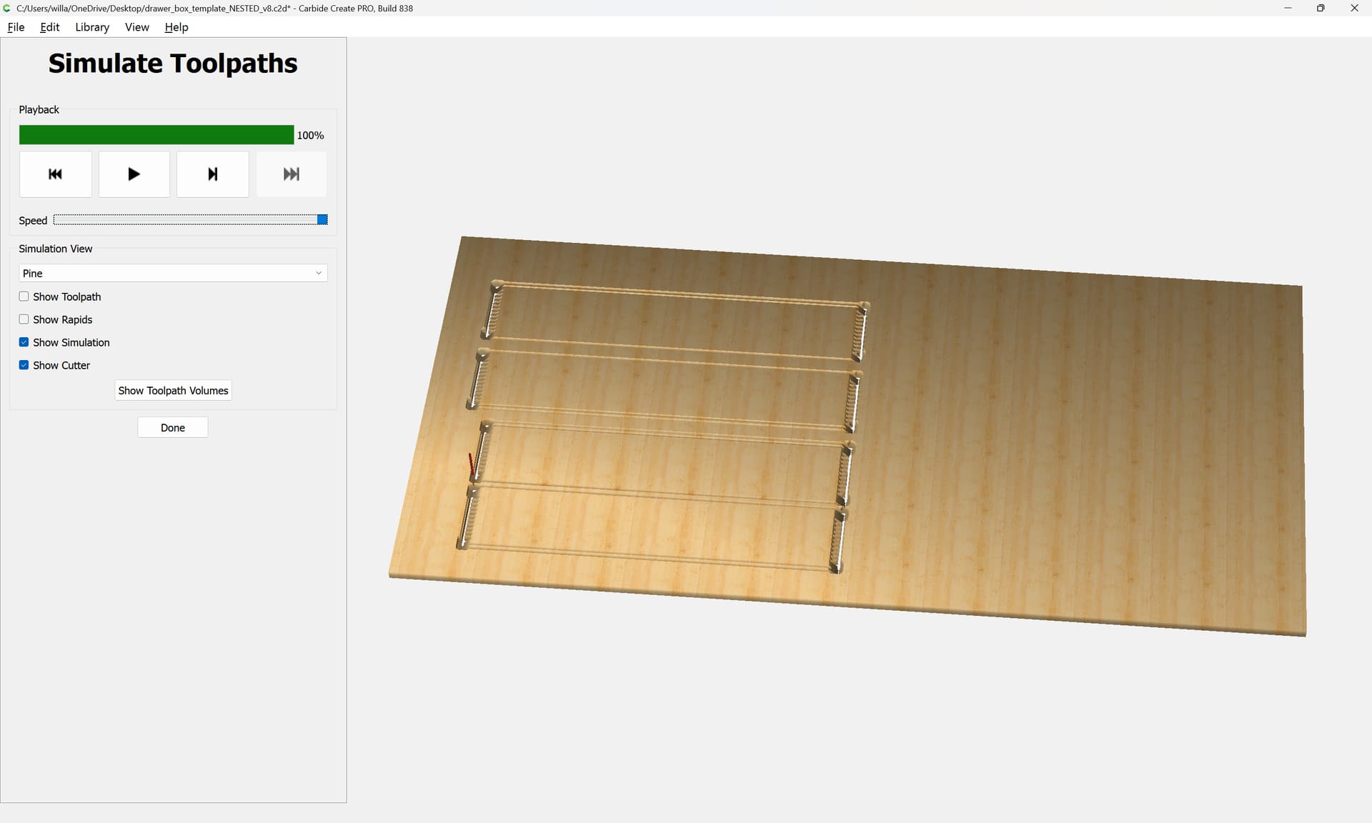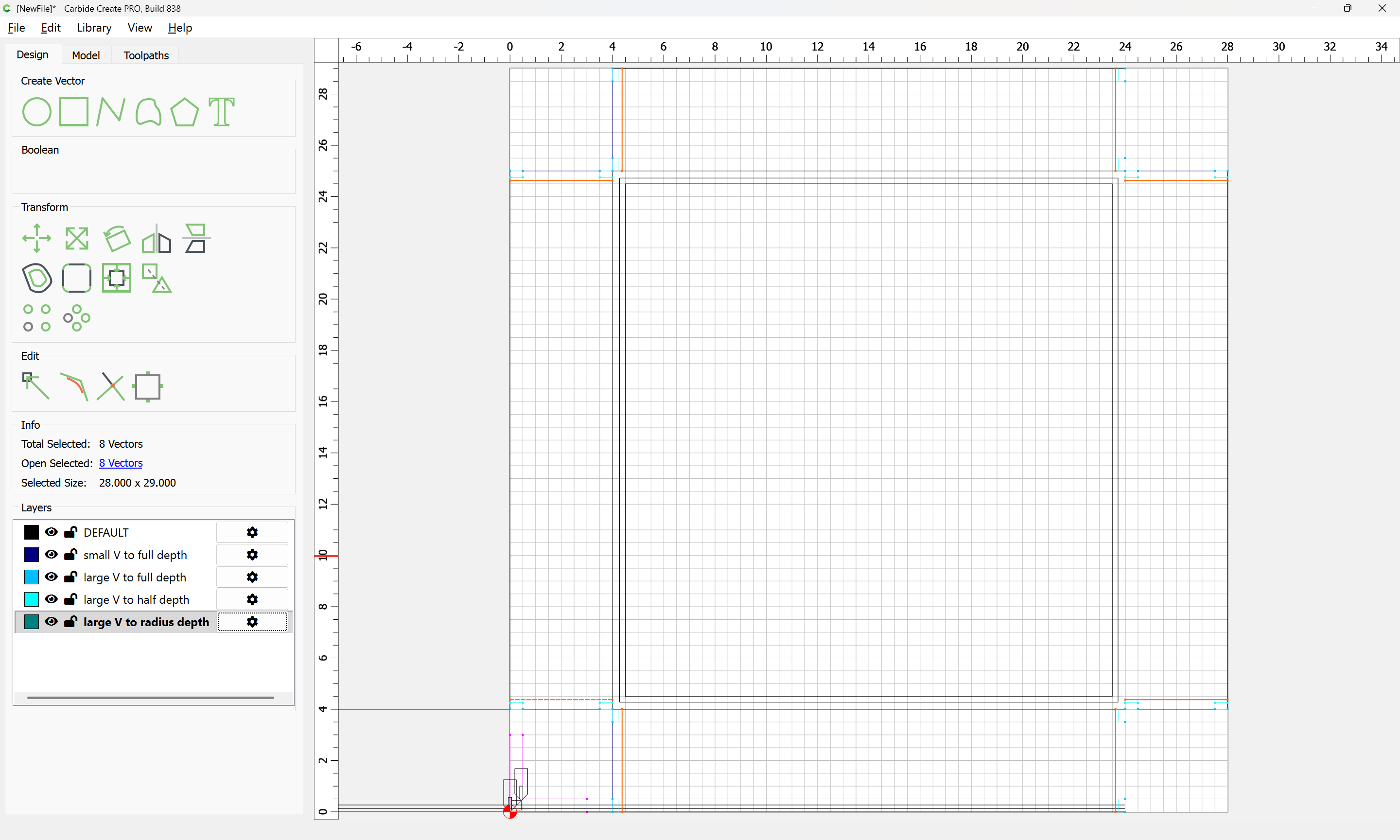 Lastly, the toolpaths will need to be arranged and ordered adjust for optimal material removal — in particular, the small V to full depth toolpath should be cut last and may have its Start Depth set to the bottom of the joinery depth toolpath.