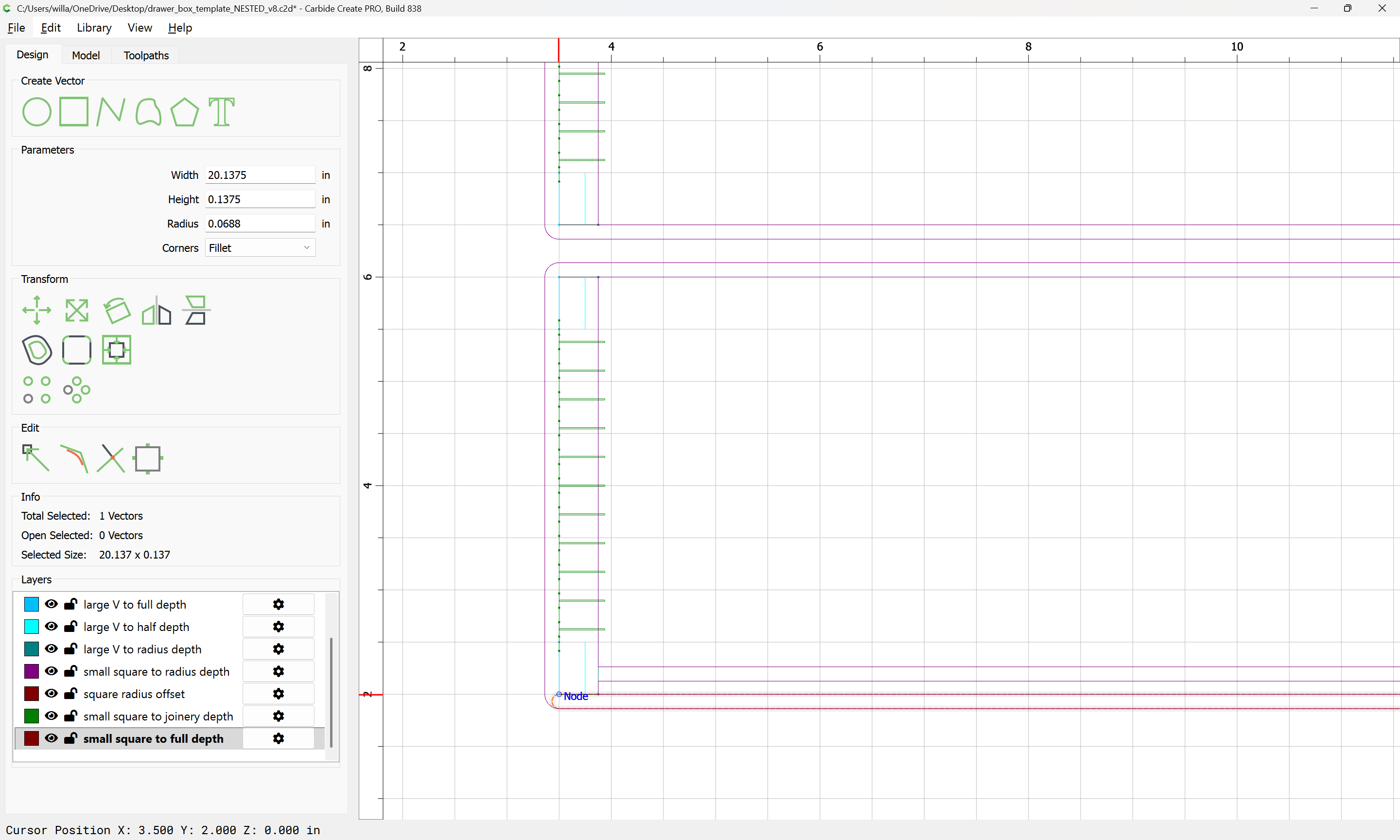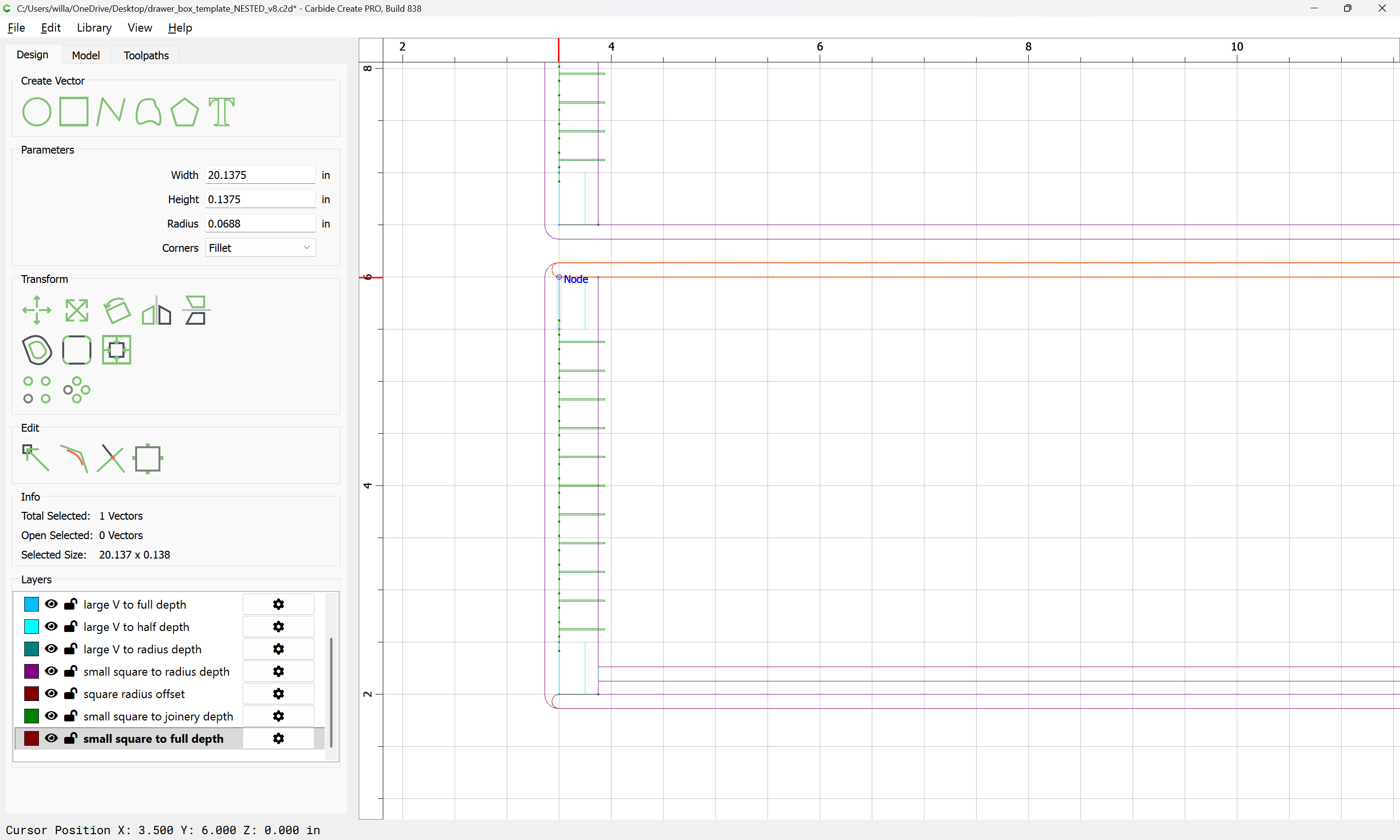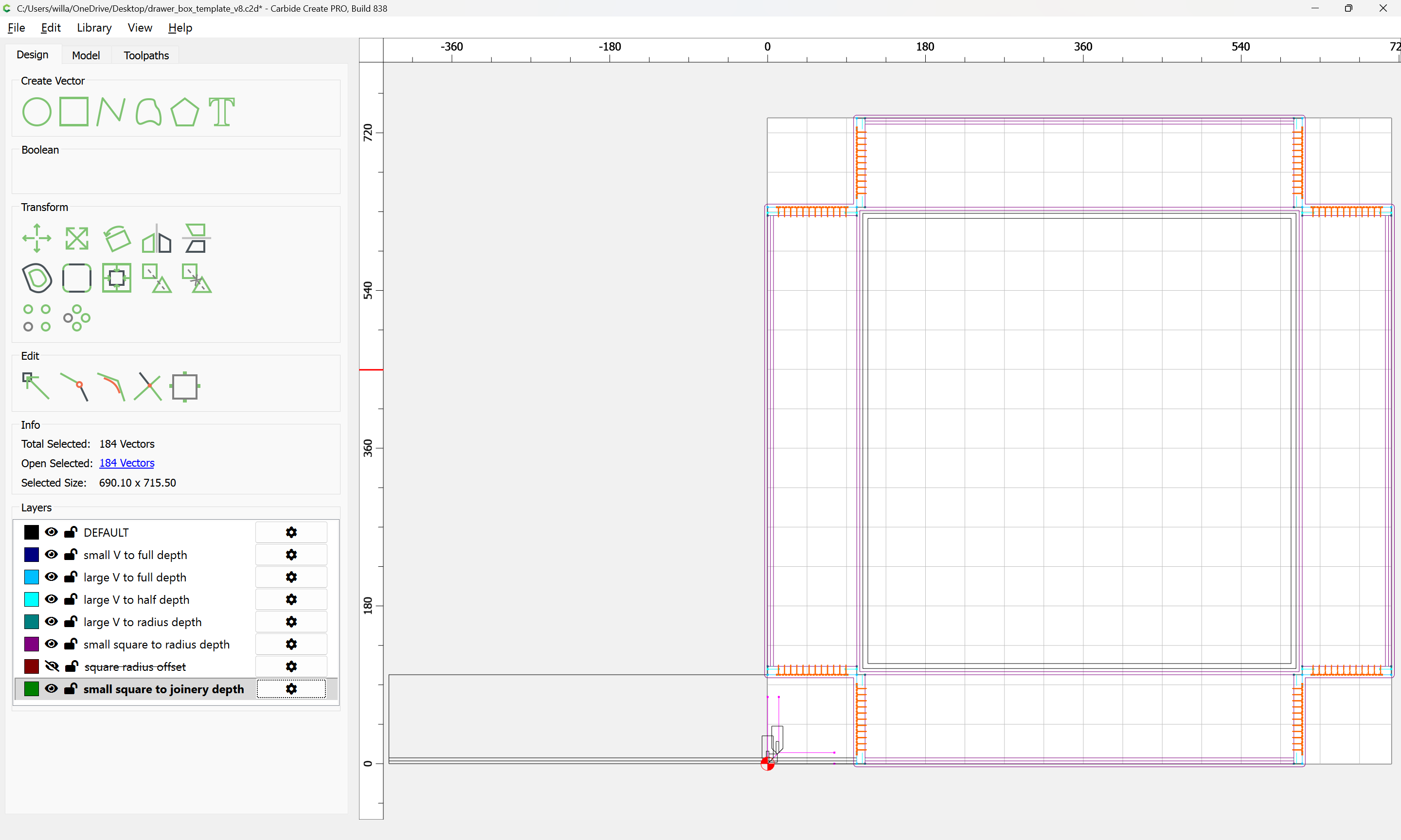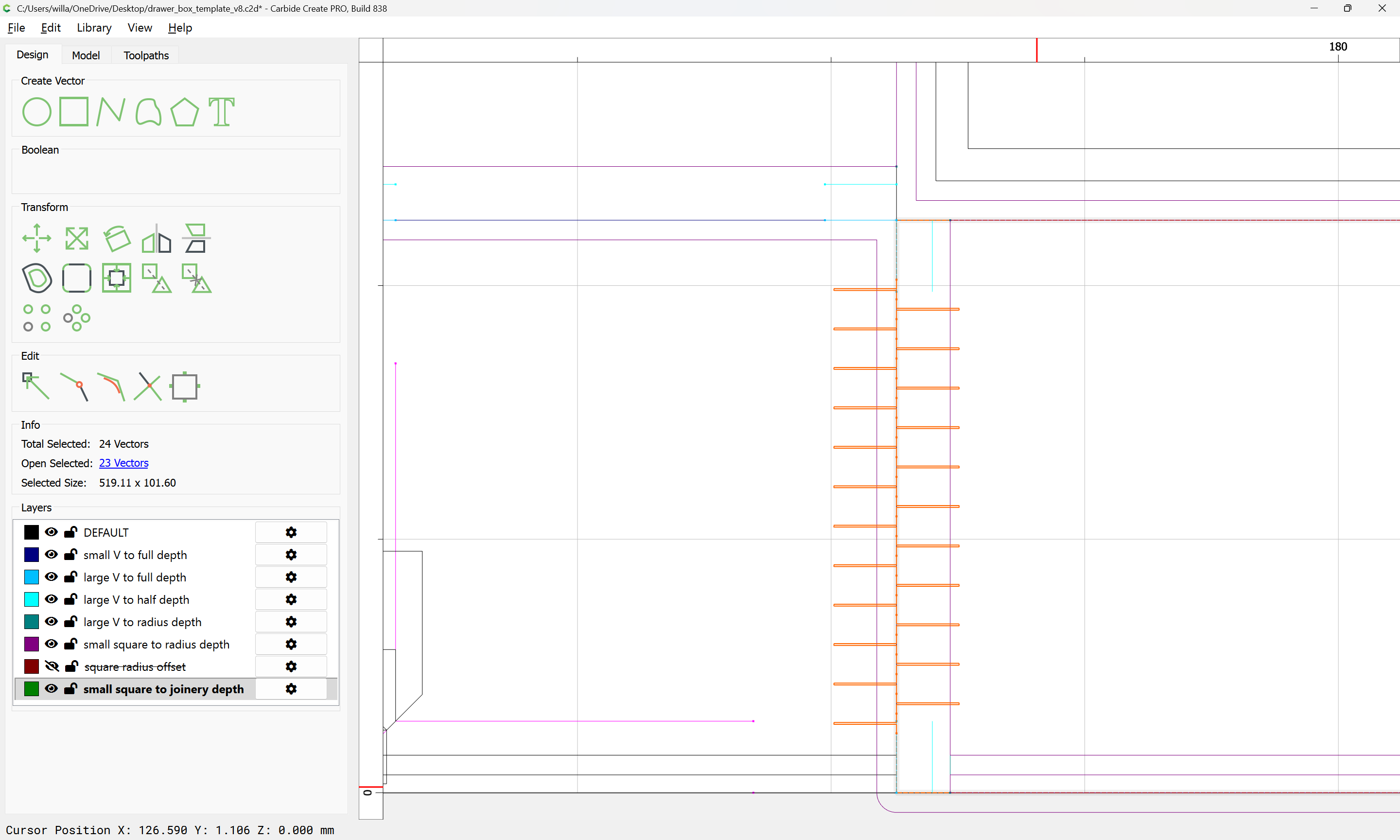 A slightly complex region which will need to be defined is the removal of material above the box joint “fingers” so that it will not be necessary to radius them, or to add dogbones which would remove material weakening the joint.