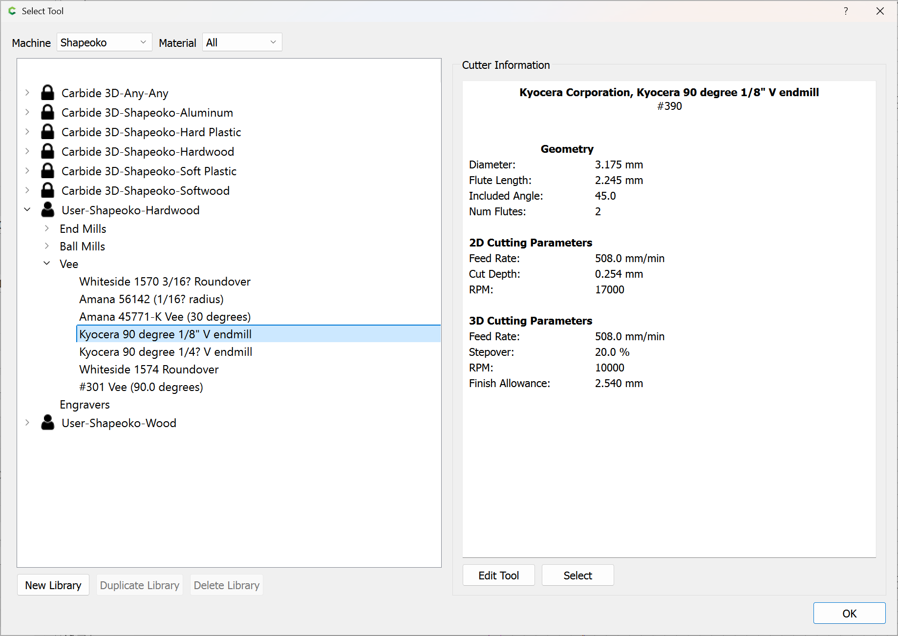 which allows cutting the entirety of the design with a single setup — one negative is that it requires a small/narrow 90 degree V tool and a matching (or slightly smaller) square tool, and this further means that the time spent machining is increased by the use of the small tools.
