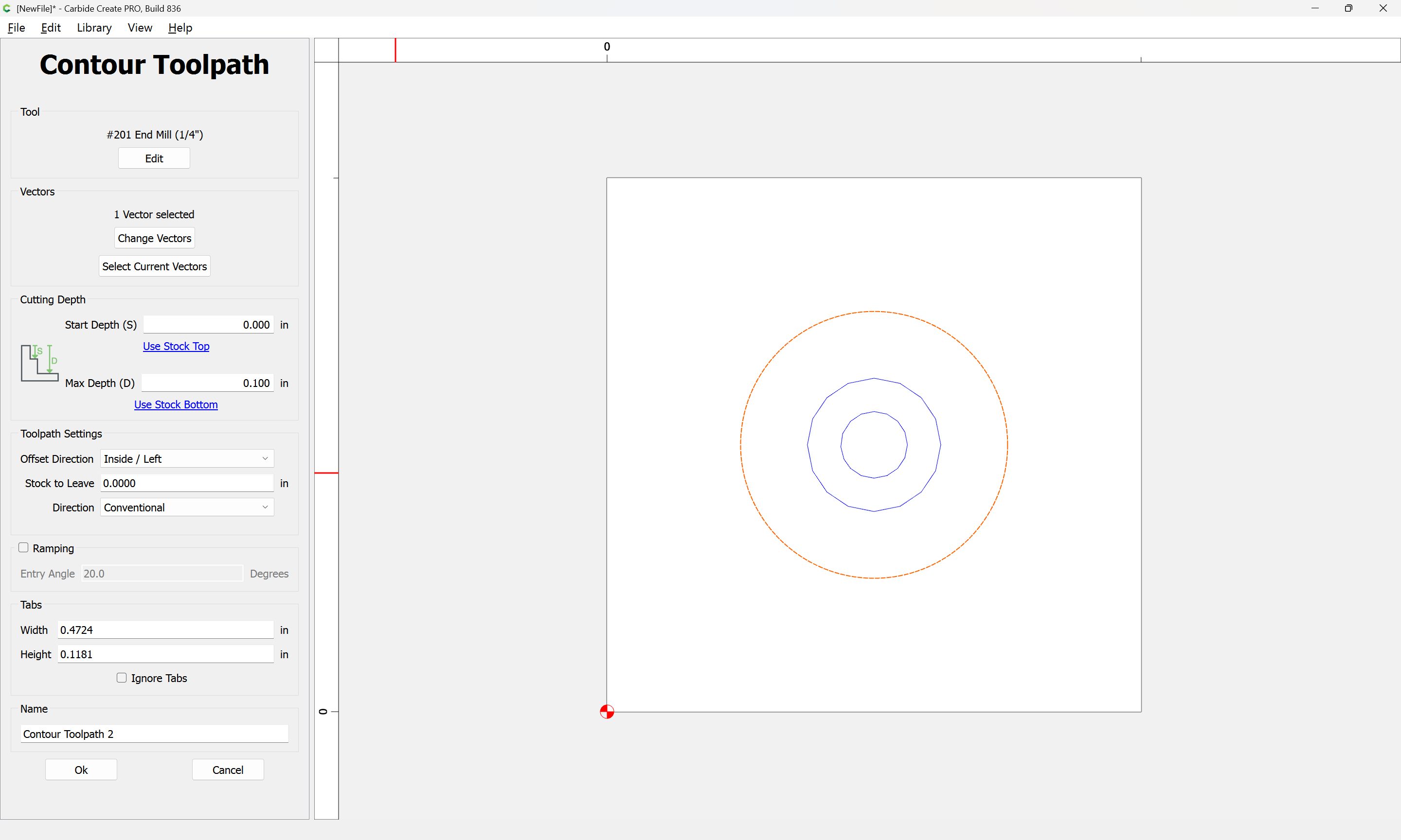 Due to the narrowness of the angles, an 0.03125" endmill has to be used, so after importing and scaling the file (we will be cutting out one which is 3") we select the perimeter and offset it tw…