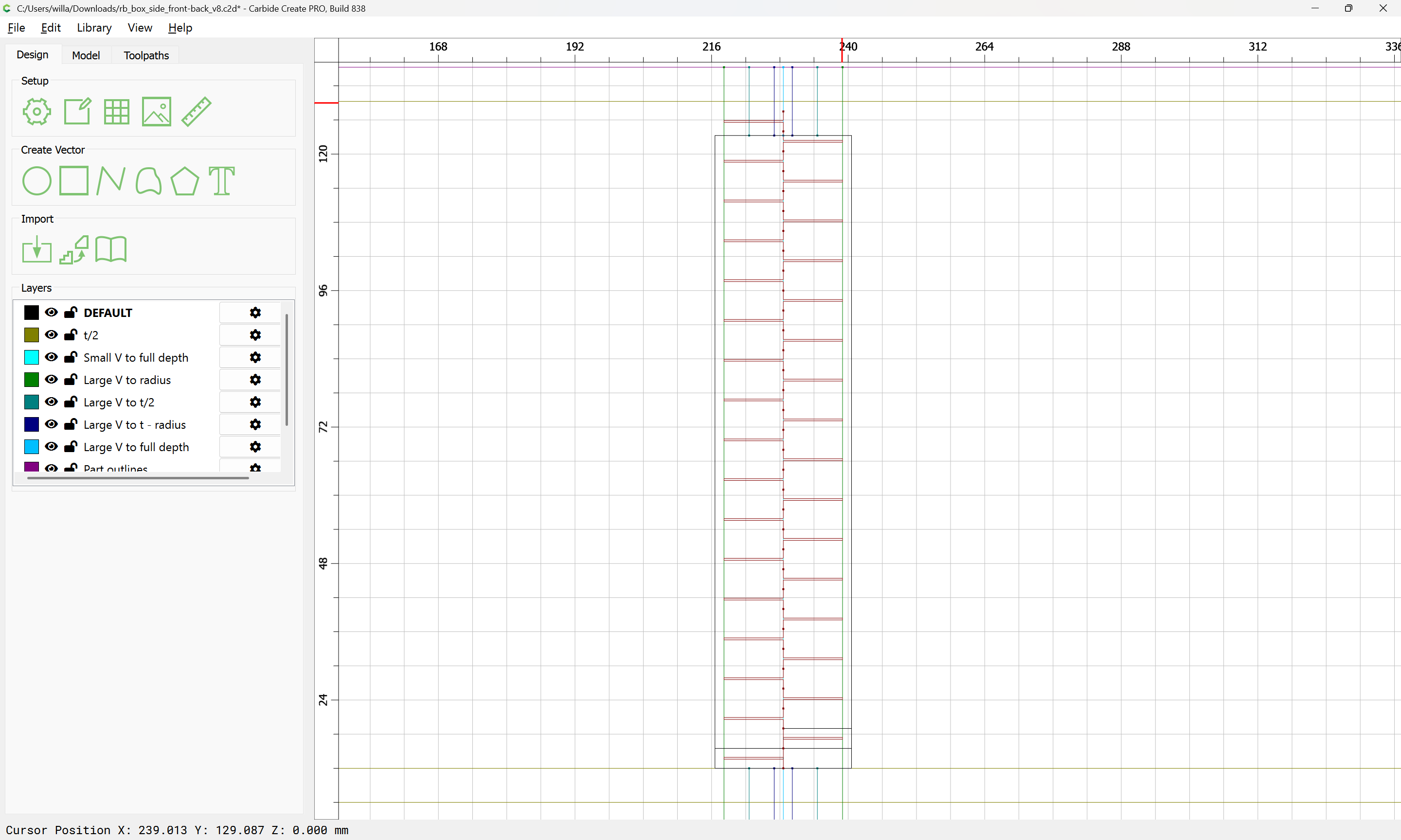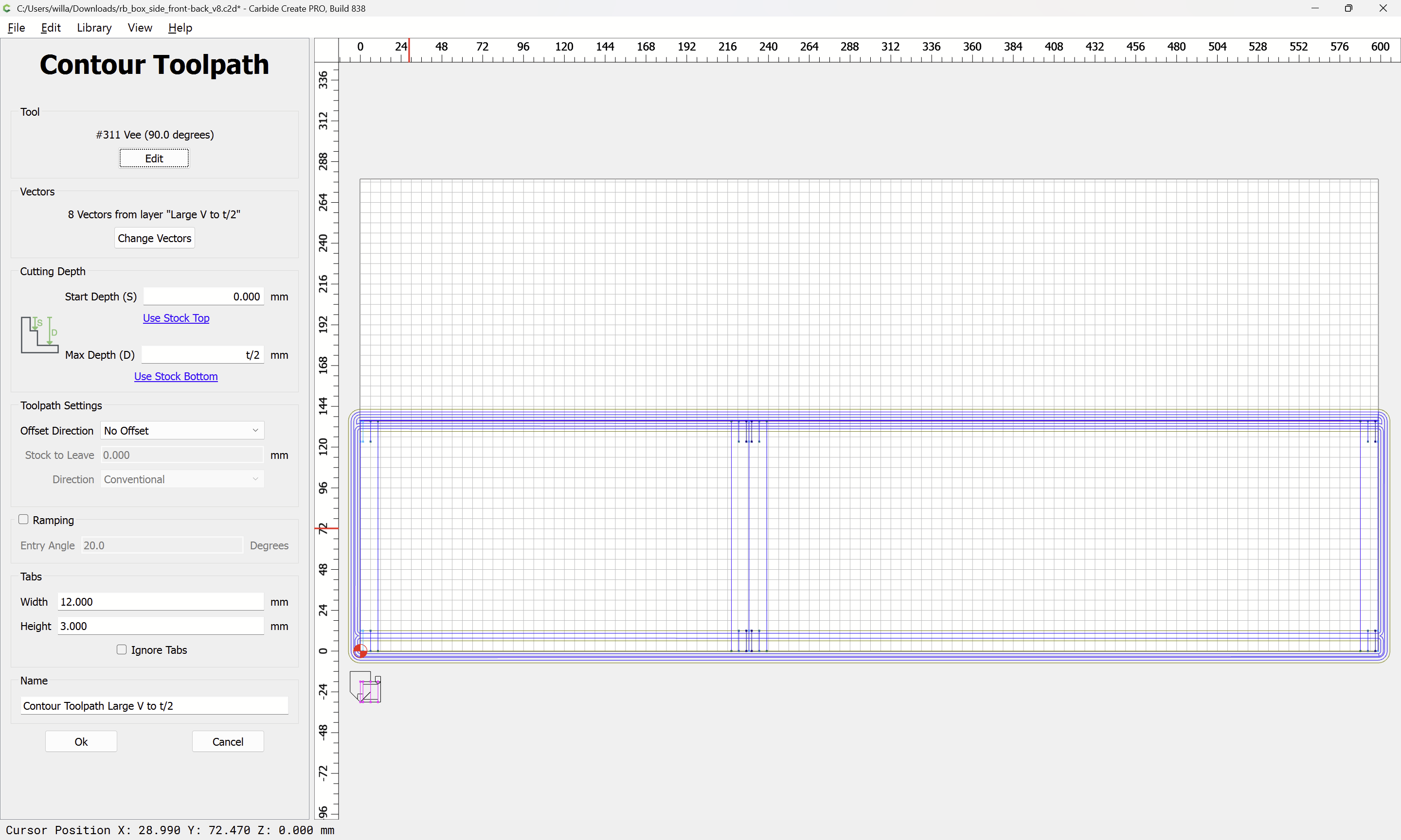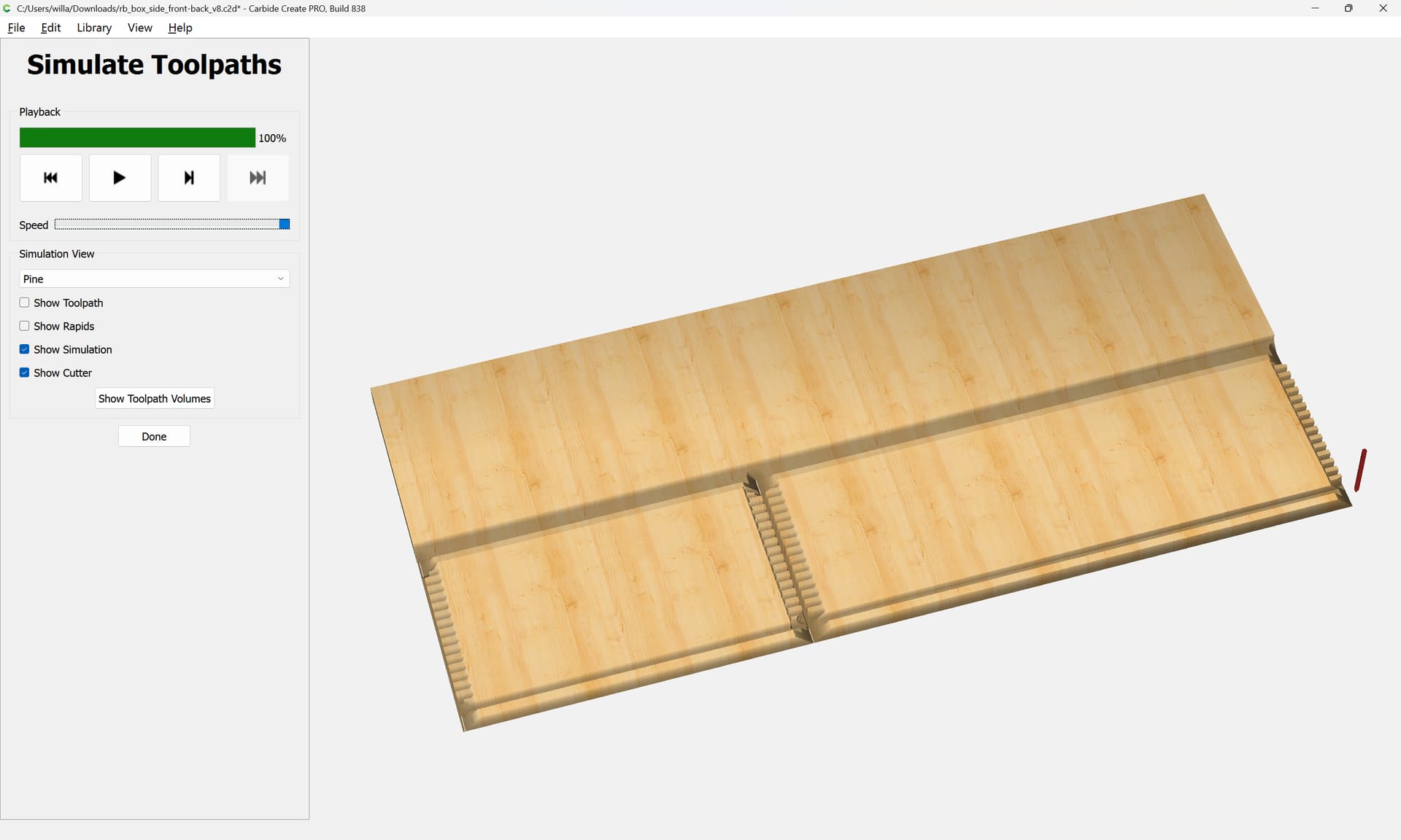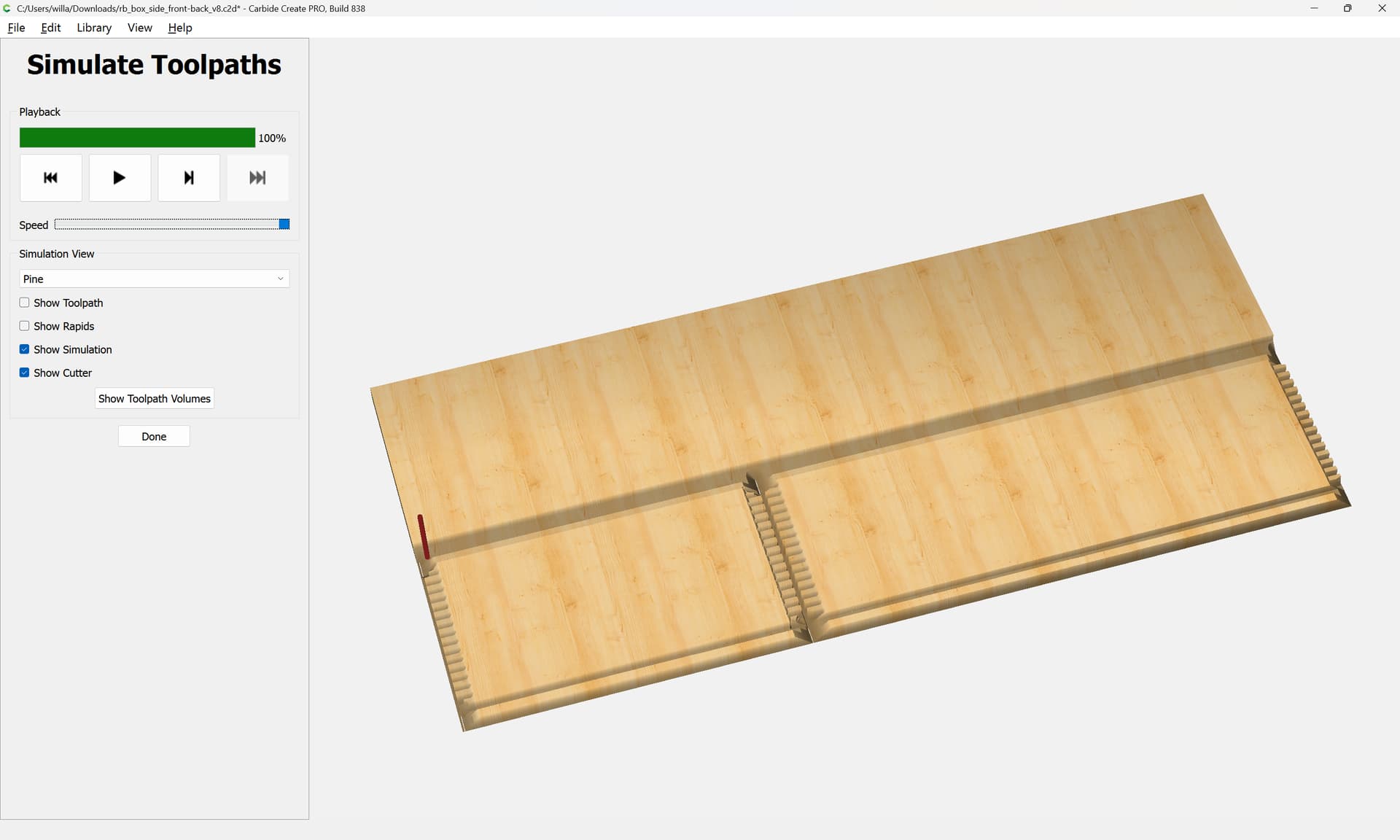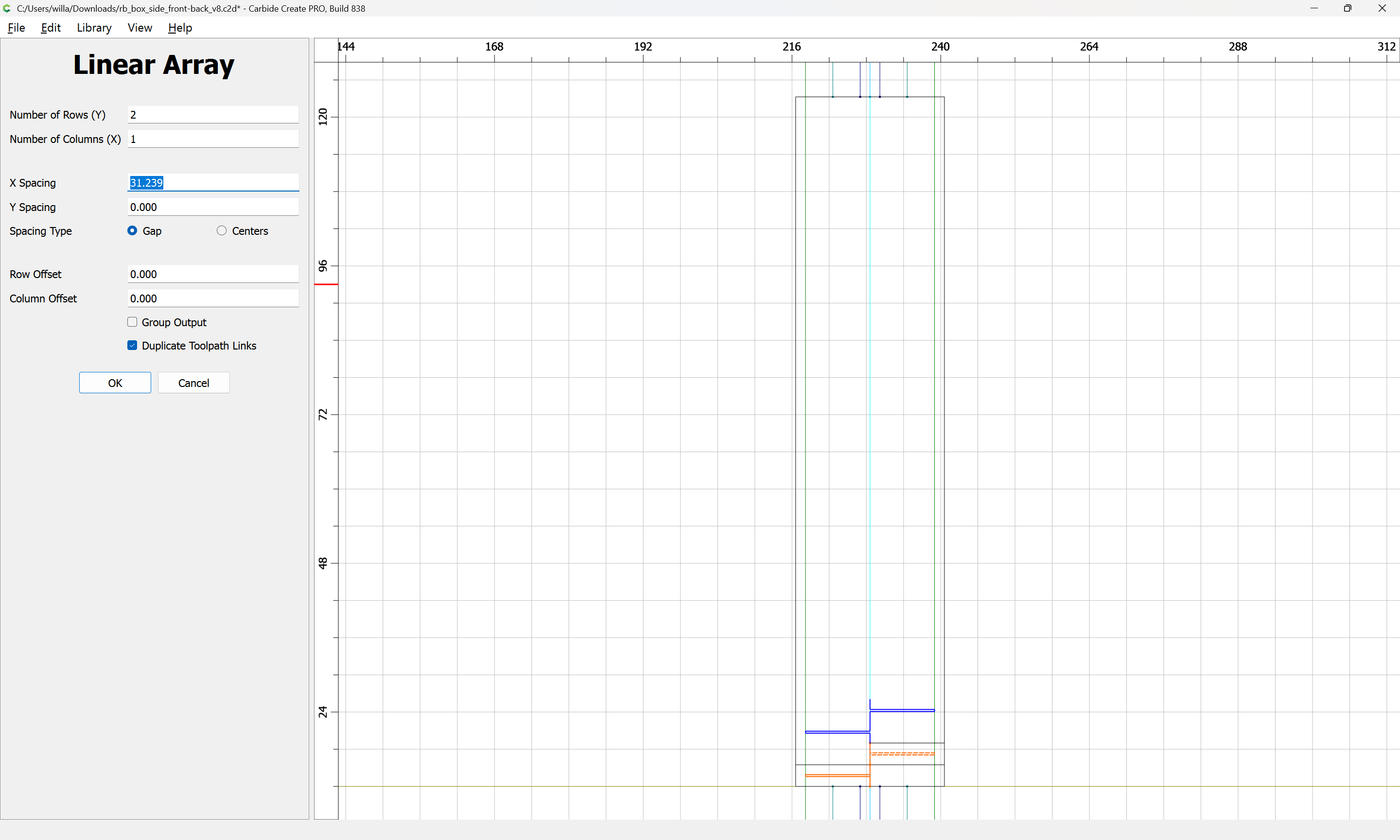 Next would be duplicating these toolpaths to the other end of each part, cutting away the tops of the box joints, arranging the toolpaths in optimal order, and duplicating everything to cut two pairs of parts.