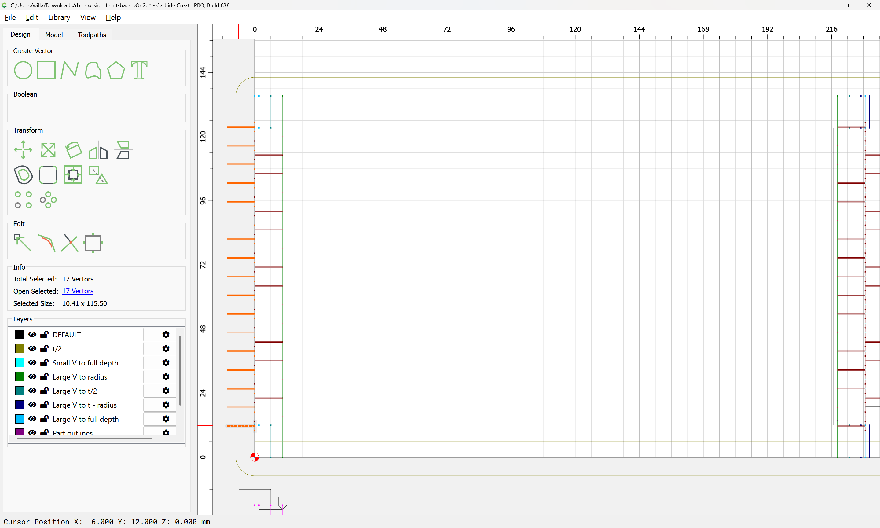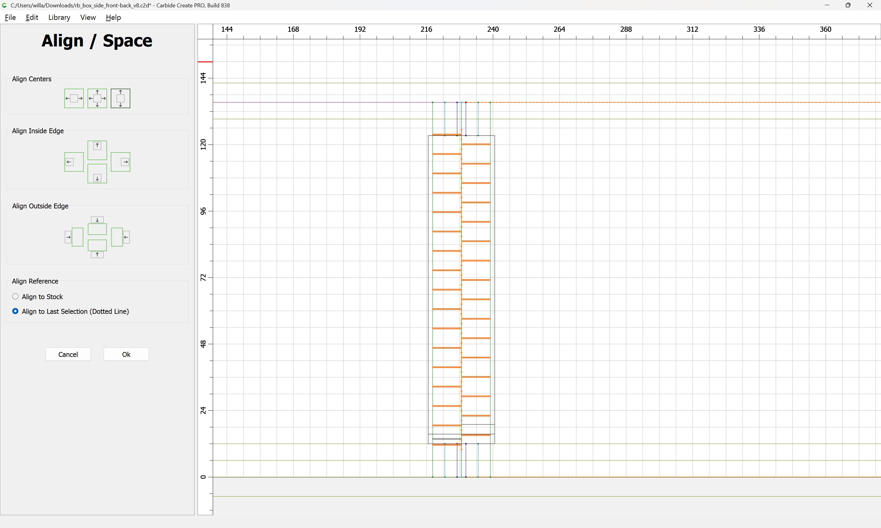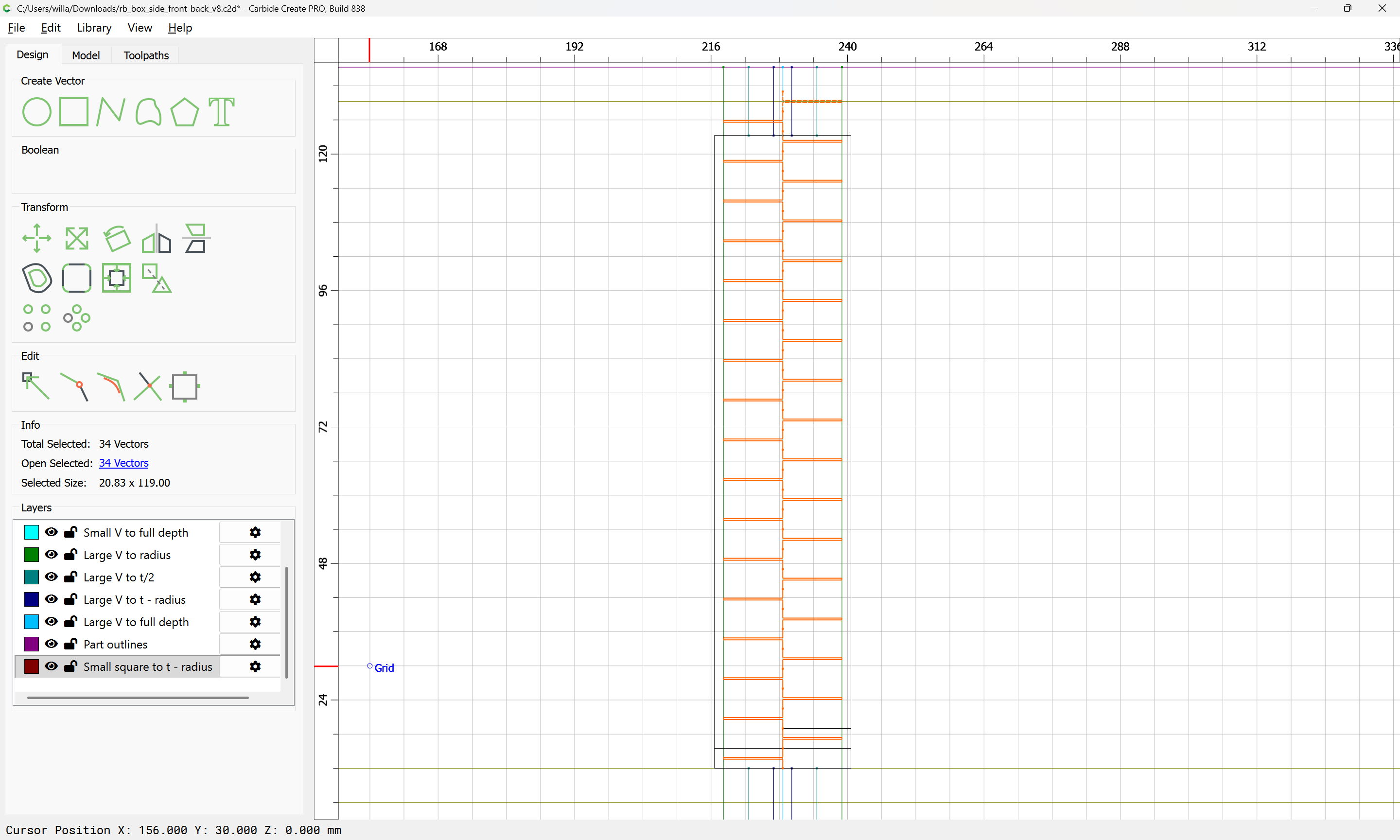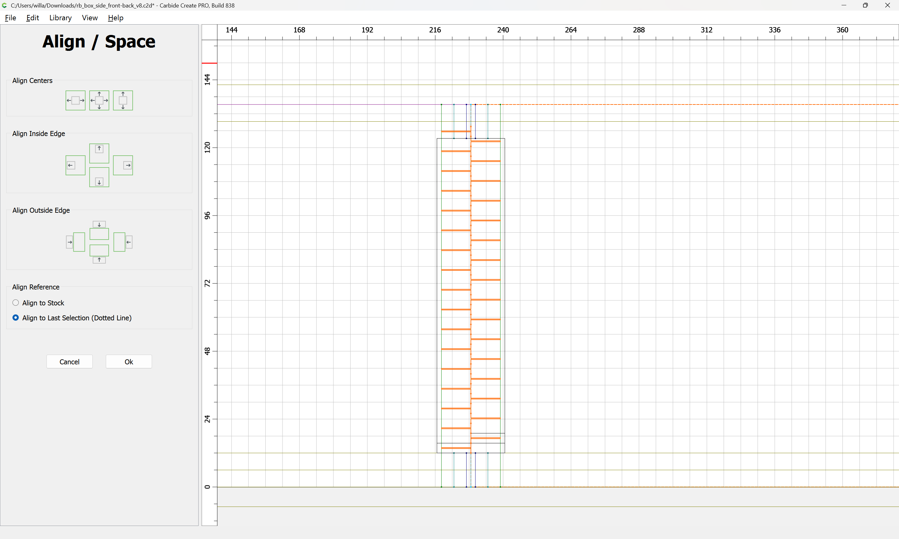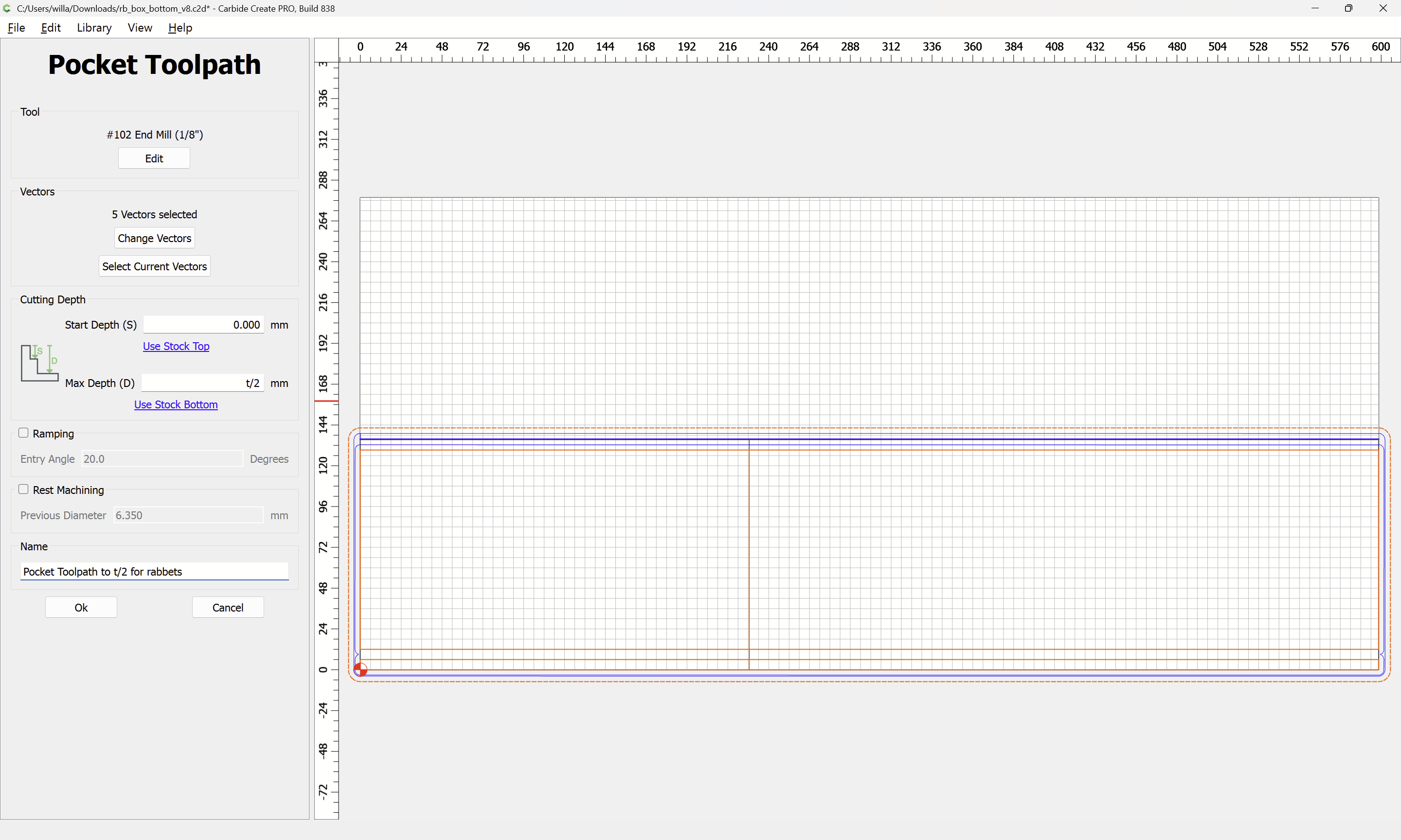 Next would be duplicating these toolpaths to the other end of each part, cutting away the tops of the box joints, arranging the toolpaths in optimal order, and duplicating everything to cut two pairs of parts.