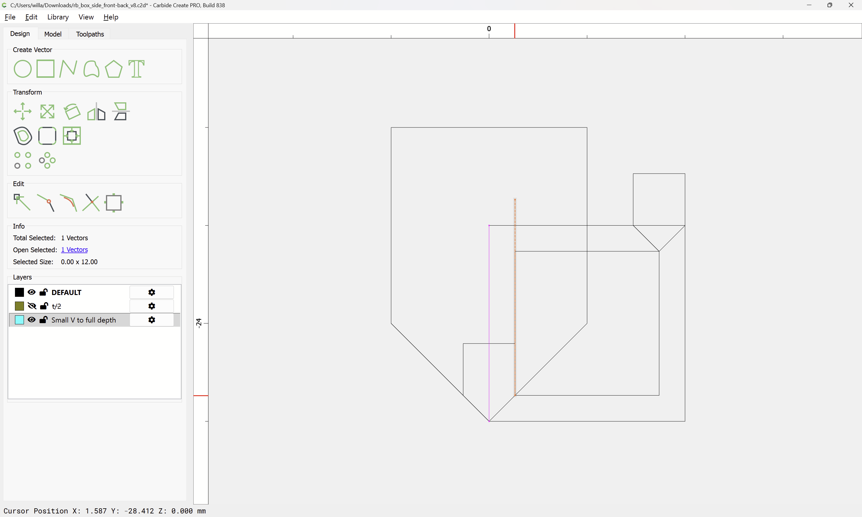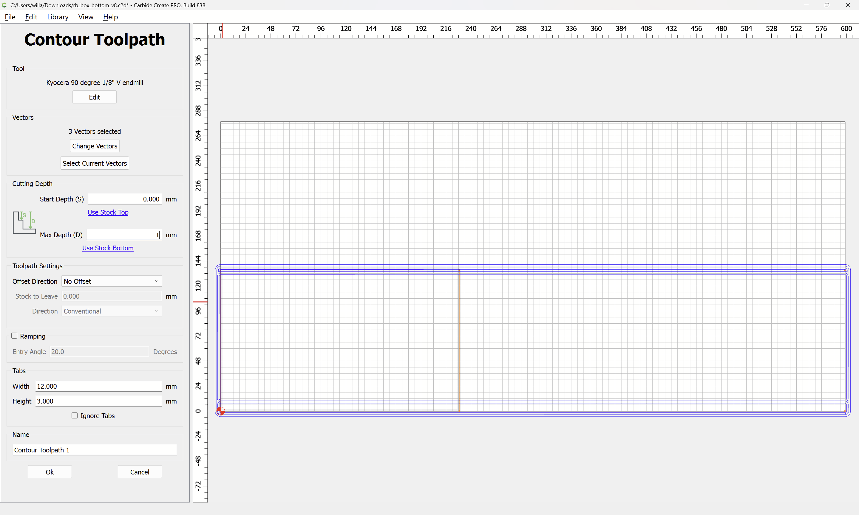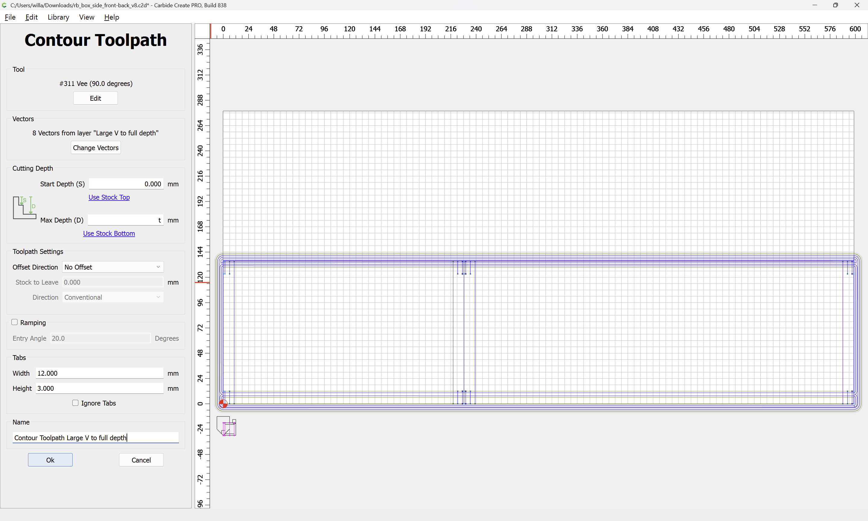 The tool is rather small relative to the (un-cut-in-half) stock, and making multiple passes with the V tool helps with the geometry. Doubling the 6mm cutting depth of the tool seems a reasonable compromise, and it should be easy for the reader to increase the number of passes if desired.