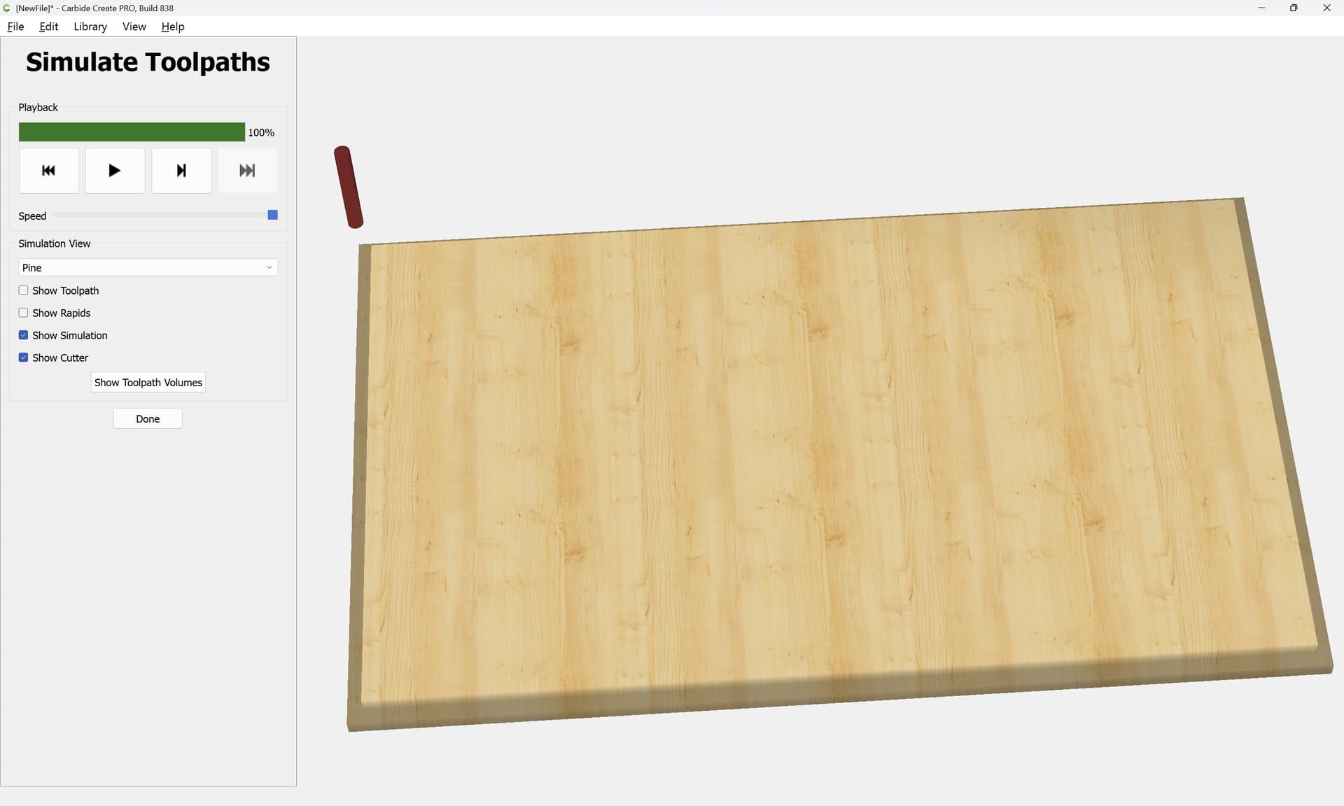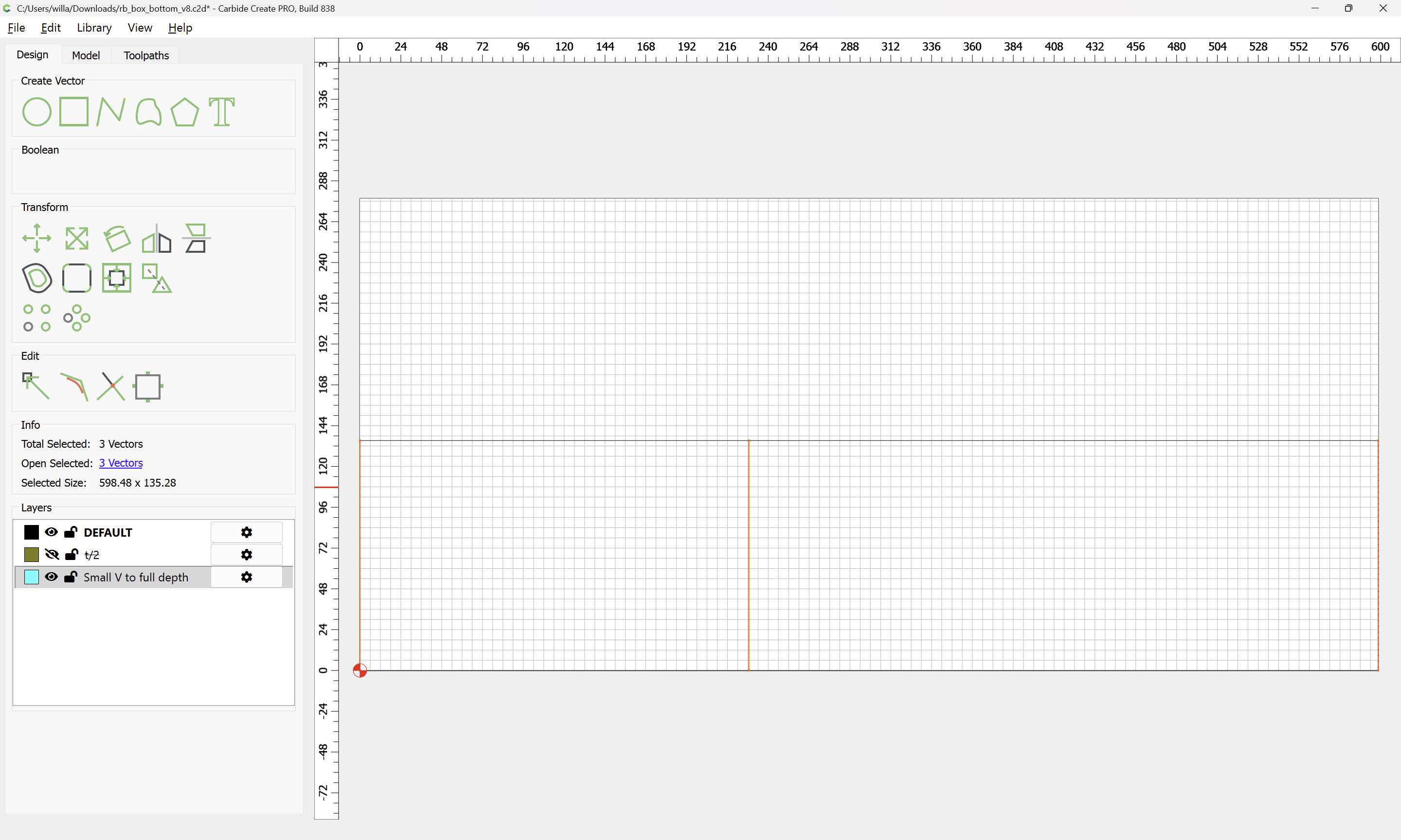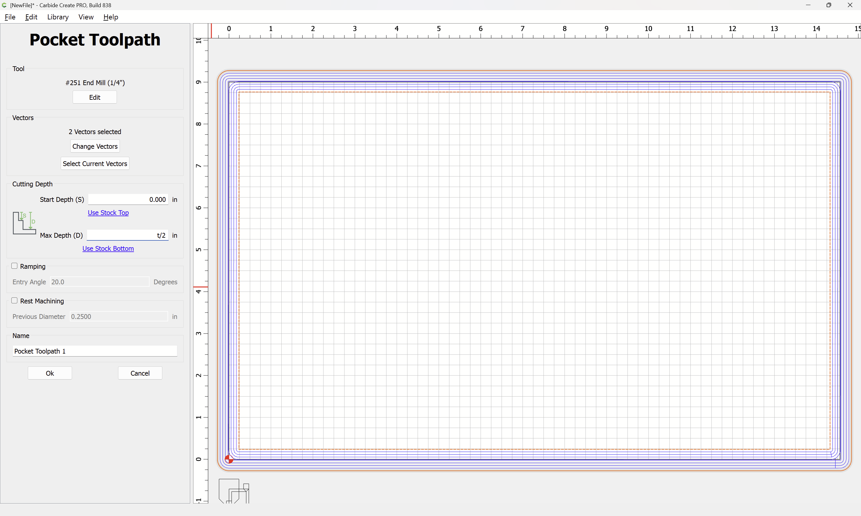 The tool is rather small relative to the (un-cut-in-half) stock, and making multiple passes with the V tool helps with the geometry. Doubling the 6mm cutting depth of the tool seems a reasonable compromise, and it should be easy for the reader to increase the number of passes if desired.