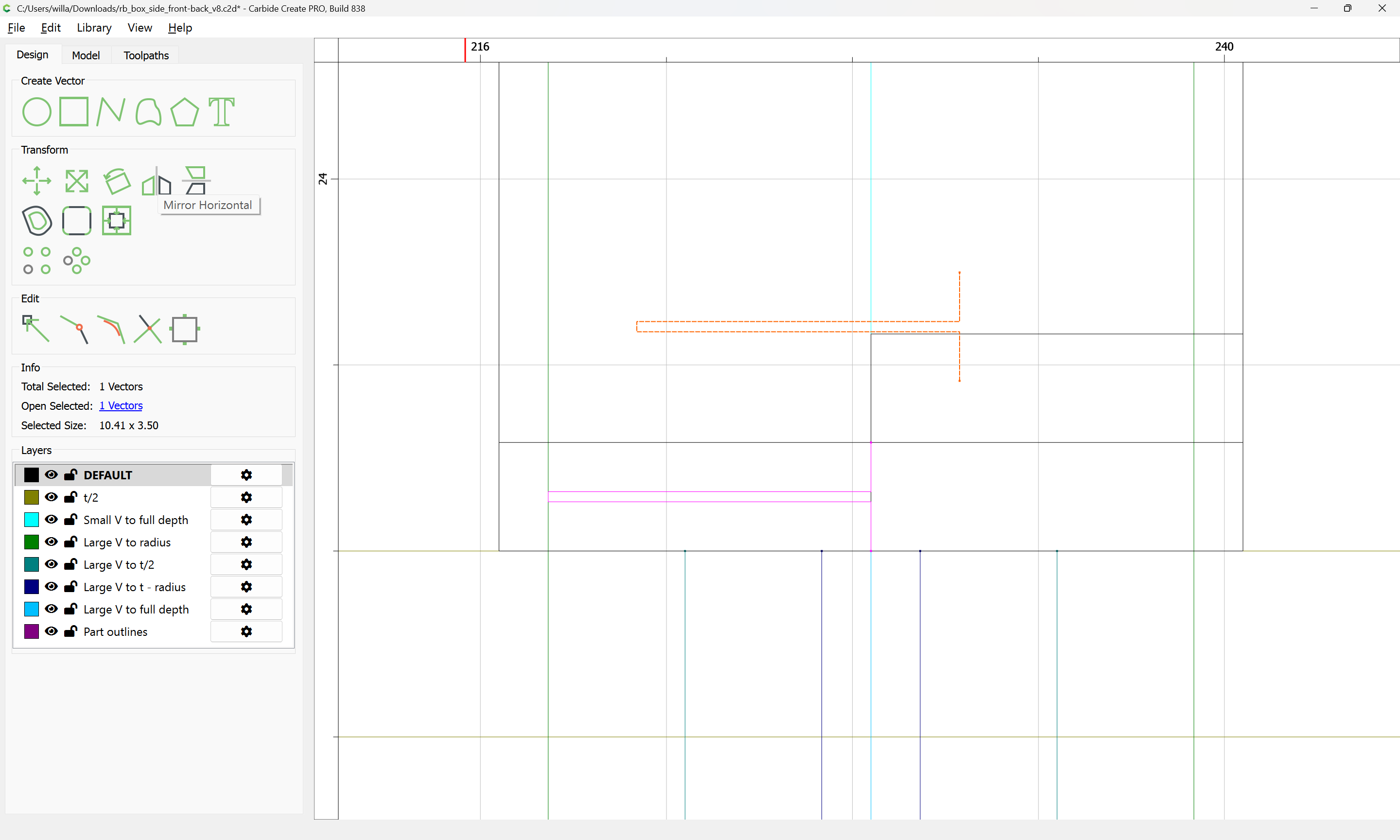 For the joinery, it will be easiest to draw the two sides along the middle and the duplicate. The box-joints will need to fill an area a bit larger than: