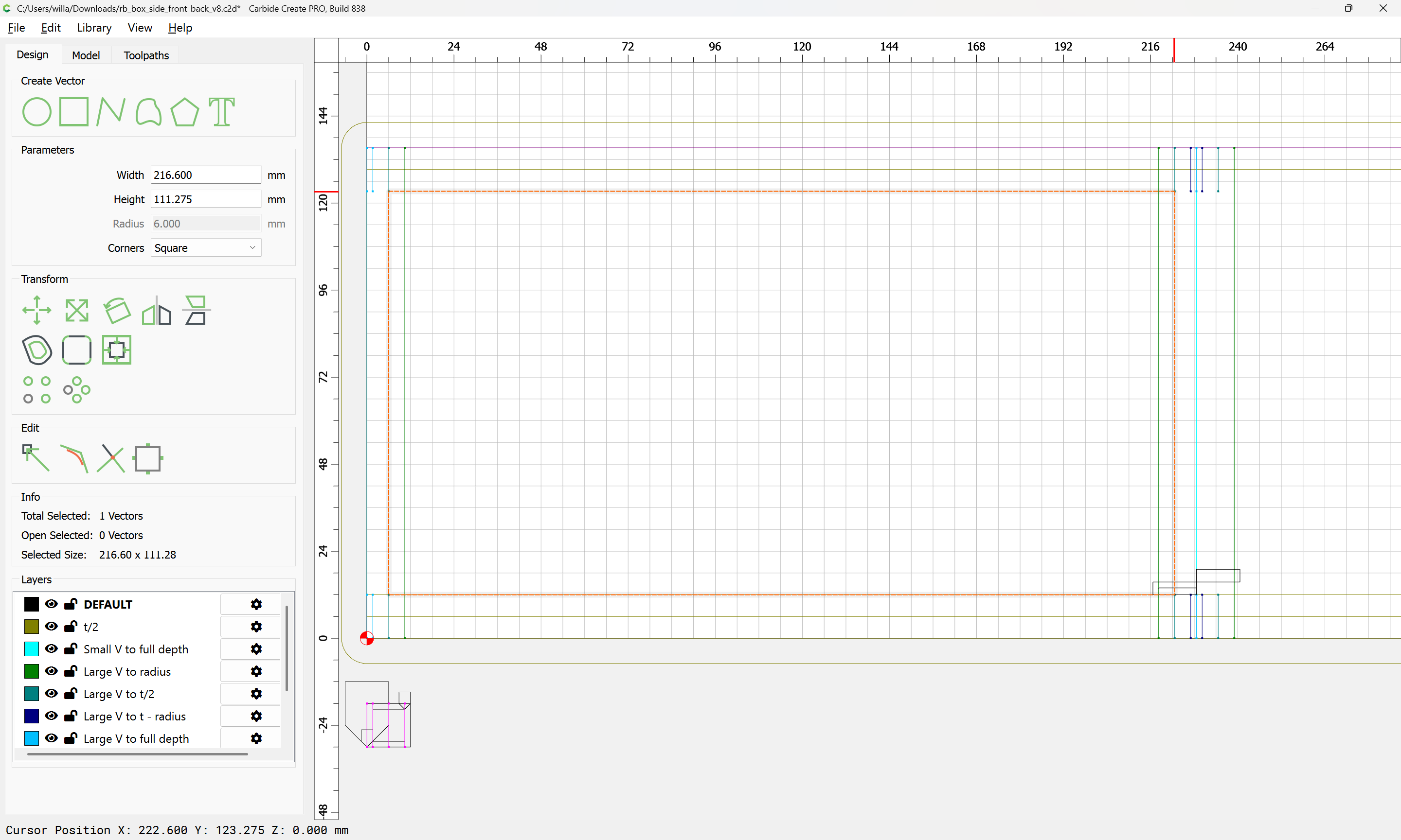 The lid is the easiest part to draw up, but probably should be cut last, after the box is fully cut out and glued up and cured — that way, the rabbet for the lid can be cut, the box test fit against it, then the dimensions adjusted until the desired fit is arrived at, this process may then be repeated for the outside dimensions of the lid to ensure that they match the box well.