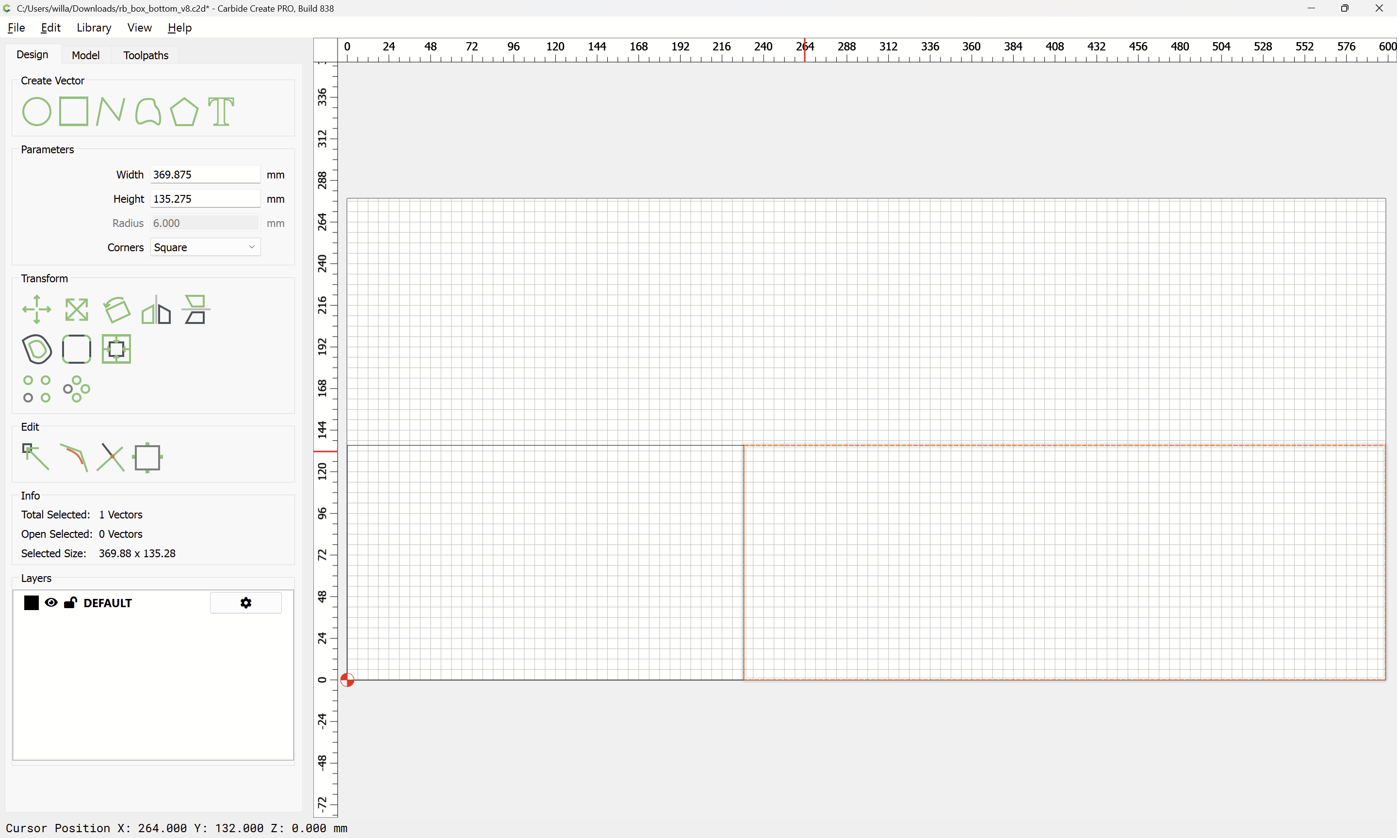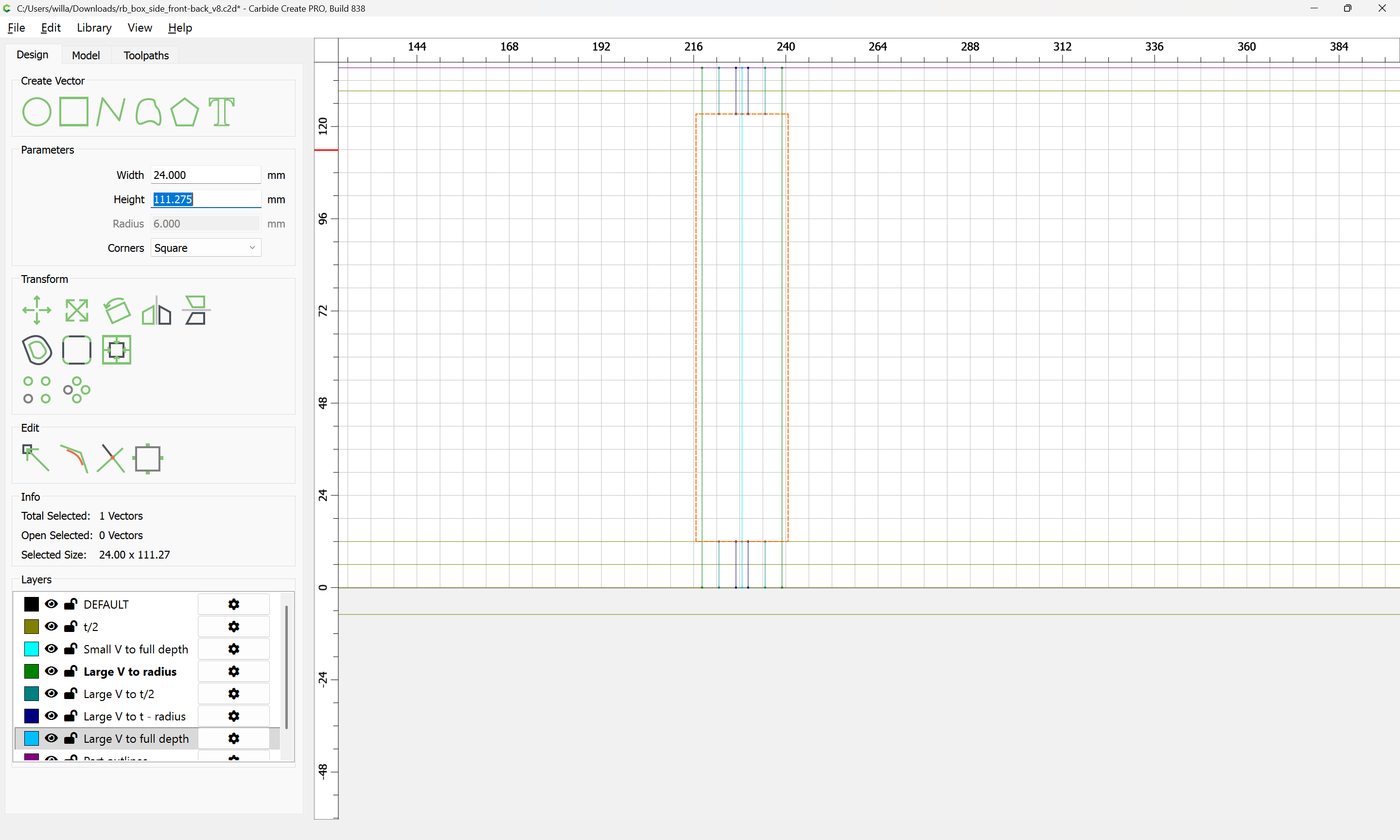 The front/back and the left/right sides are two pairs of parts which could be drawn up as a single pair, but since the stock is so large relative to the height of the box, duplicating the pair and cutting all 4 parts at once will be most efficient.