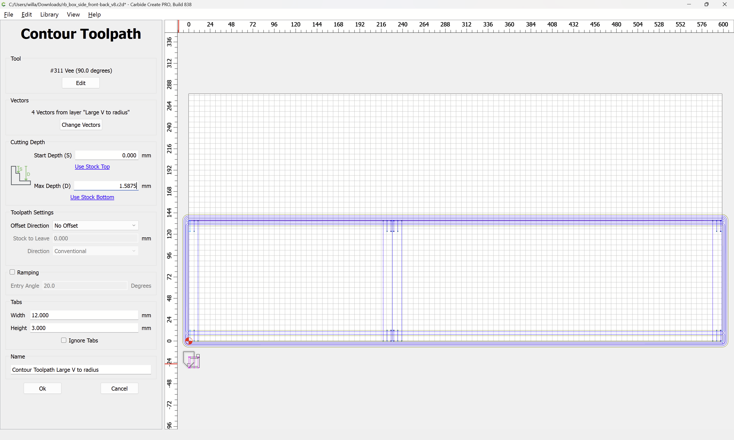 The cuts are most easily realized as filling a rectangle which is Stock Thickness wide for each side, and a bit more than Small V tool diameter tall, since that is 3.175mm, rounding up to 3.5mm is workable and results in a great deal of glue surface area.