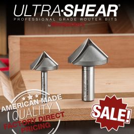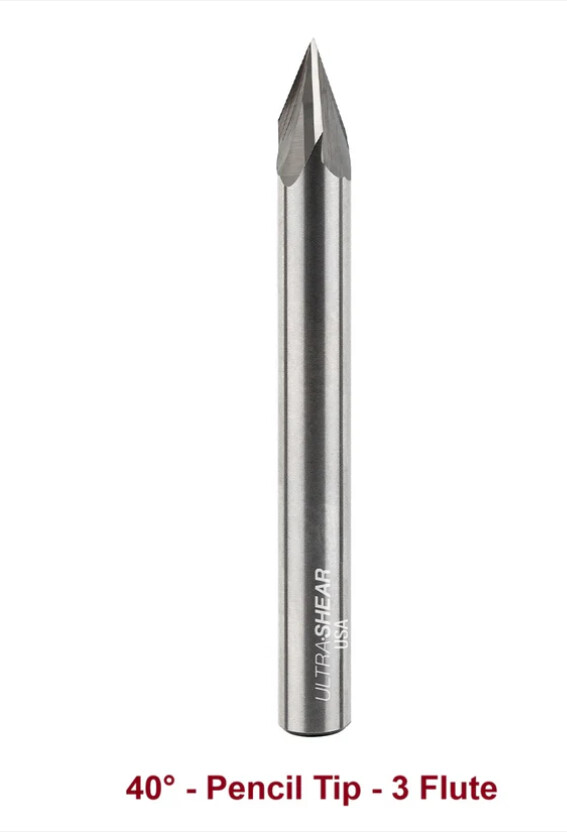 the ultra-shear bits are US-made, and have 1/4" shanks, 3-flute V-carve with a “blade” like cutting edge: piece of art if one asks me. Will probably be good to carve edge grain inlays.