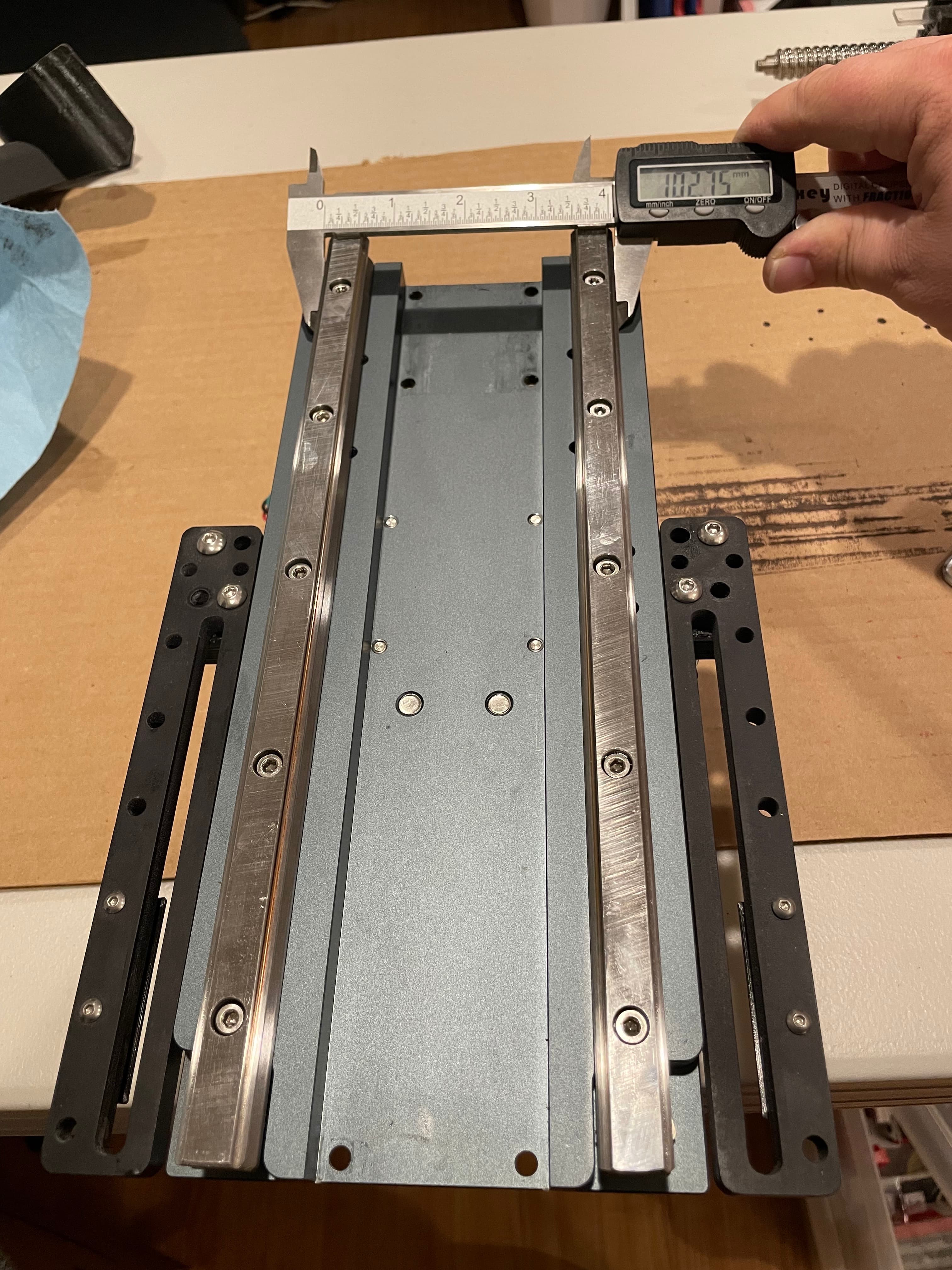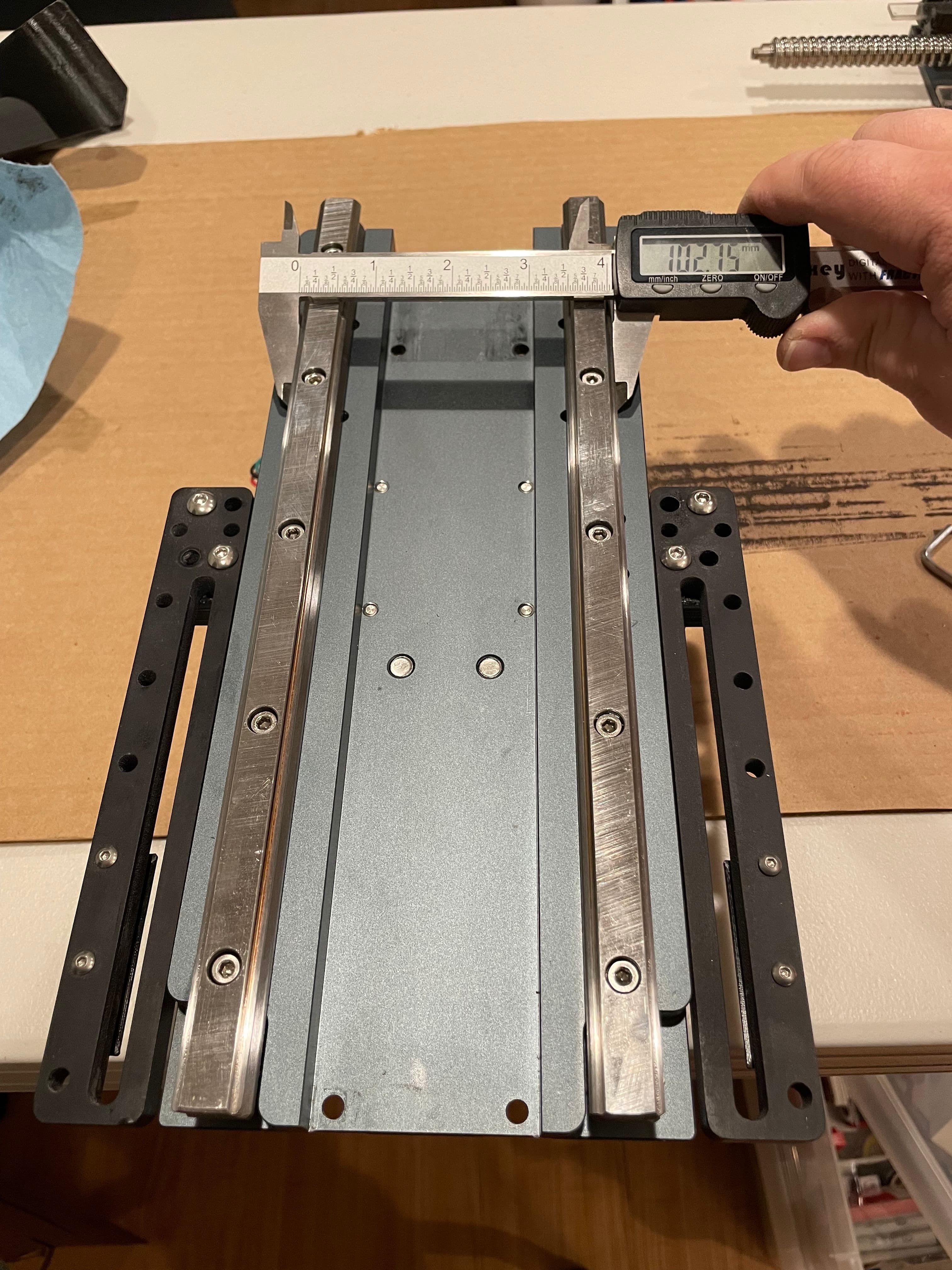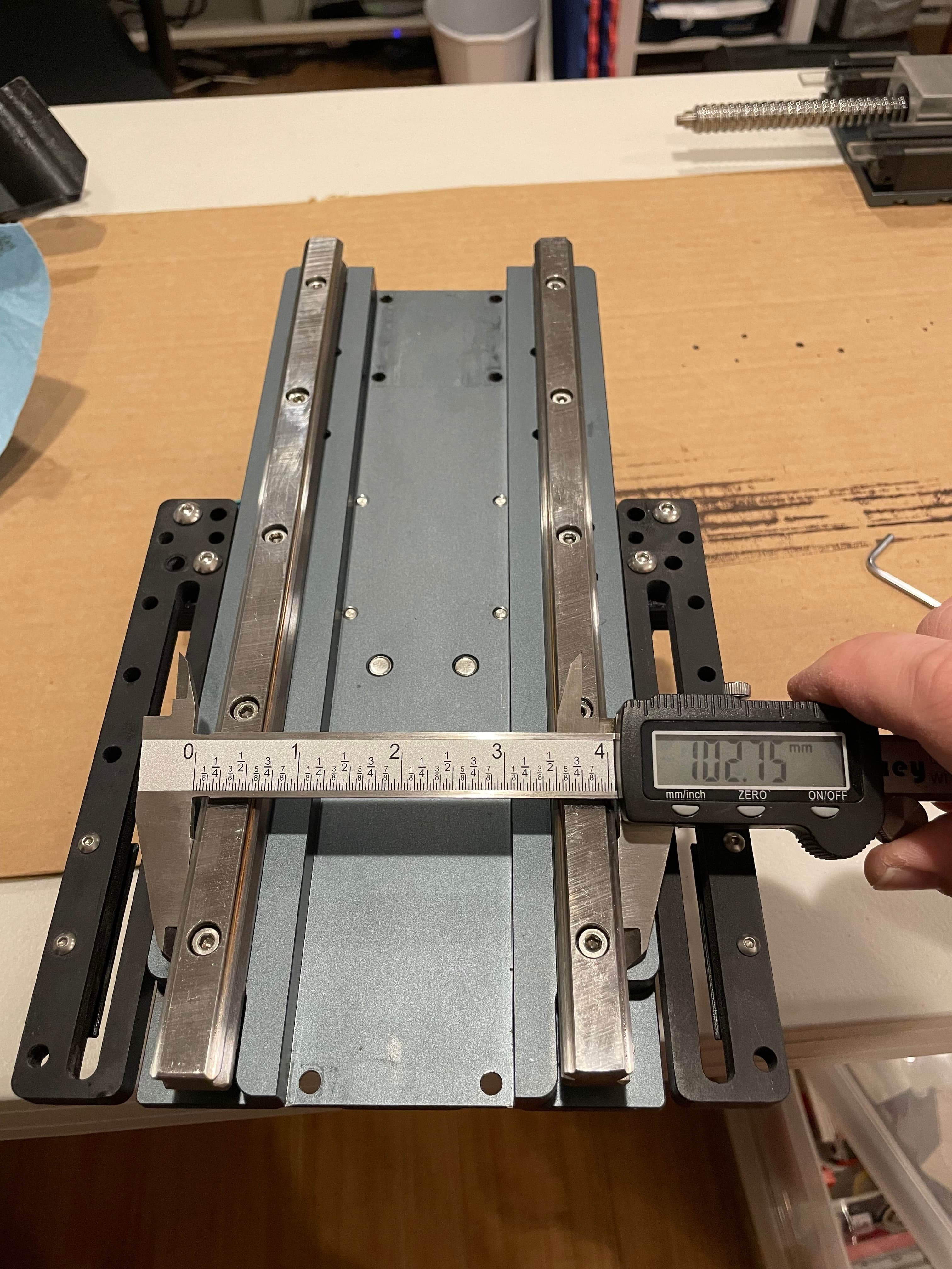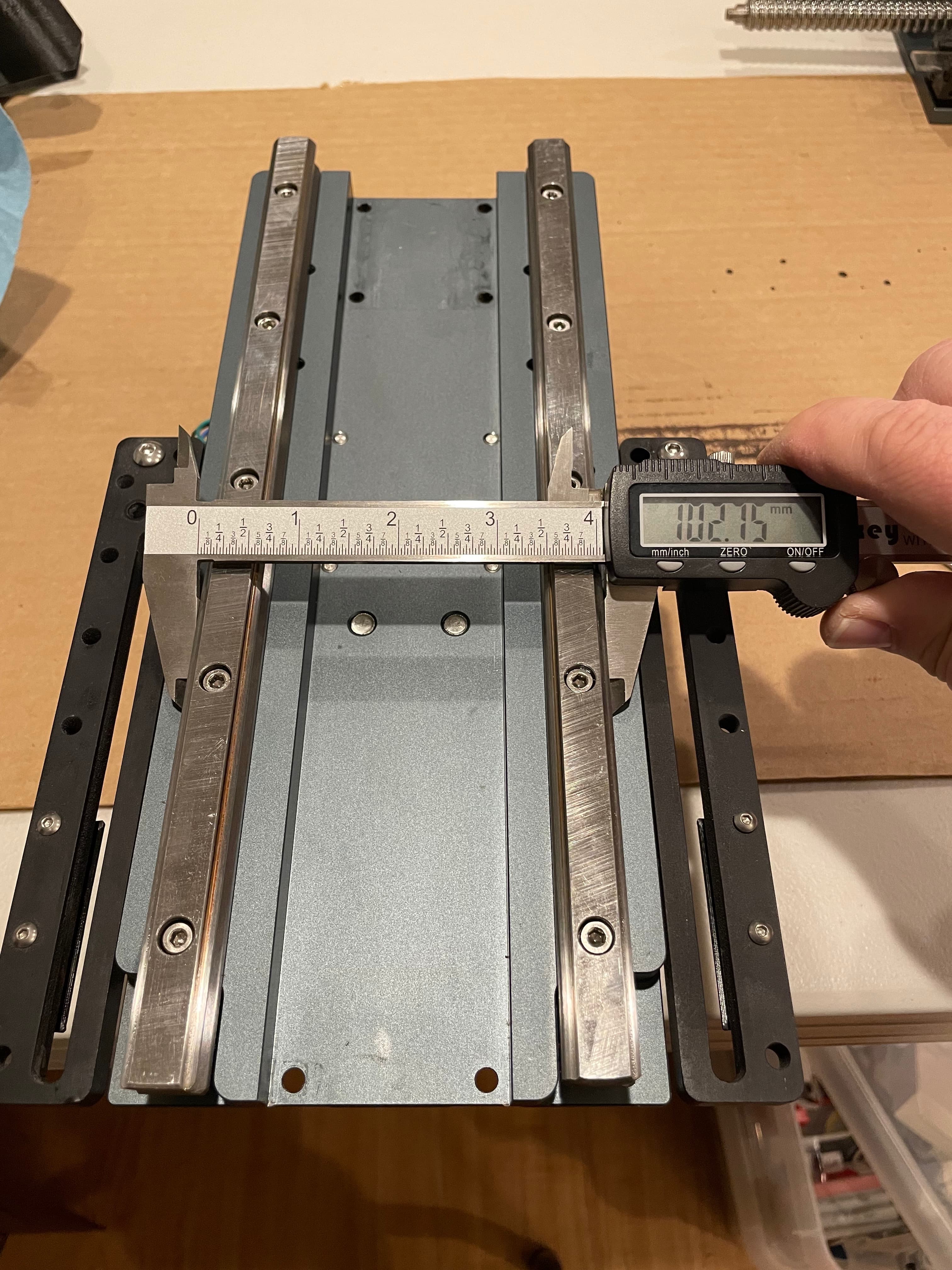 The next 5 photos (I measured at each bolt hole) show my initial rail measurements. This is how it was installed at the factory. There is a deviation of 0.35mm from top to bottom, getting wider as it goes down. This doesn’t seem like a lot to me, and I’m unsure of the lateral tolerances of these linear bearings, but apparently this was just too much askew for my setup (once again, I think the weight of my spindle is a contributing factor to possibly tighter tolerances being required).