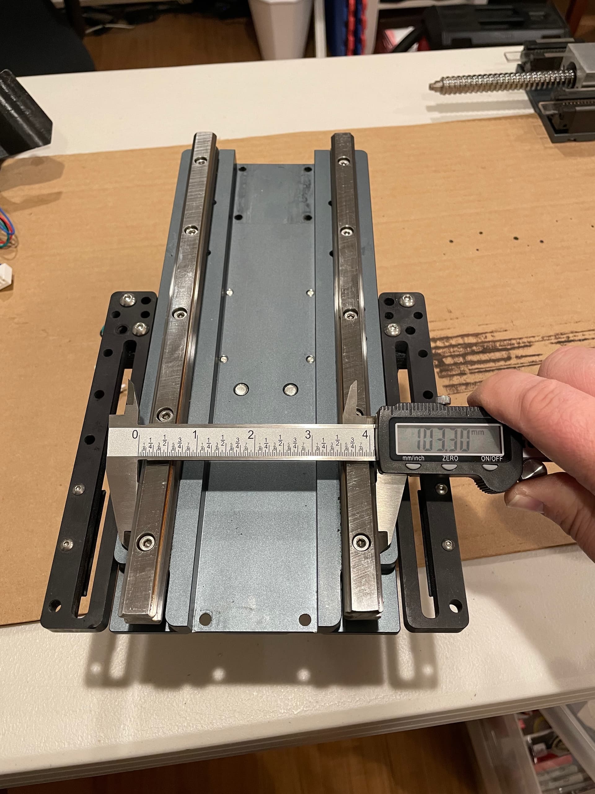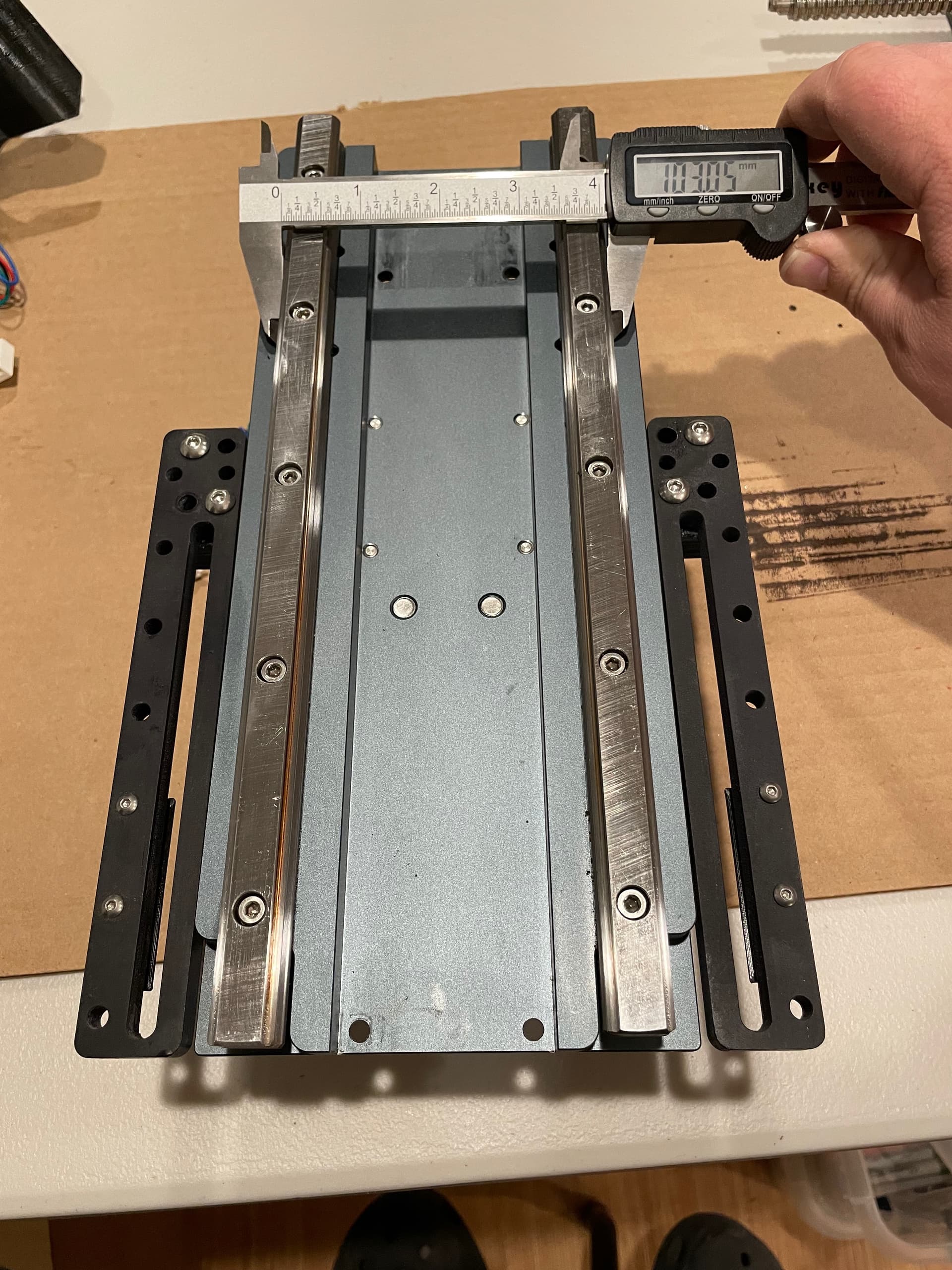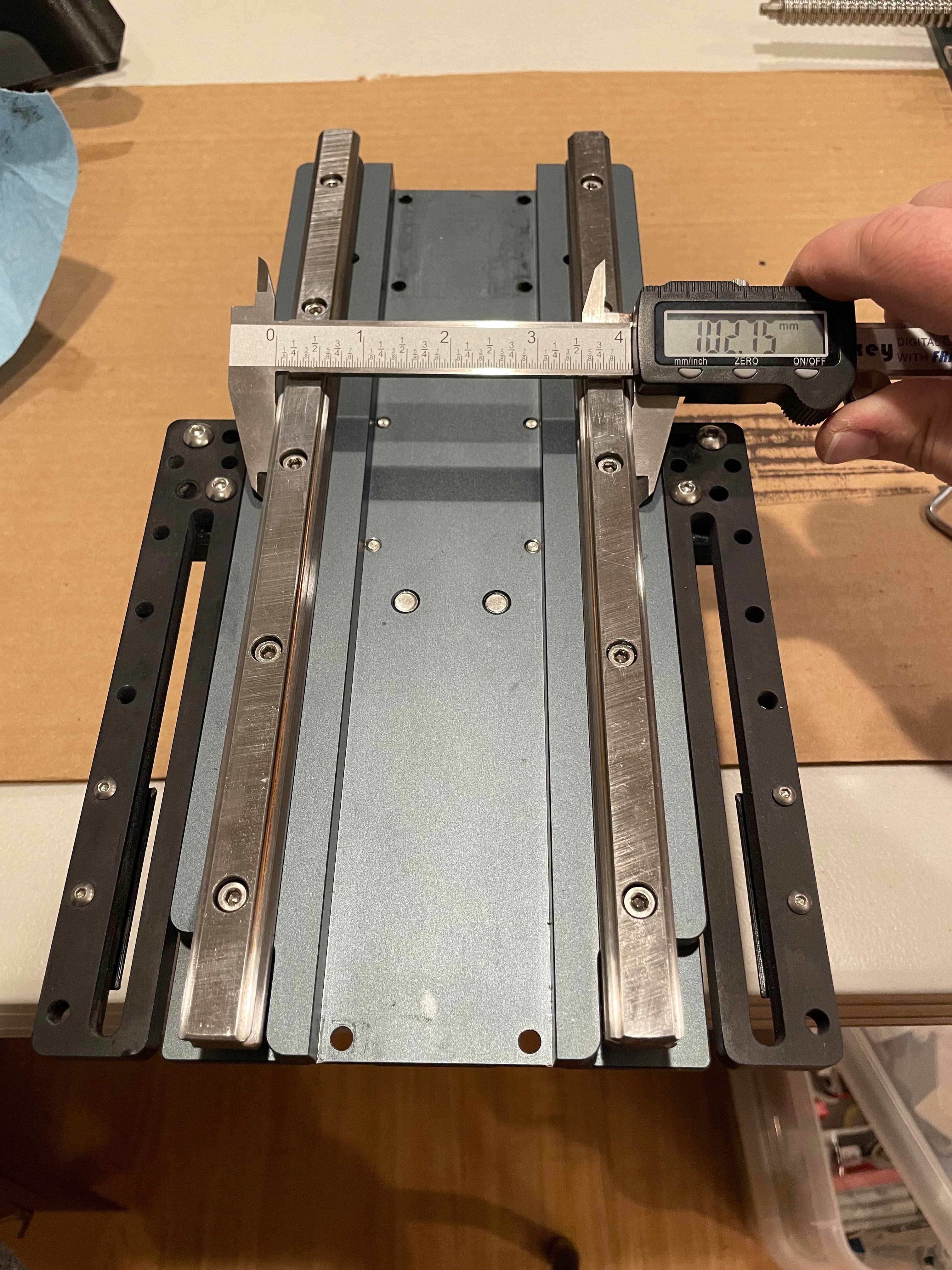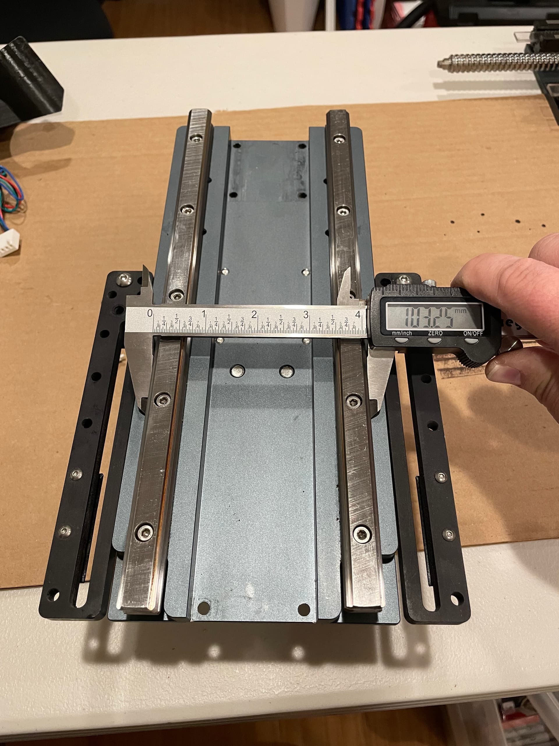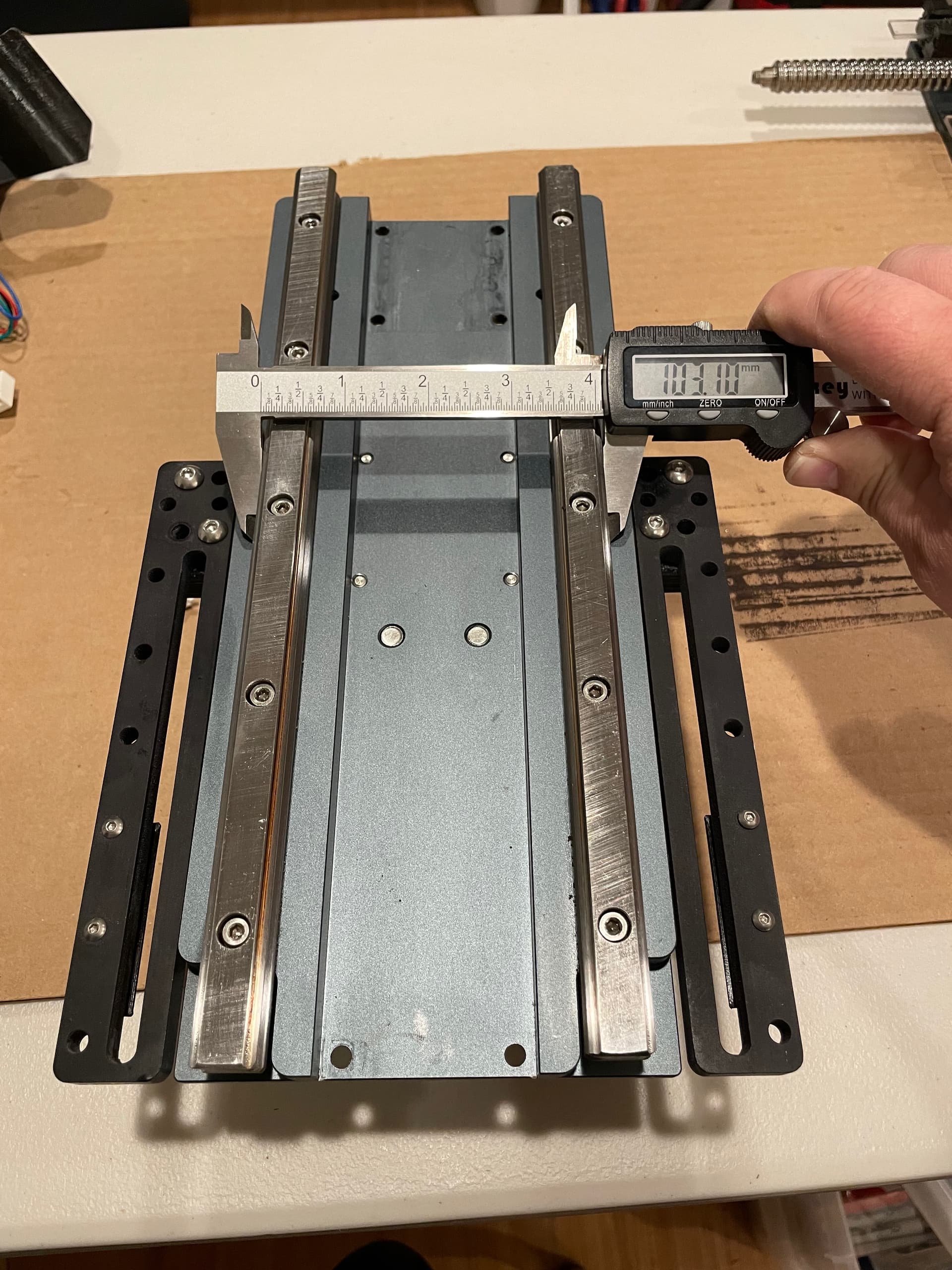 The next 5 photos (I measured at each bolt hole) show my initial rail measurements. This is how it was installed at the factory. There is a deviation of 0.35mm from top to bottom, getting wider as it goes down. This doesn’t seem like a lot to me, and I’m unsure of the lateral tolerances of these linear bearings, but apparently this was just too much askew for my setup (once again, I think the weight of my spindle is a contributing factor to possibly tighter tolerances being required).