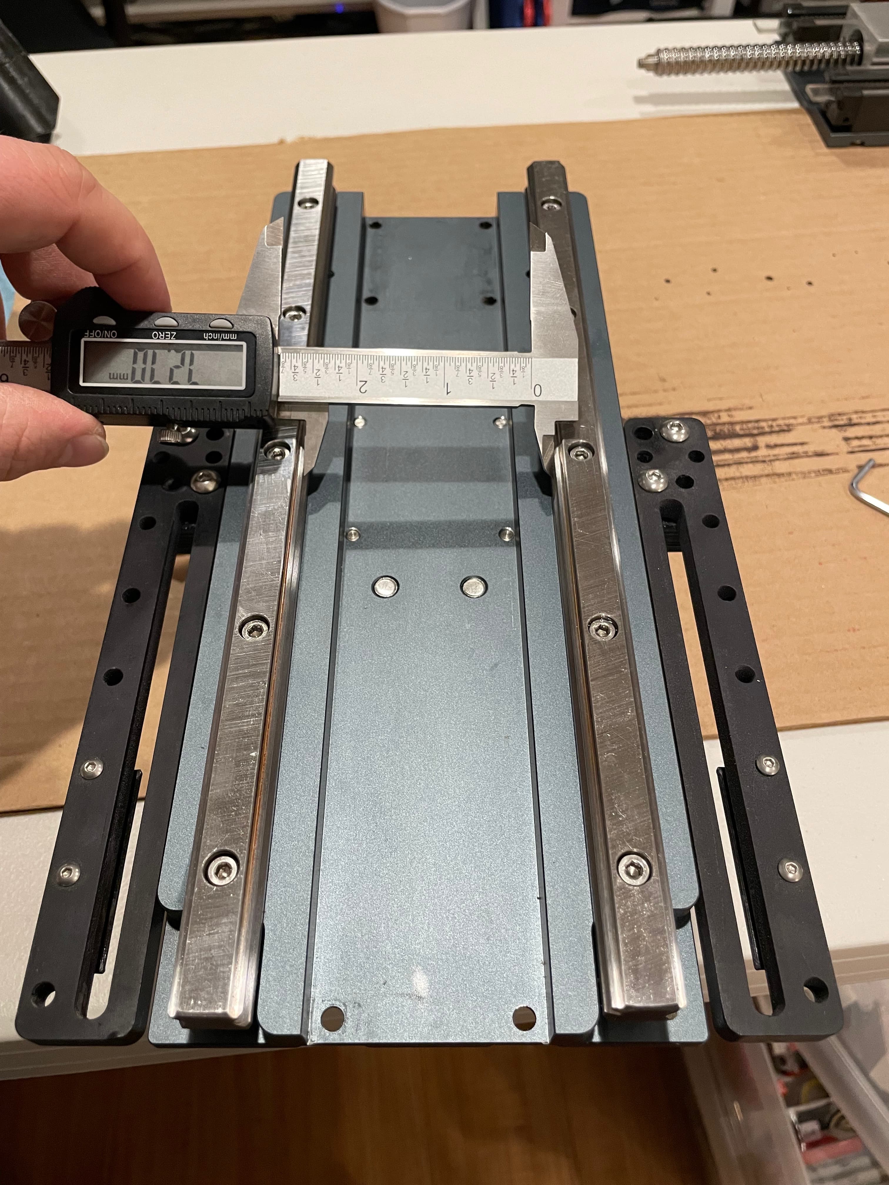 In all honesty, I had likely worn out my blue HDZ, or at least not properly maintained the bearings well enough for the environment, so the entire issue was probably the HDZ. But with a brand new HDZ 4, it just didn’t make sense why the issue wouldn’t go away. I’m unsure if the new HDZ 4 was assembled fully within Carbide3D’s tolerances before shipping, but some initial measuring caused me to believe that the linear rails were not parallel and that was causing some binding, specifically on fast accelerations. The binding and skipped steps (like if the carriage had just hit a solid object and wouldn’t stop skipping steps until the causing motion command went away or was reverse) happened randomly up and down the range of the HDZ, without much regard to whether it was traveling up or down, and was even happening during manual fast jogging. It is important to note that this minute non-parallelism likely would go unnoticed with a lighter spindle, but with a 2.2kw spindle, the mass and leverage made it more susceptible to binding on non-parallel rails.