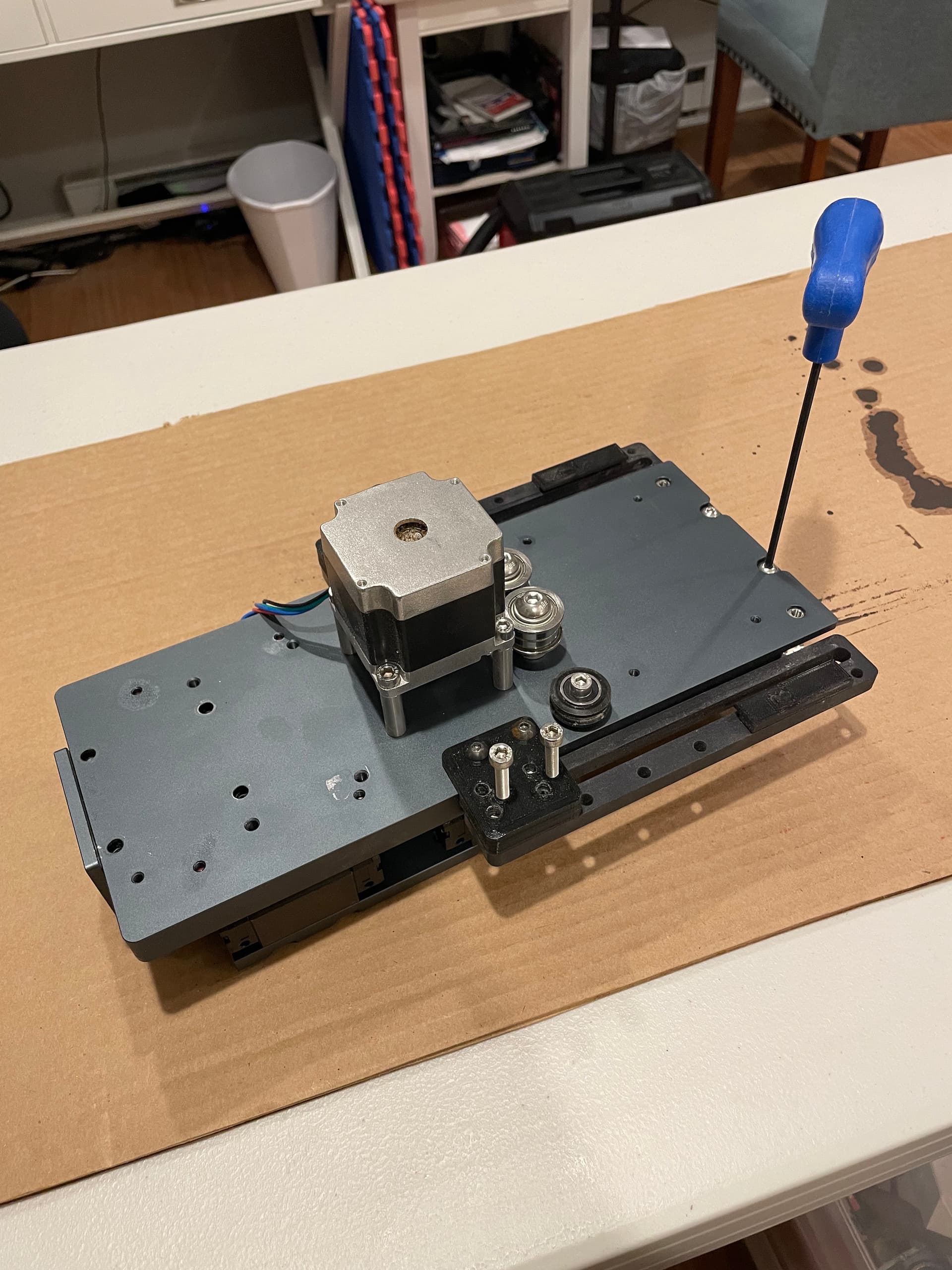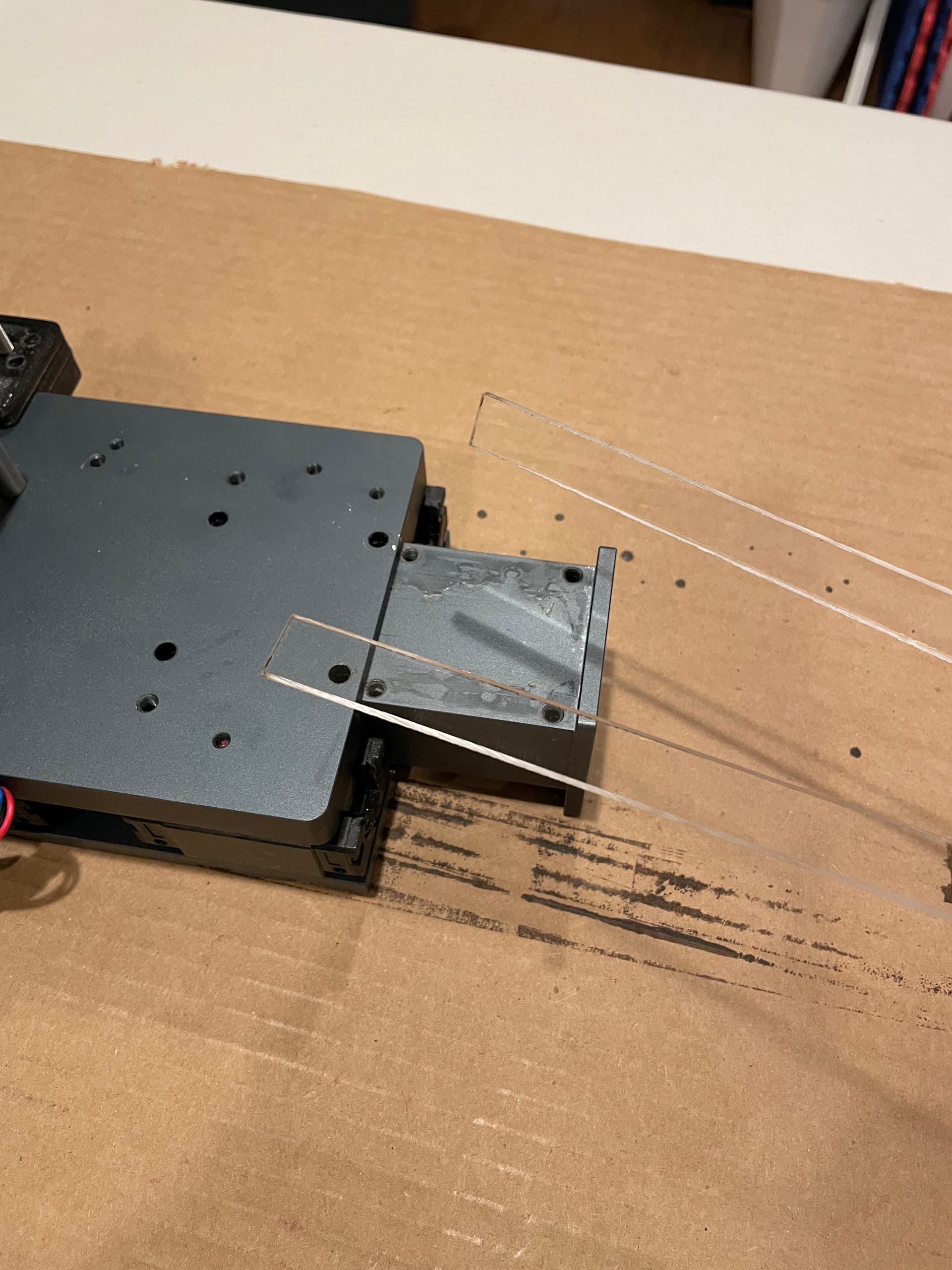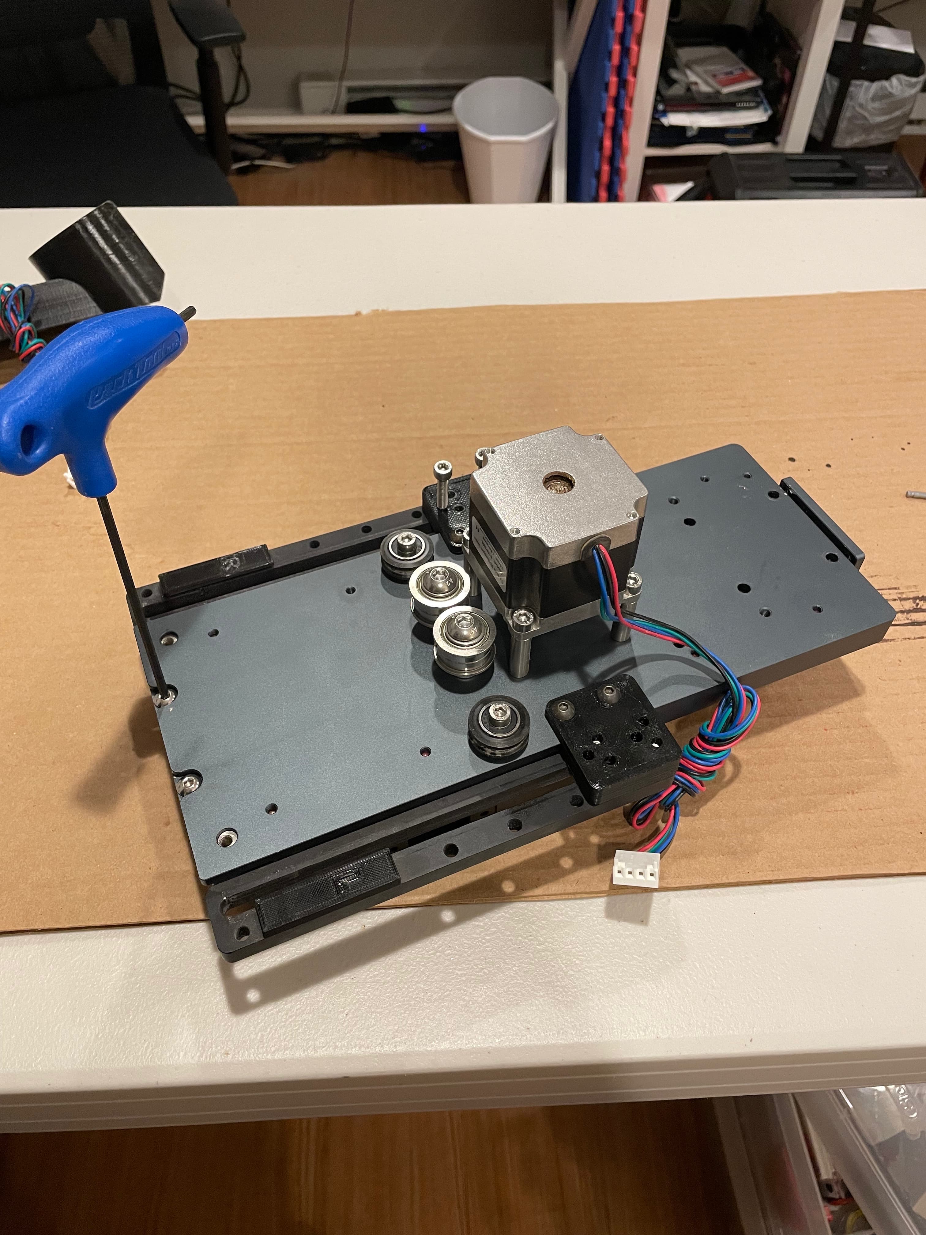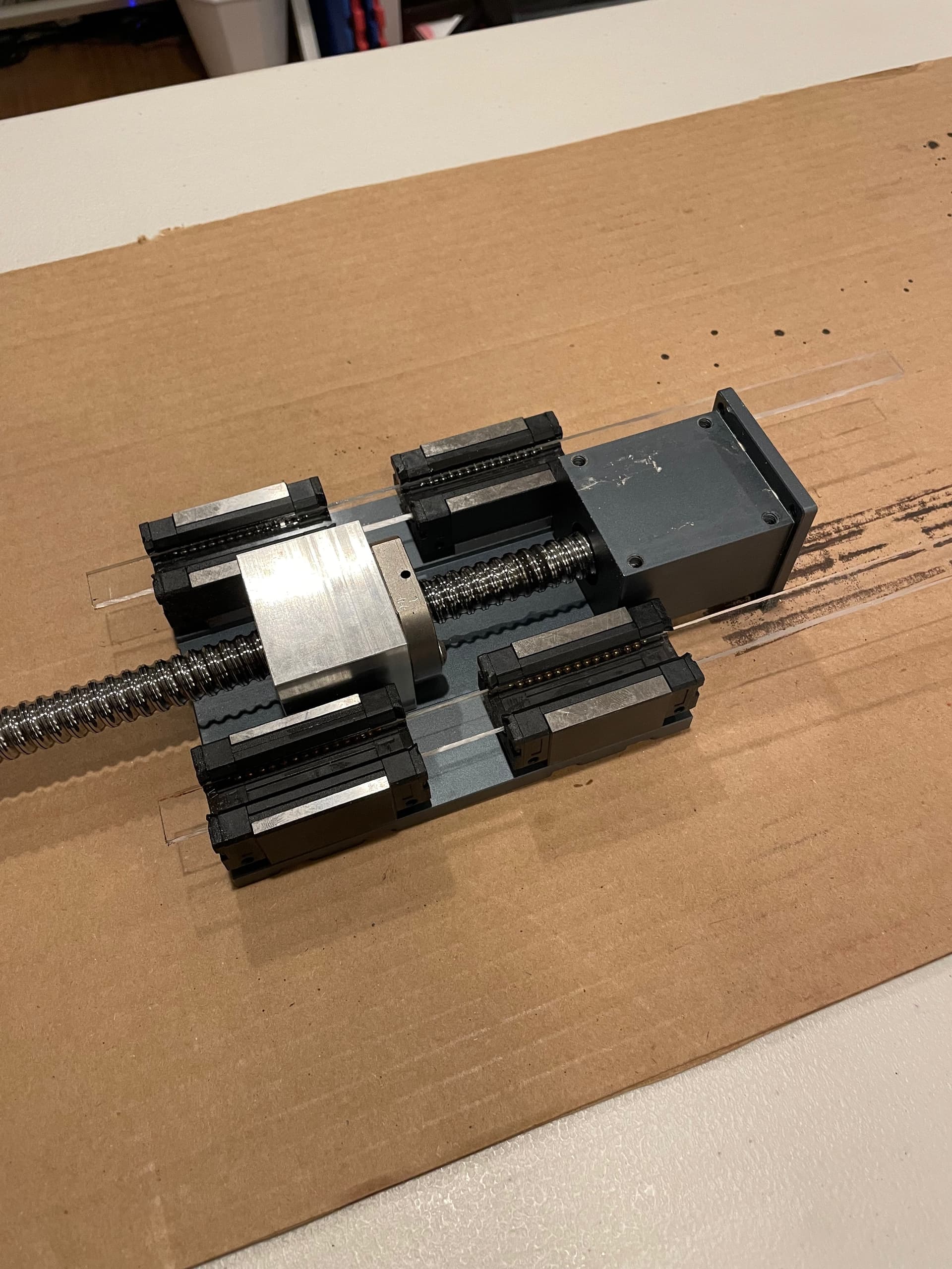 Disclaimer: Simply sliding the linear bearings off of the linear rails will cause a mess of loose ball bearings to fall out and probably cause many expletives to come out of your mouth. Use some sort of a carriage loader/bearing retainer. I tried to 3D print one, but wasn’t successful in finding the exact profile for these linear rails, so I just ripped some 1/8" thick polycarbonate down to about 15mm wide and used that instead.