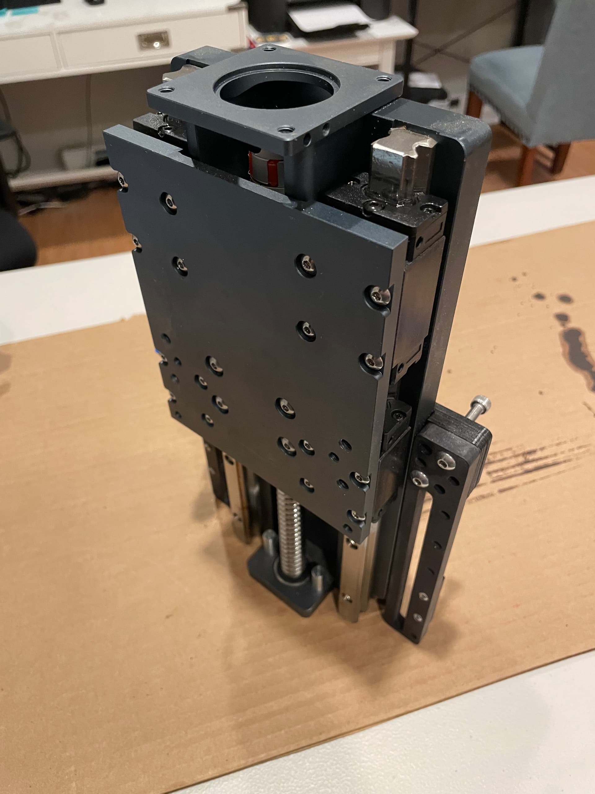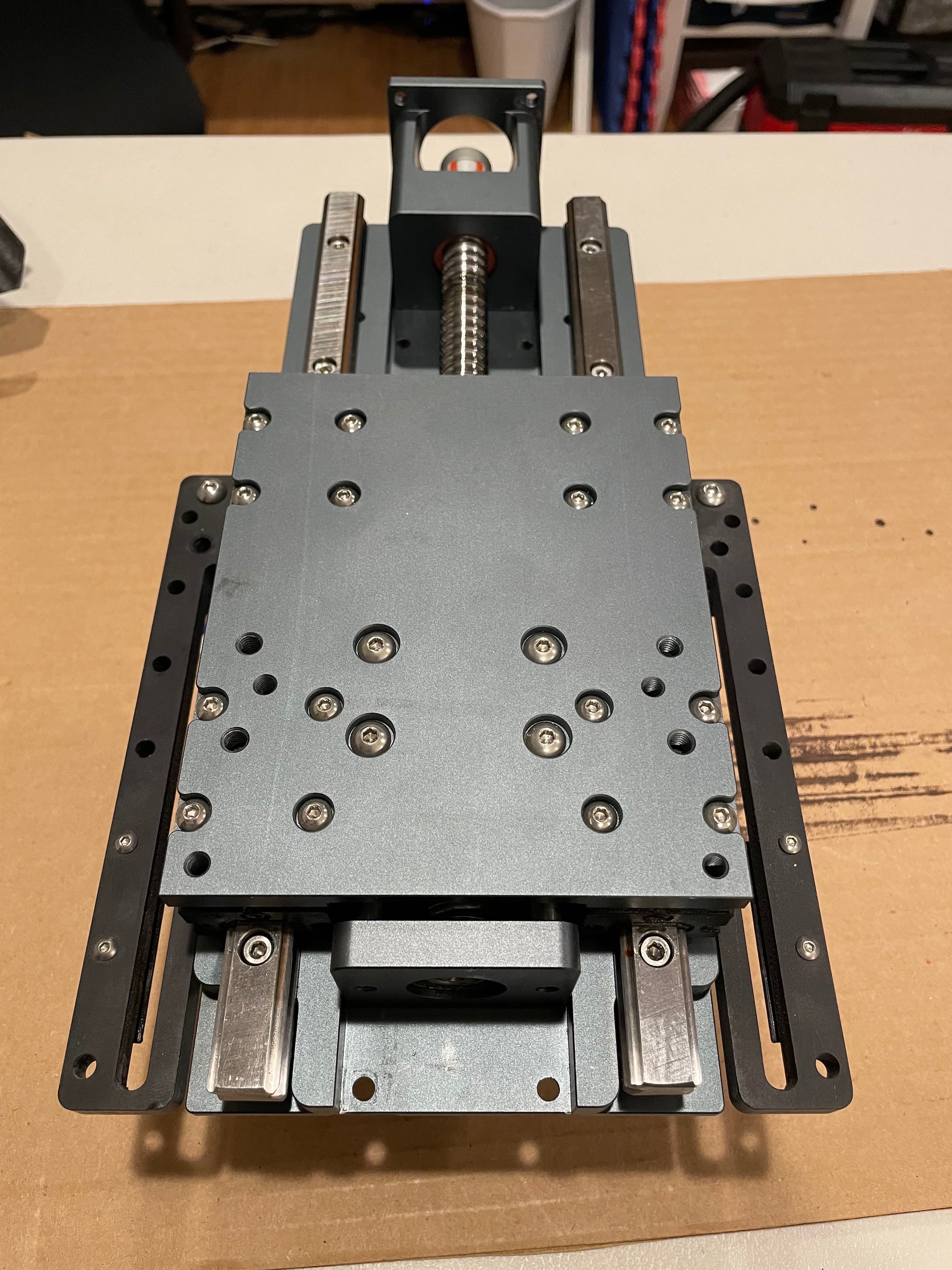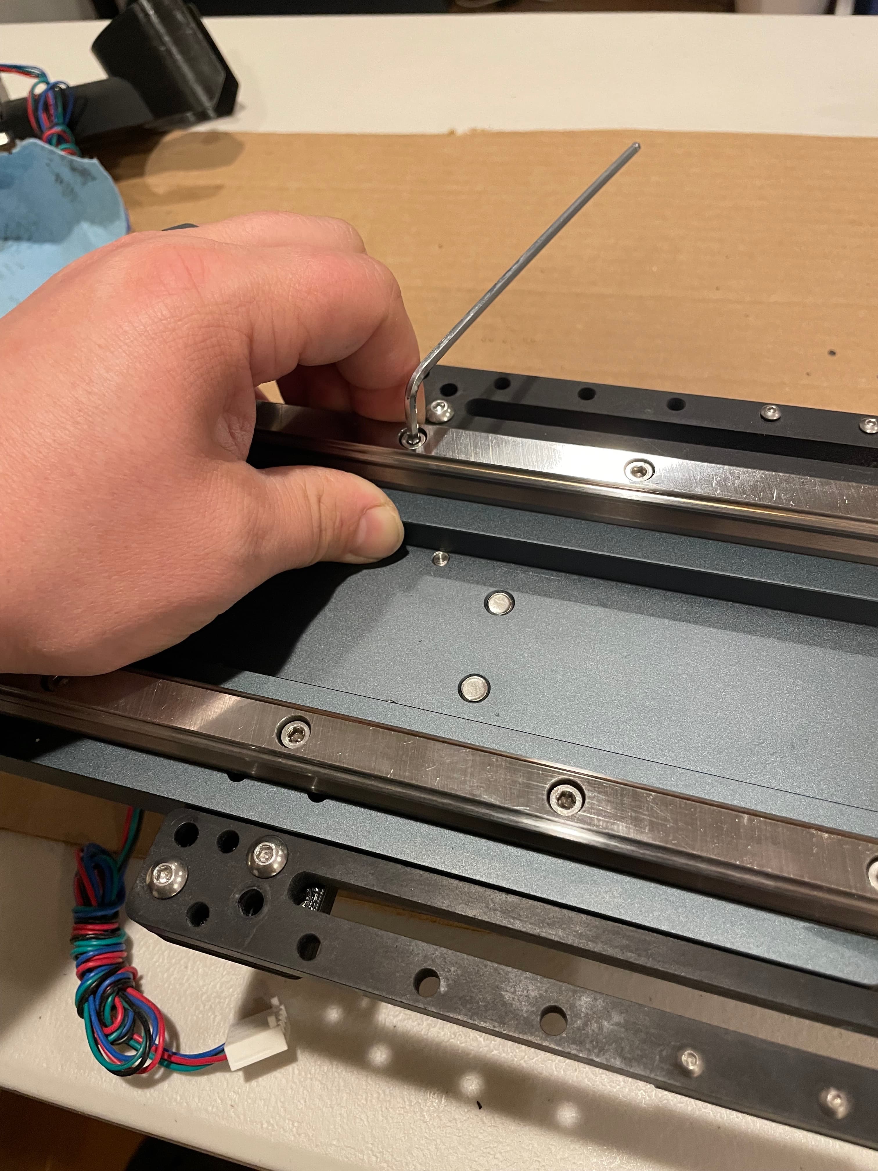 The HDZ 4 does not allow access to all of the linear rail bolts without completely removing the carriage. So to start, Carbide3D was gracious enough to walk me through a strip down and rebuild of the HDZ as far as could be done without removing the carriage from the rails. This basically meant loosening the linear bearings from the Z plate, cycling up and down a few times by hand, and snugging them back up. This ensured that the bearings were aligned to each rail, but didn’t resolve the issue that the distance between the rails was not consistent. But after this attempt of bearing alignment didn’t correct the issue, I went on to a more complete rebuild on my own, to which I’ve documented below.