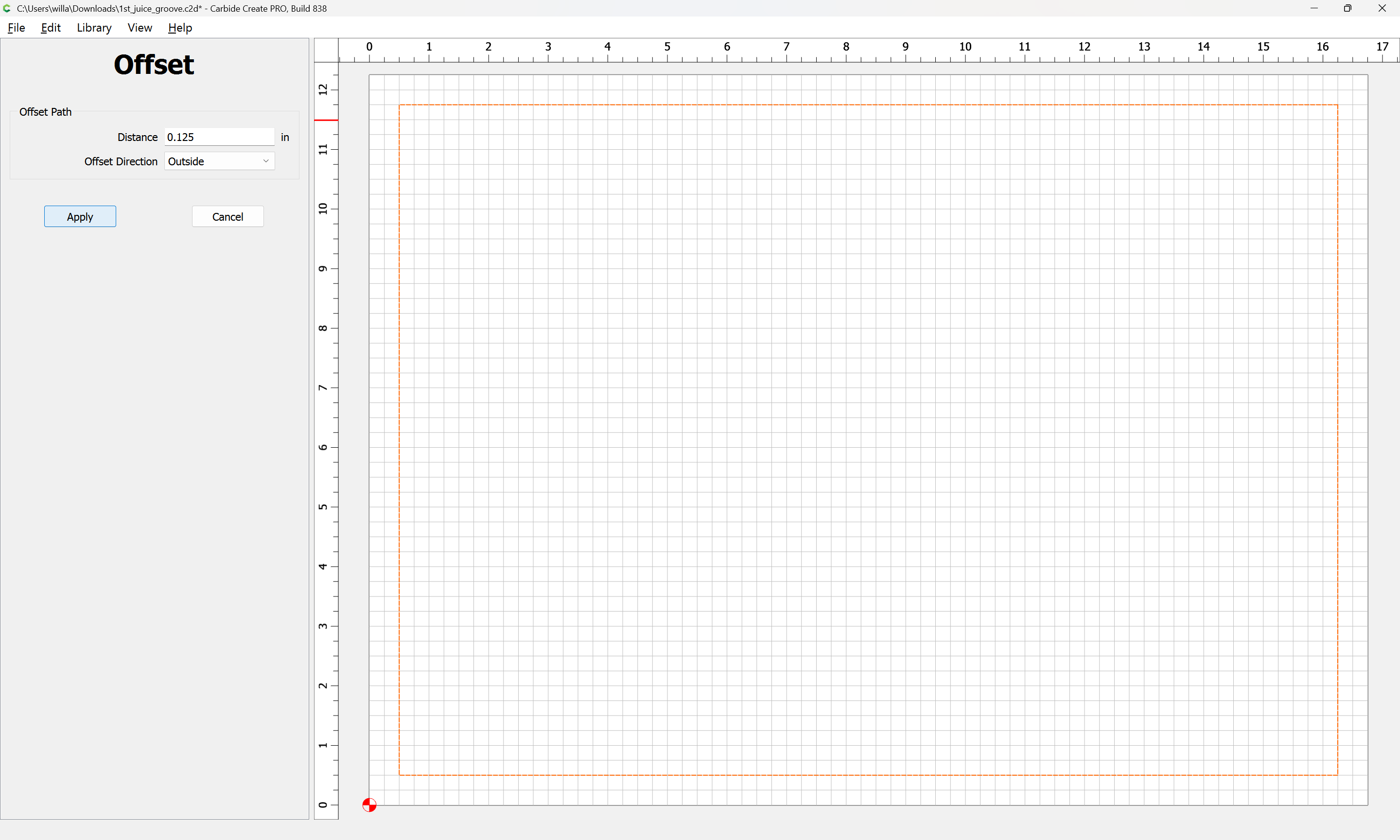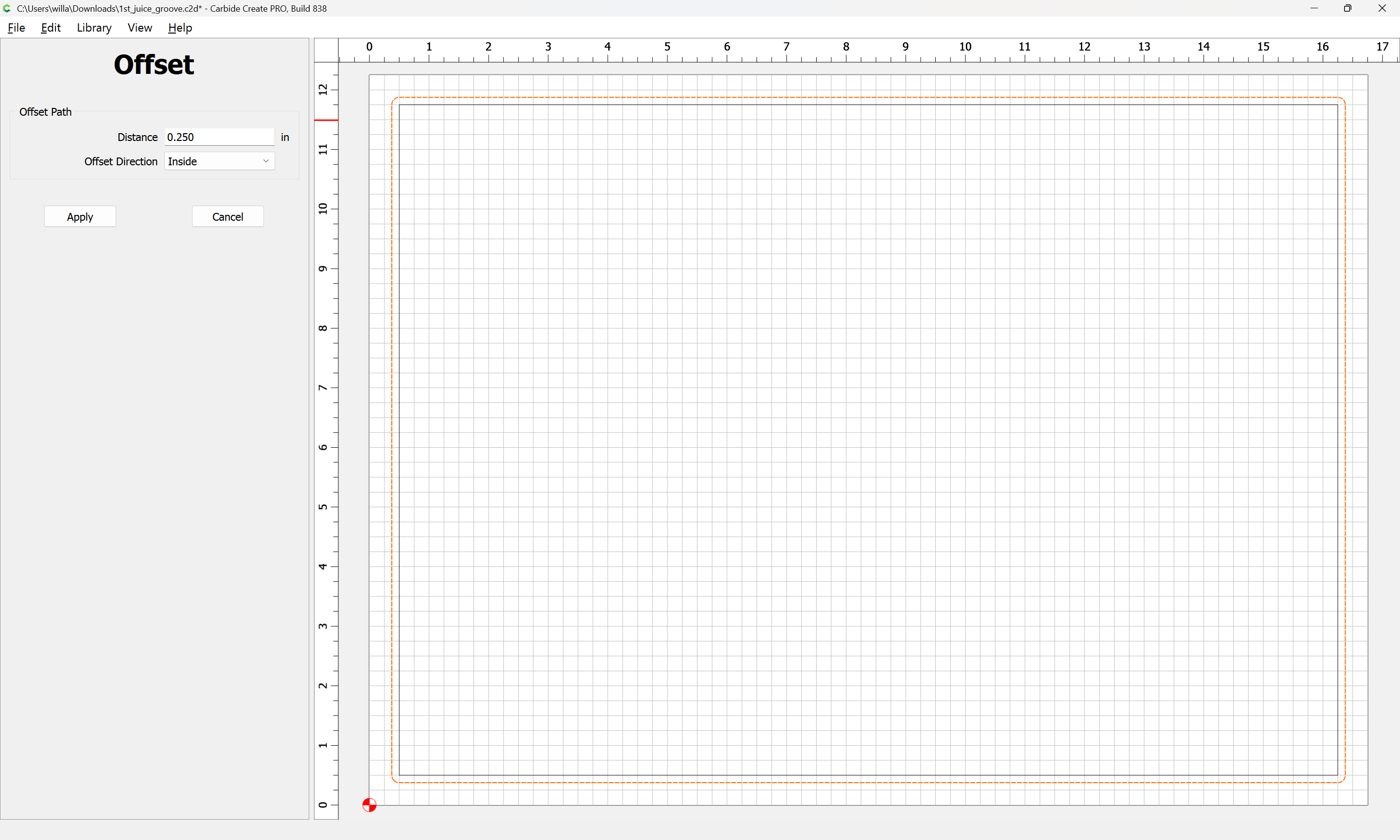 This has happened twice previously. The wood is squared I checked. In case it is not clear in the picture, the top portion of the board is much thinner from the edge to the juice groove than the bottom. The bottom measures .5 inches from the edge while the top measures only .25 inches. I’m attaching the file that I am using. I’m not using an offset.