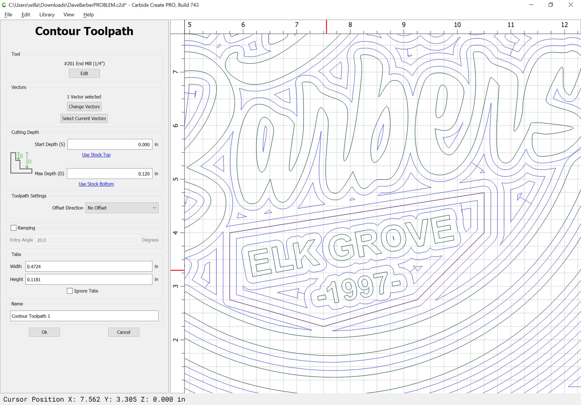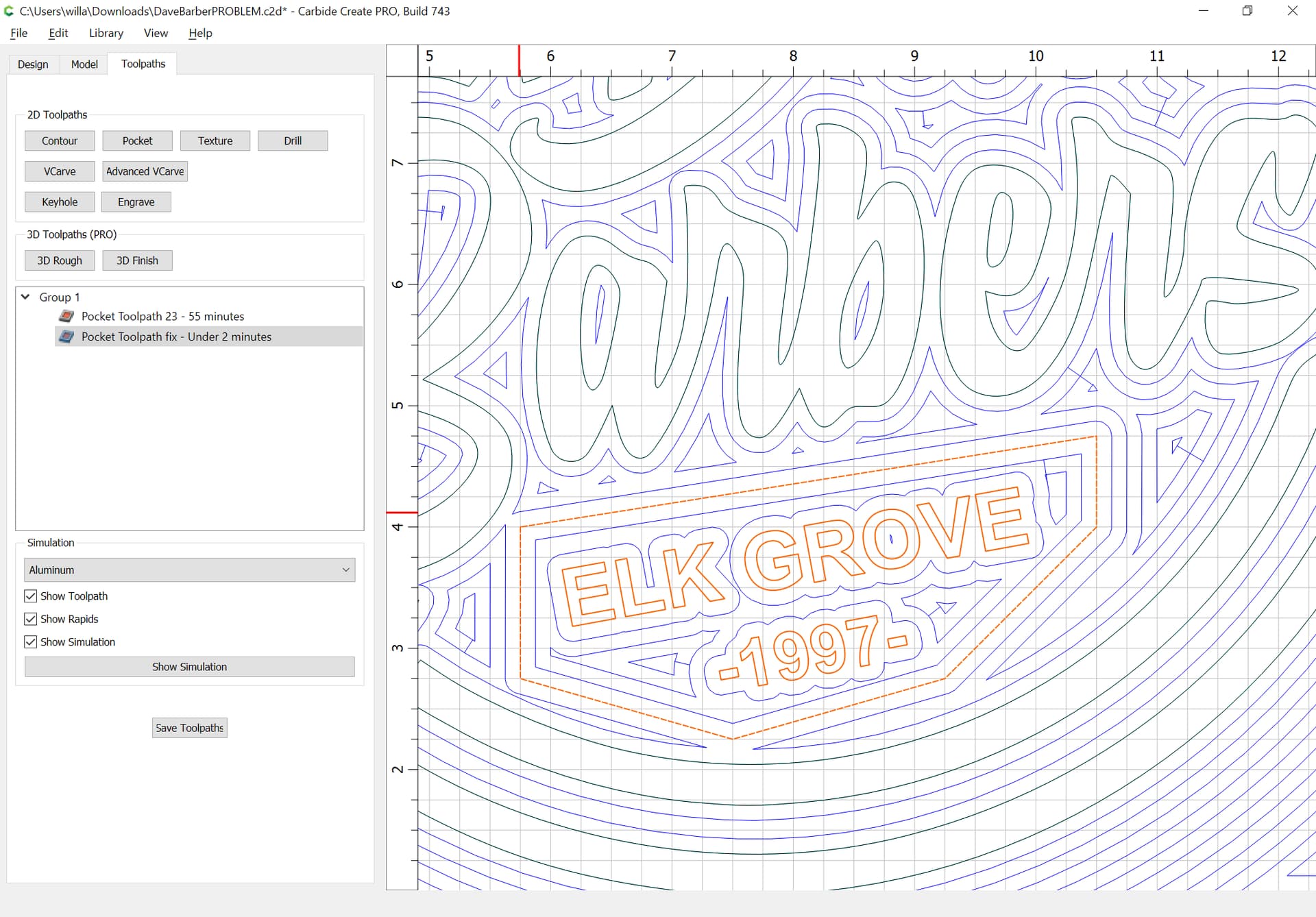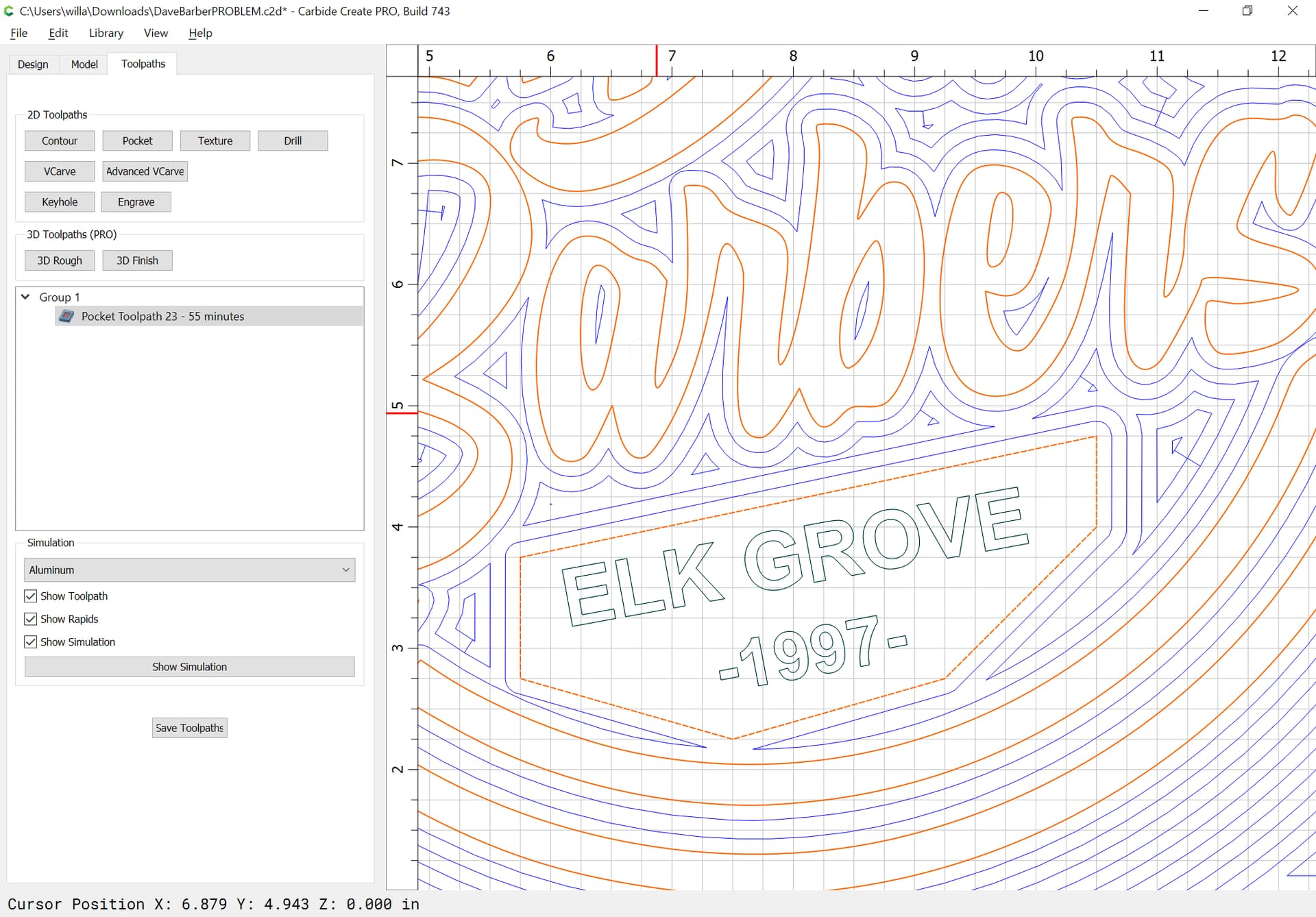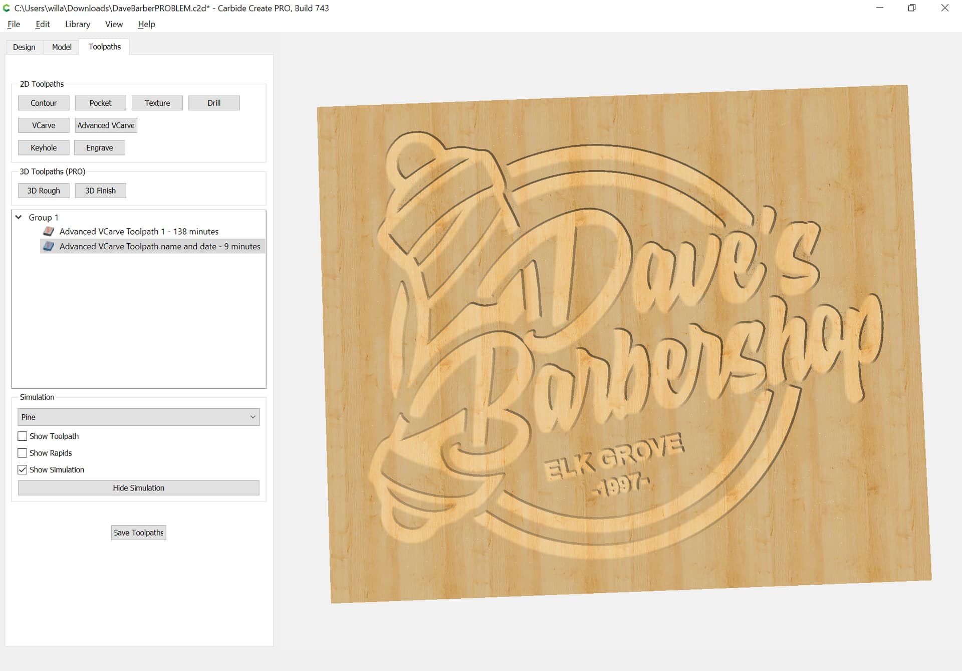 I started with a .png, traced it in Inkscape. The city and date didn’t translate so well so I deleted it and added it back with Carbide Create. Everything is grouped but the pocket feature mows down the city/date in the simulation.