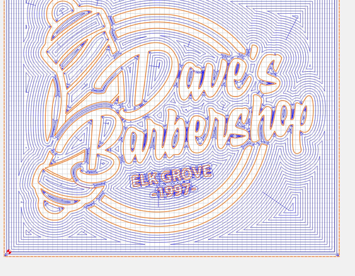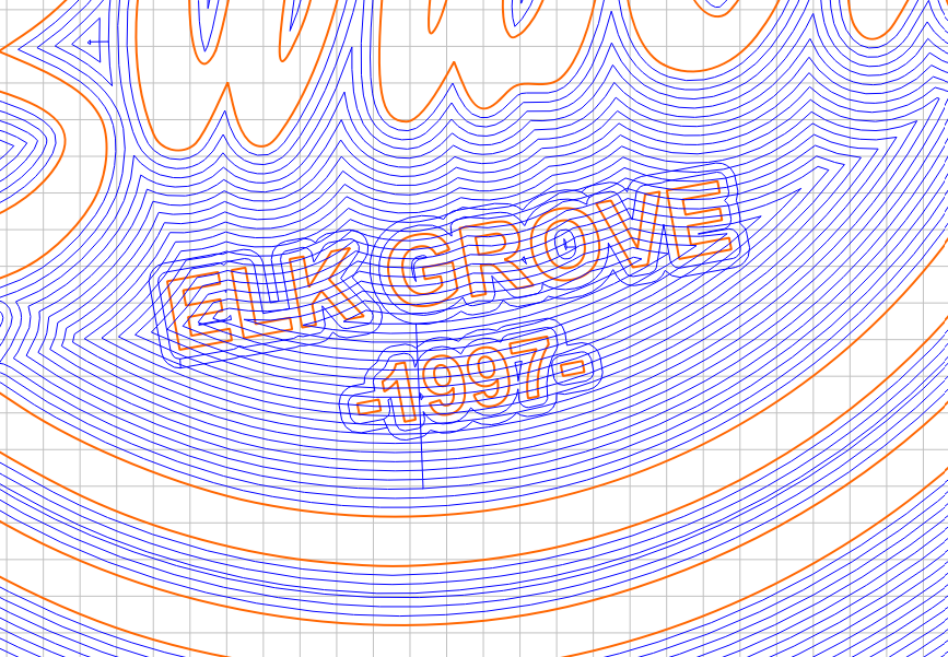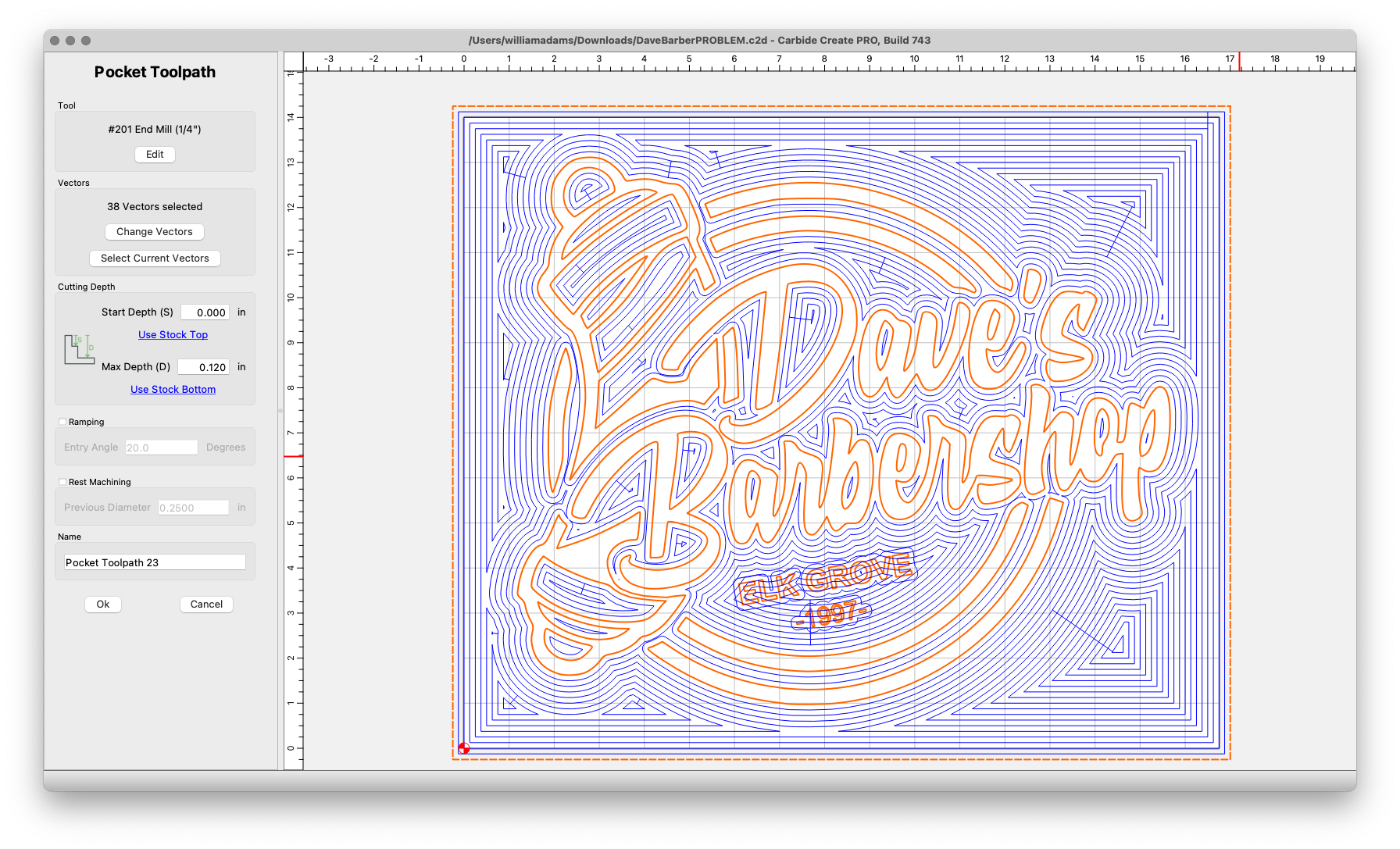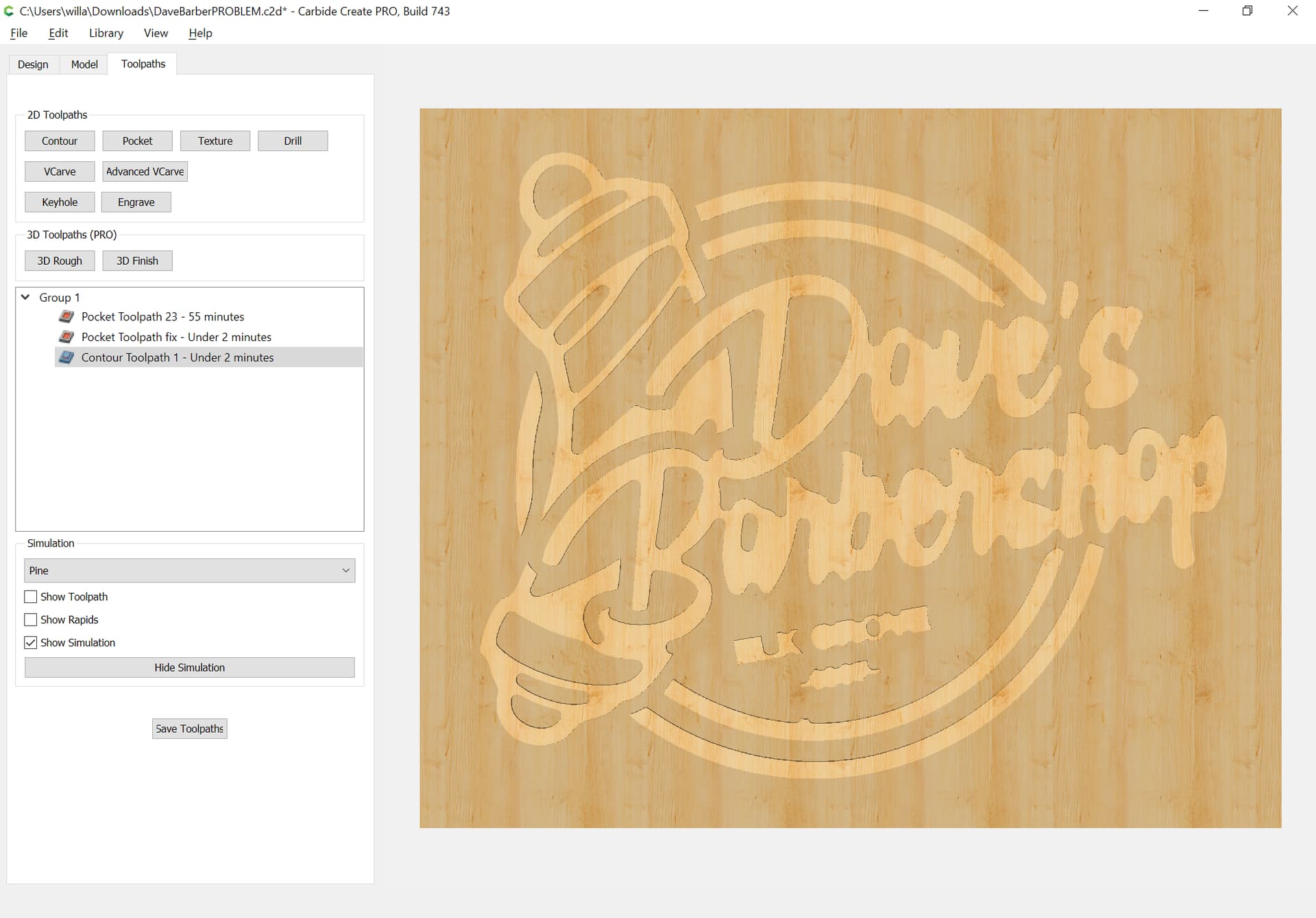 I started with a .png, traced it in Inkscape. The city and date didn’t translate so well so I deleted it and added it back with Carbide Create. Everything is grouped but the pocket feature mows down the city/date in the simulation.