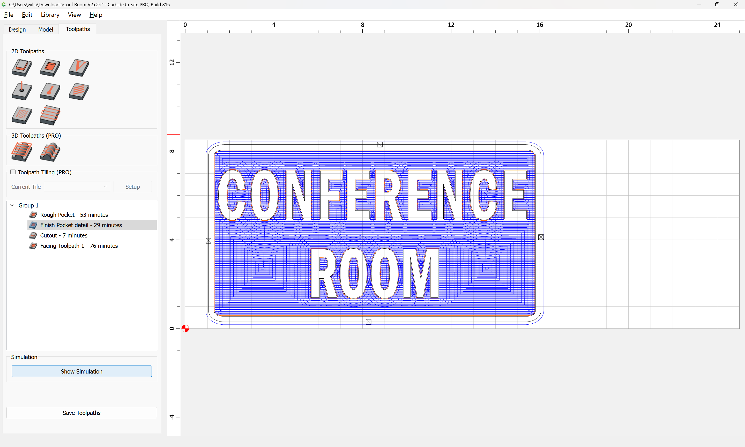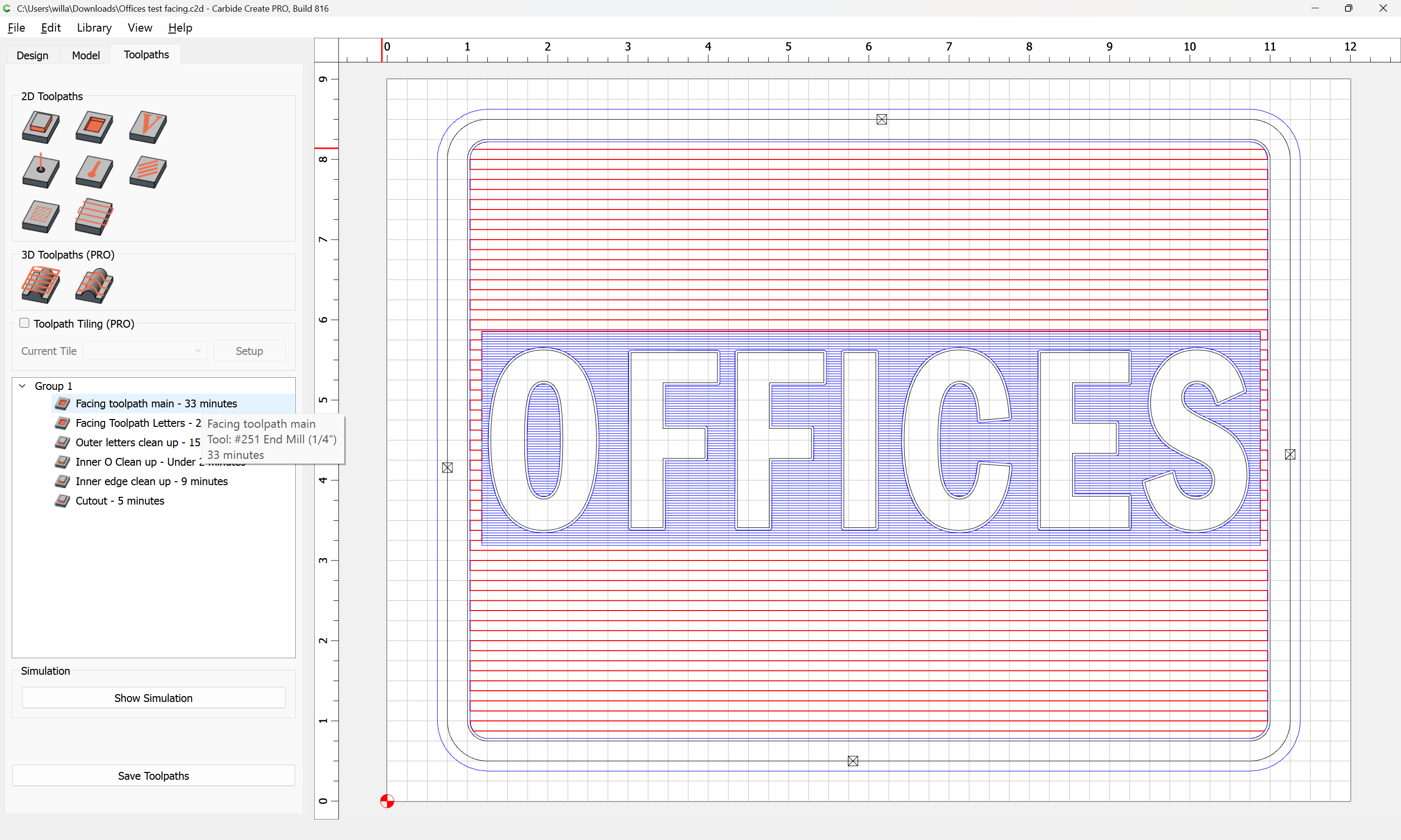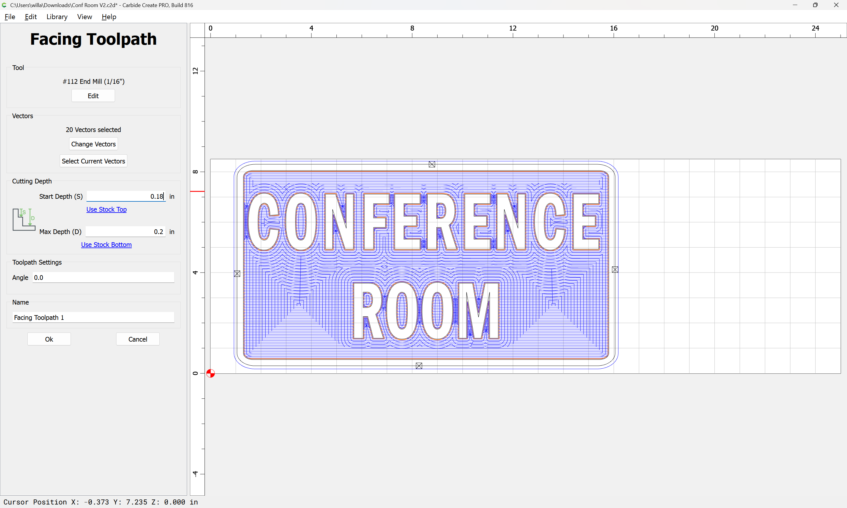I have since added a 1/32 inch inner and outer offsets around the letters and added a rectangle containing all of them and created an additional facing toolpath within the rectangle to minimize cut time.