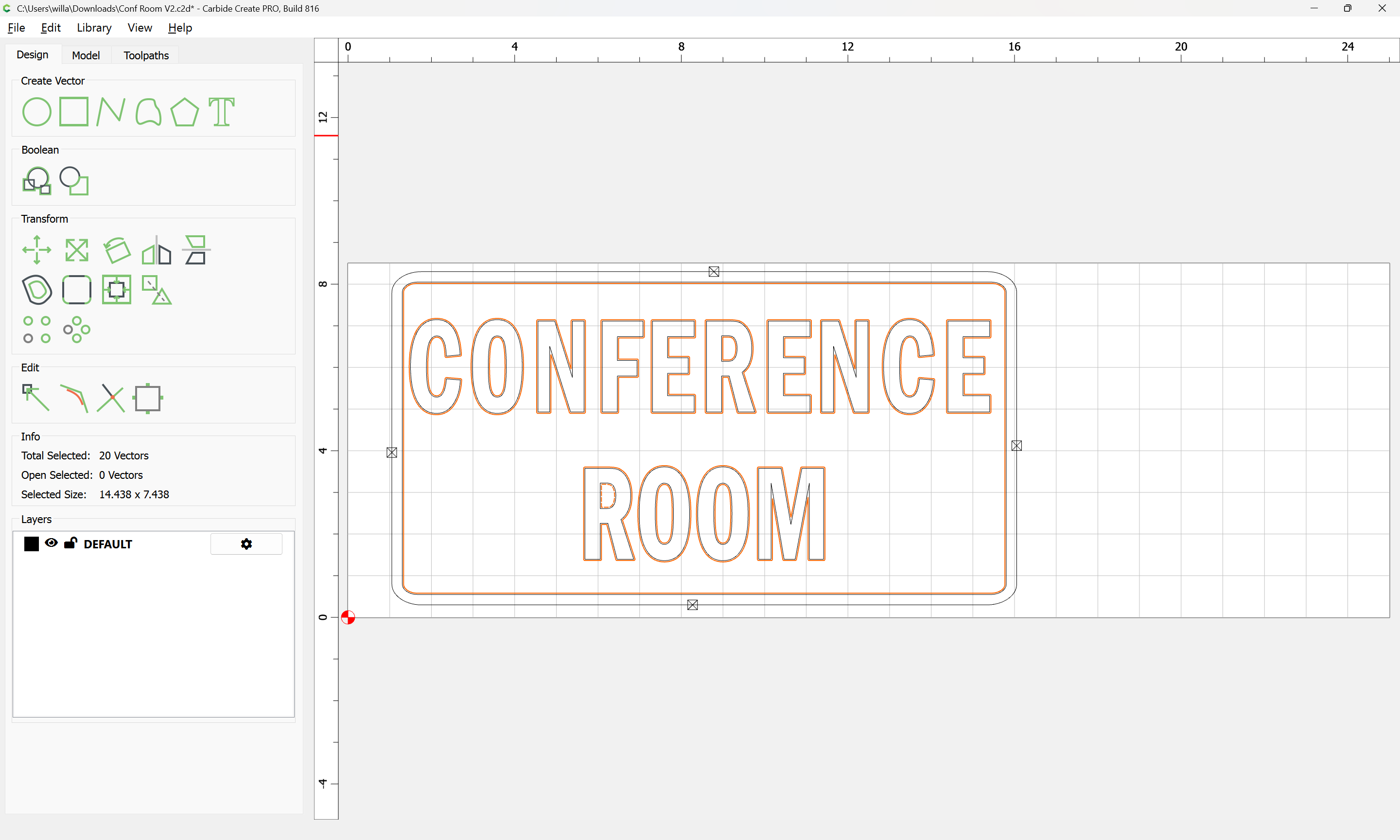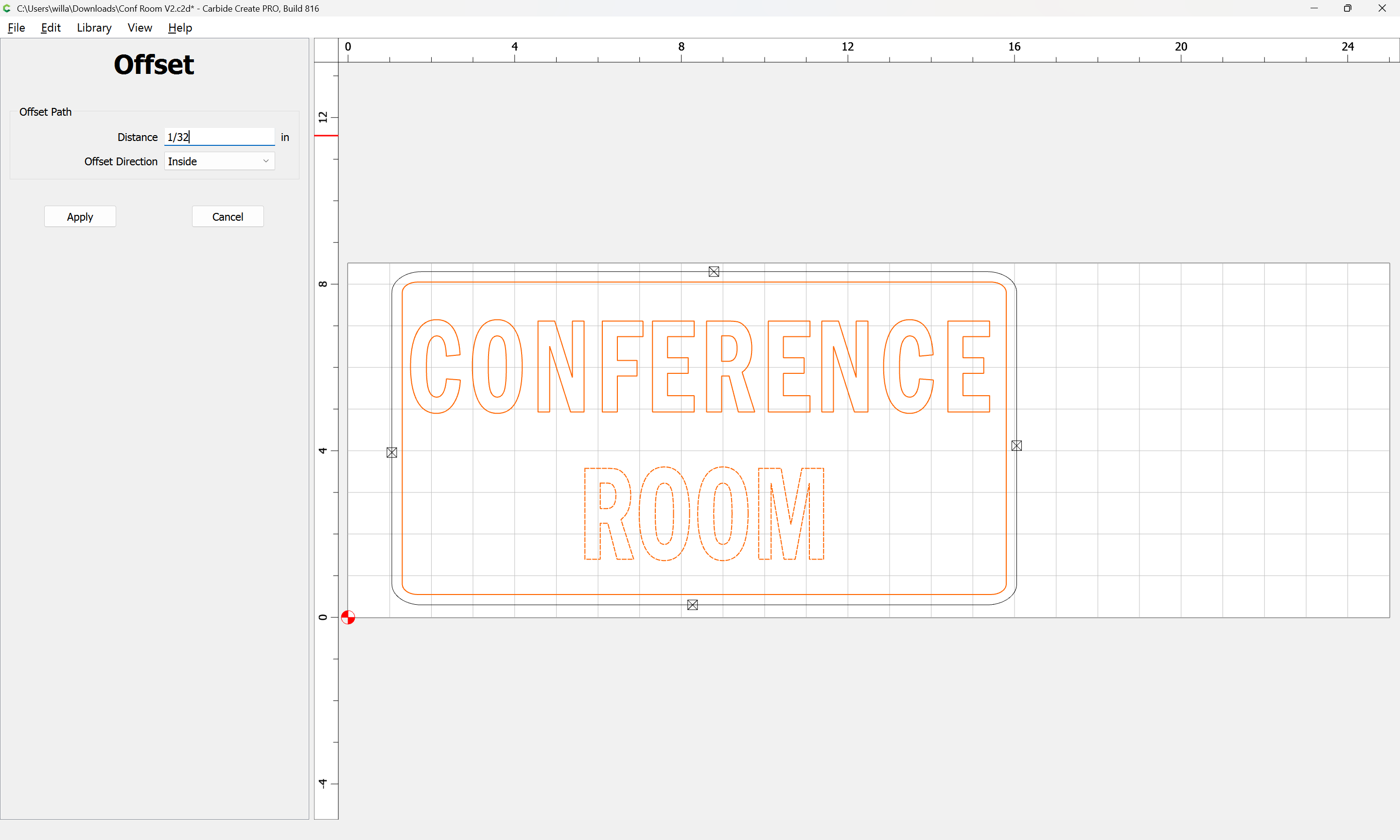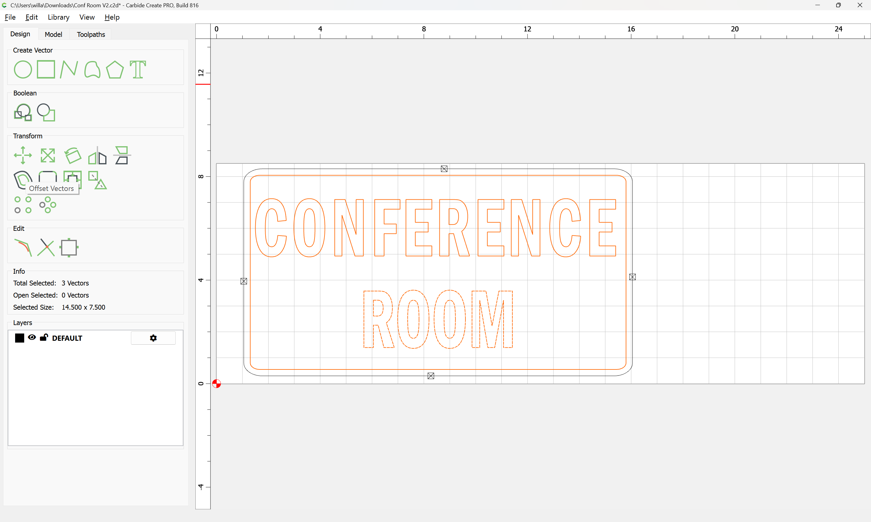 I have since added a 1/32 inch inner and outer offsets around the letters and added a rectangle containing all of them and created an additional facing toolpath within the rectangle to minimize cut time.