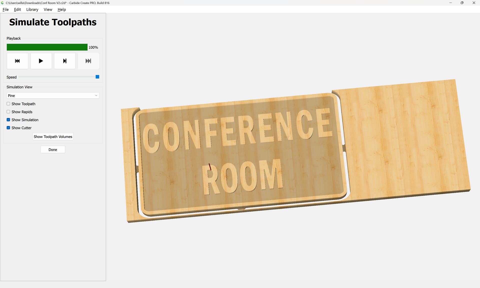 I attached the file. I am using a downcut bit because the church wants light colored lettering over a dark background. I have used a solid color stain over the wood before any machining and want to avoid/minimize any tear out around the letter edges. I have tried switching to straight and upcut bits for finishing passes and it doesn’t seem to make any difference. I originally set the initial cut to a depth of .195 and made a finishing pass of .005. It didn’t seem to help much.