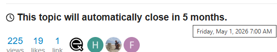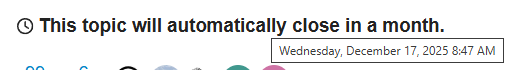 @mhotchin, the topic in question was created this October 18, and Rob’s post you quoted was from September 2023, so go figure. Thank you for finding that though, I thought I had read somewhere about closing 30 days from last reply. But it’s not a world-changing issue as long as topics can be re-opened…