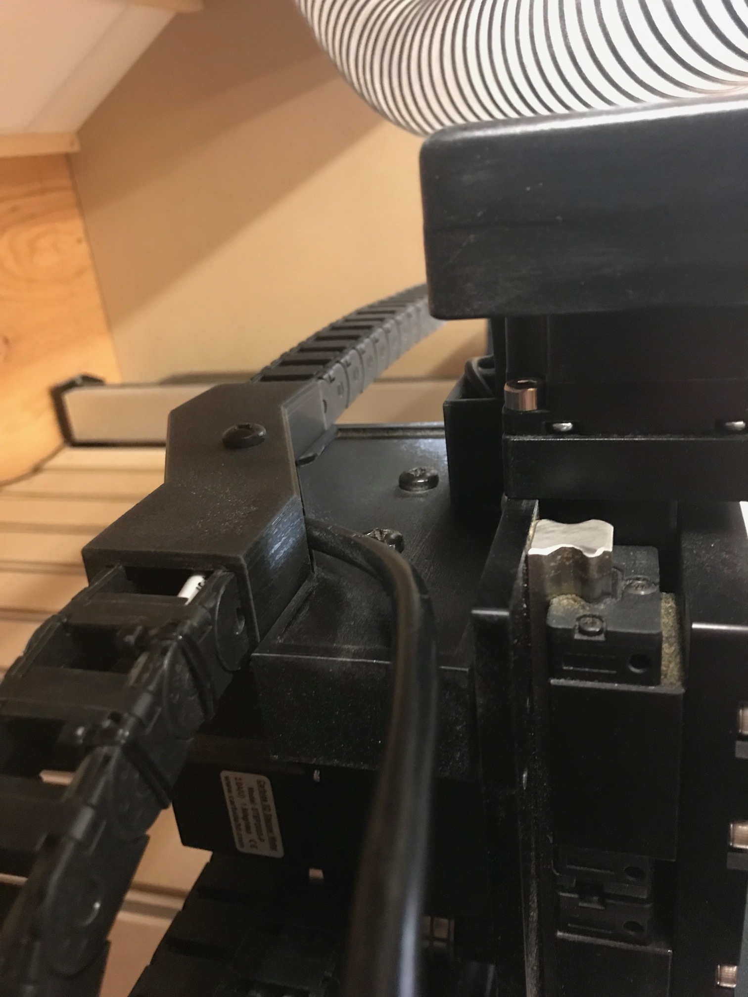 Note how the router power cable is ran. I added a thin cable clamp and mounted it under the side mounting bolt. then it runs underneath and straight into the Cable Chain. Much better and out of the way On a side note, I replaced the side mounting bolts with longer ones. After adding the Cable Chain brackets, there was only 2.5 thread holding them in the aluminum. That is not enough IMHO.