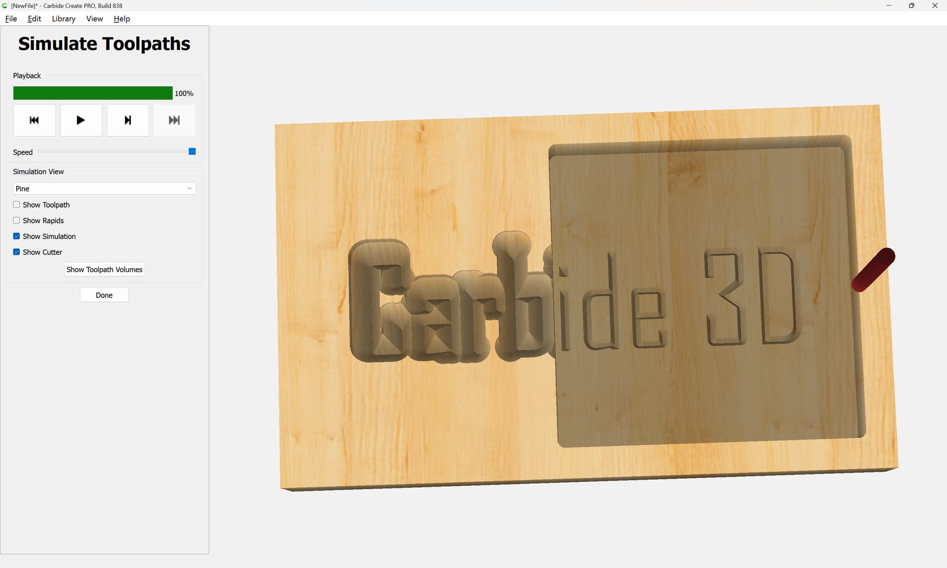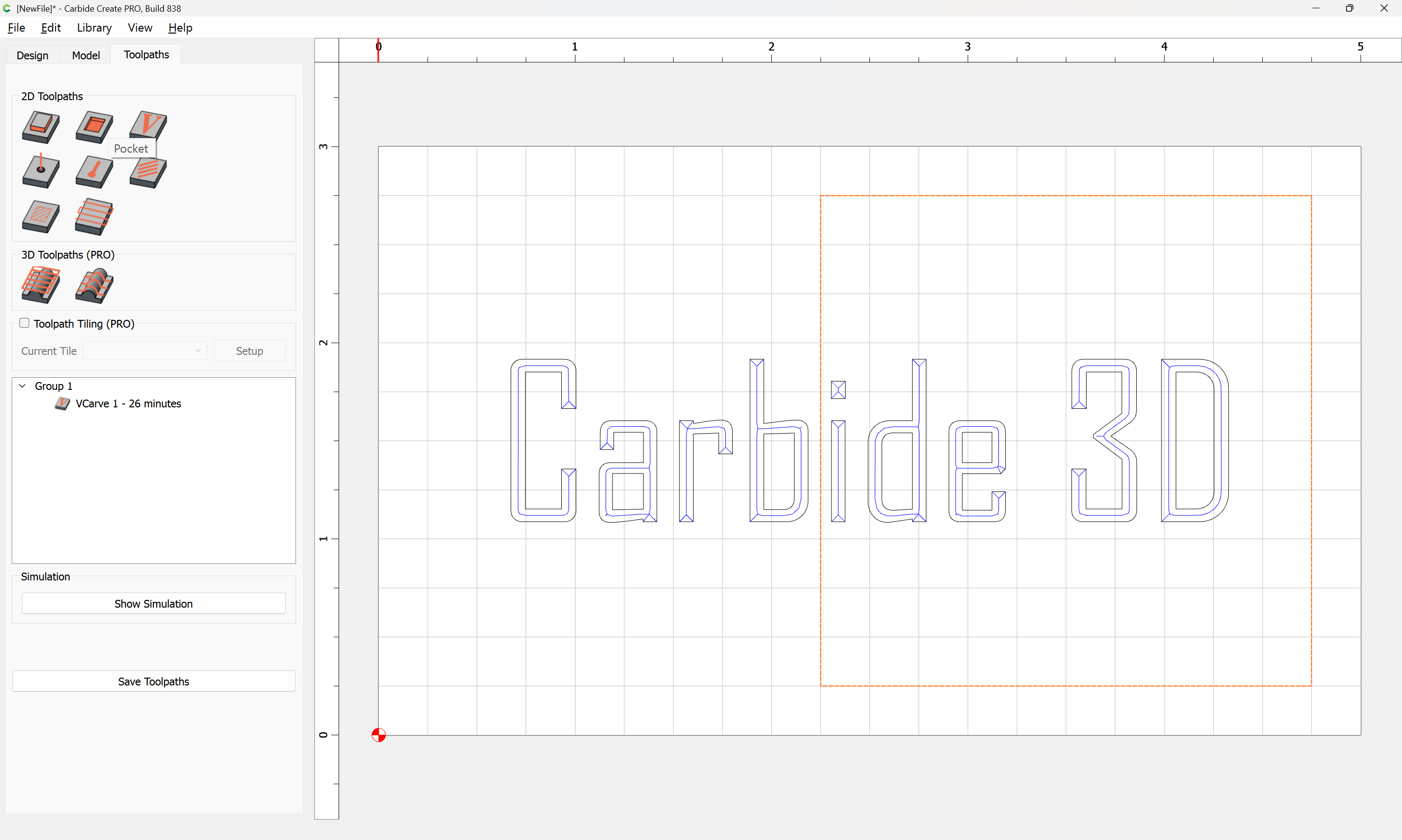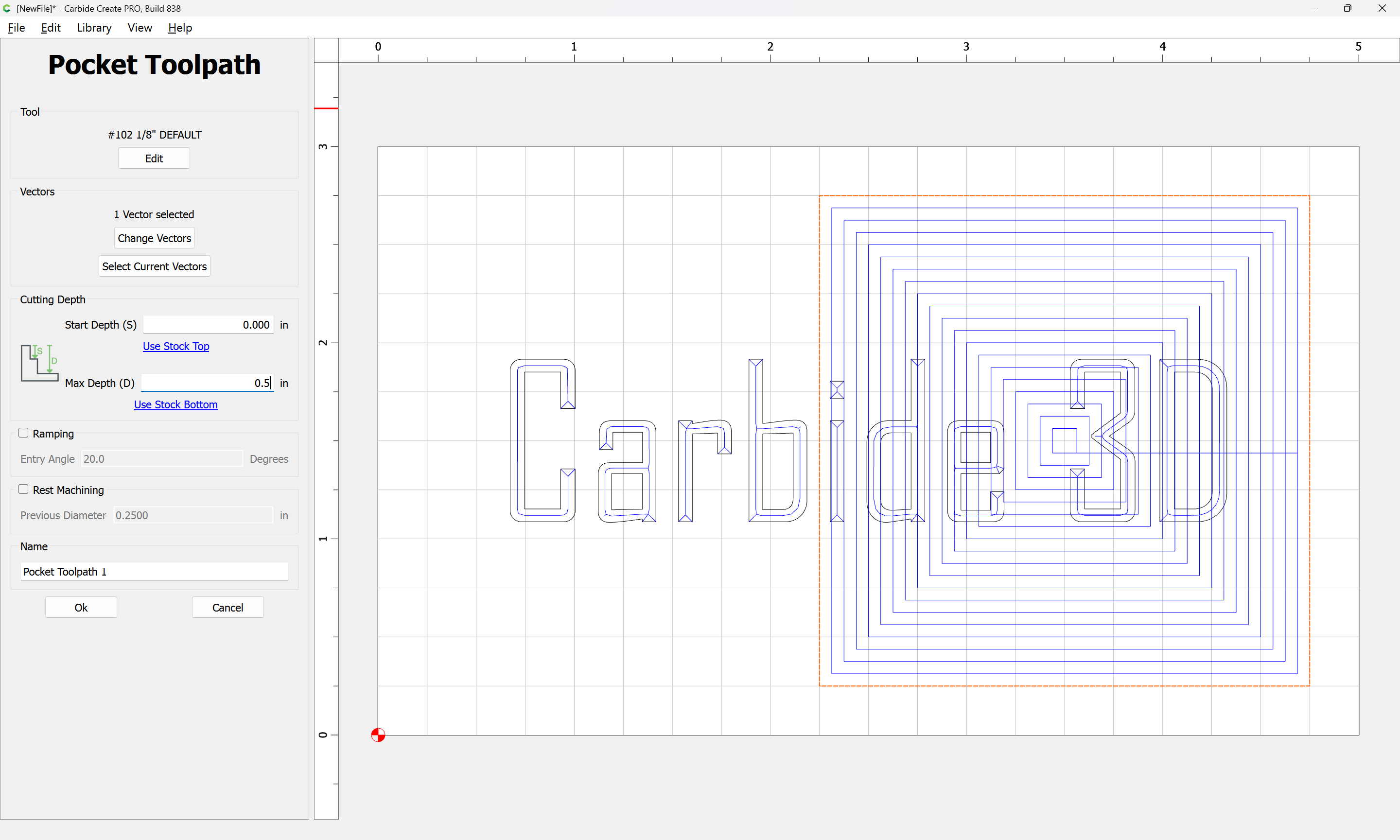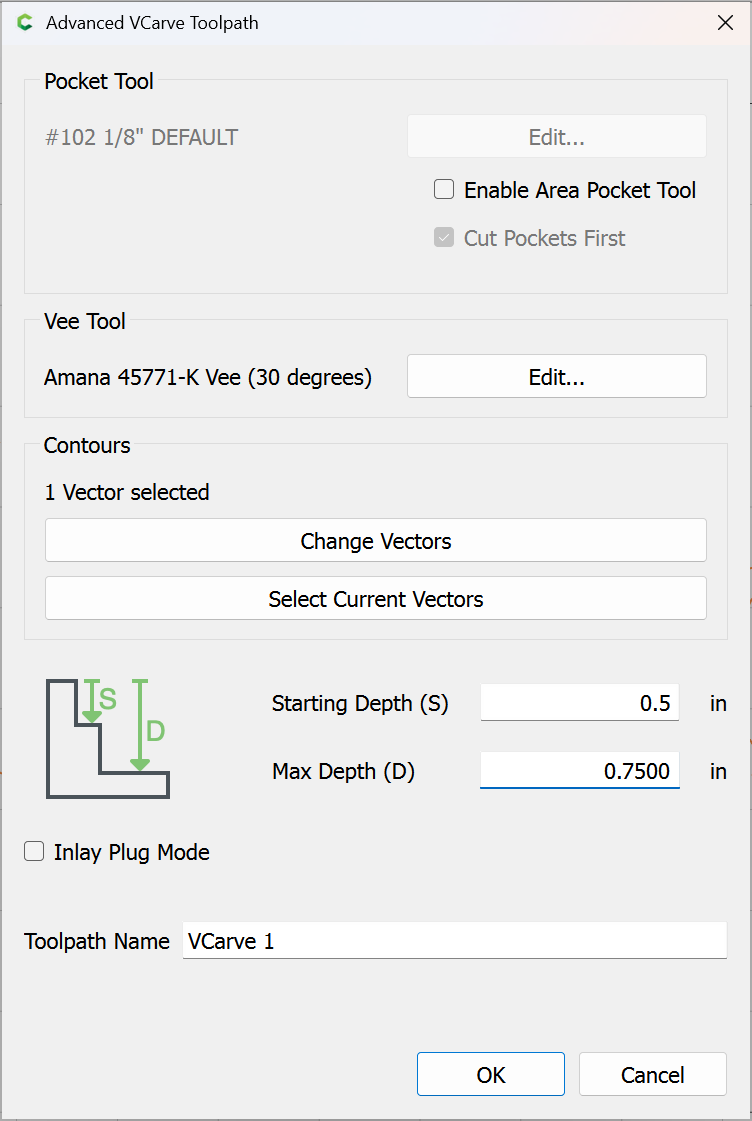 Hi Will. I appreciate the response. I’ve created this file which shows the problem I’m trying to describe. The left side starts at zero and goes to a depth of 0.1in. The right side starts at zero and goes to a depth of 0.025in. The shape it follows is different on the left, as you can really see on the "e"s. I would expect the tool would follow the same path on the right and the left just going to a different depth, not changing the path based on depth selected. I also added a pocket cutout to the left. Even though the vcarve was set to .1 and the pocket was set to a depth of .075 that should leave .025 of vcarve left in the pocket. There is nothing there but a few holes. The attached files shows the issue.