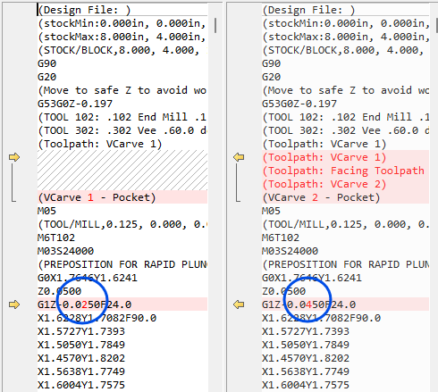“why the path is different from starting at the surface and going .025in down. Verses setting zero, surfacing .06in off, then having the vcarve set to go .085in deep”.