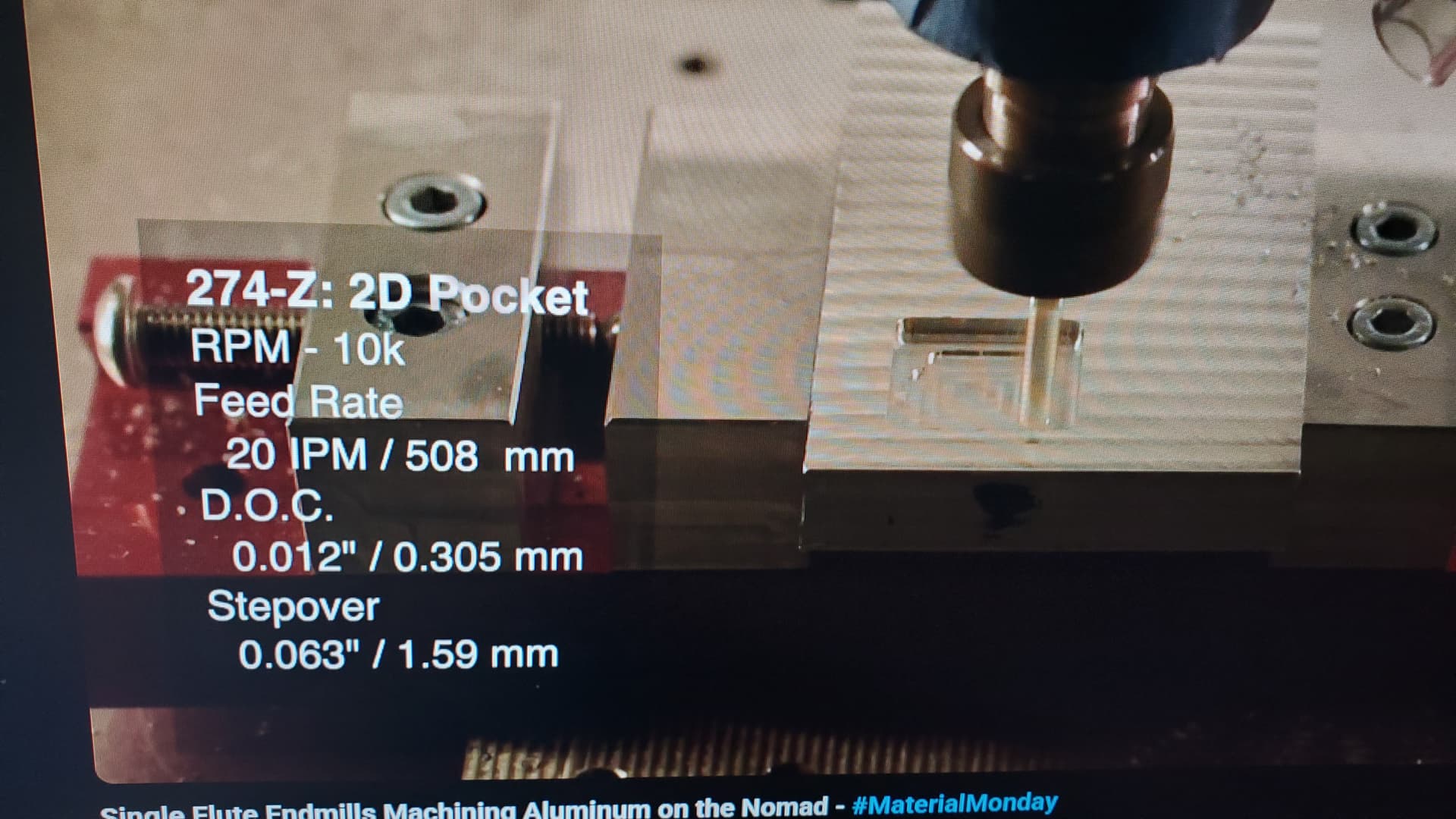 So it looks like, when I convert from mm to in, my cut was a little too deep (0.31mm) and and rpm was a lot lower (10,000) than the speeds and feeds shown above. For reference, I was using a Carbide video from 6 years ago for the Nomad. I think the combination of too deep and the material machining quality seems to be the problem (concluding this after I watched this video by Winston https://youtu.be/rm-qSytjFnI?si=sbQ9lgX5qnsL92RO). Looks like I’ll have to see if my coworker friend can get me some better material? I purchased two bits so hopefully I can make it work with a 2nd try. He’s willing to at least pay for supplies. I’m not sure I’ll charge him much in the end because I was wanting to help out his son (my son is in robotics as well, at a different school).