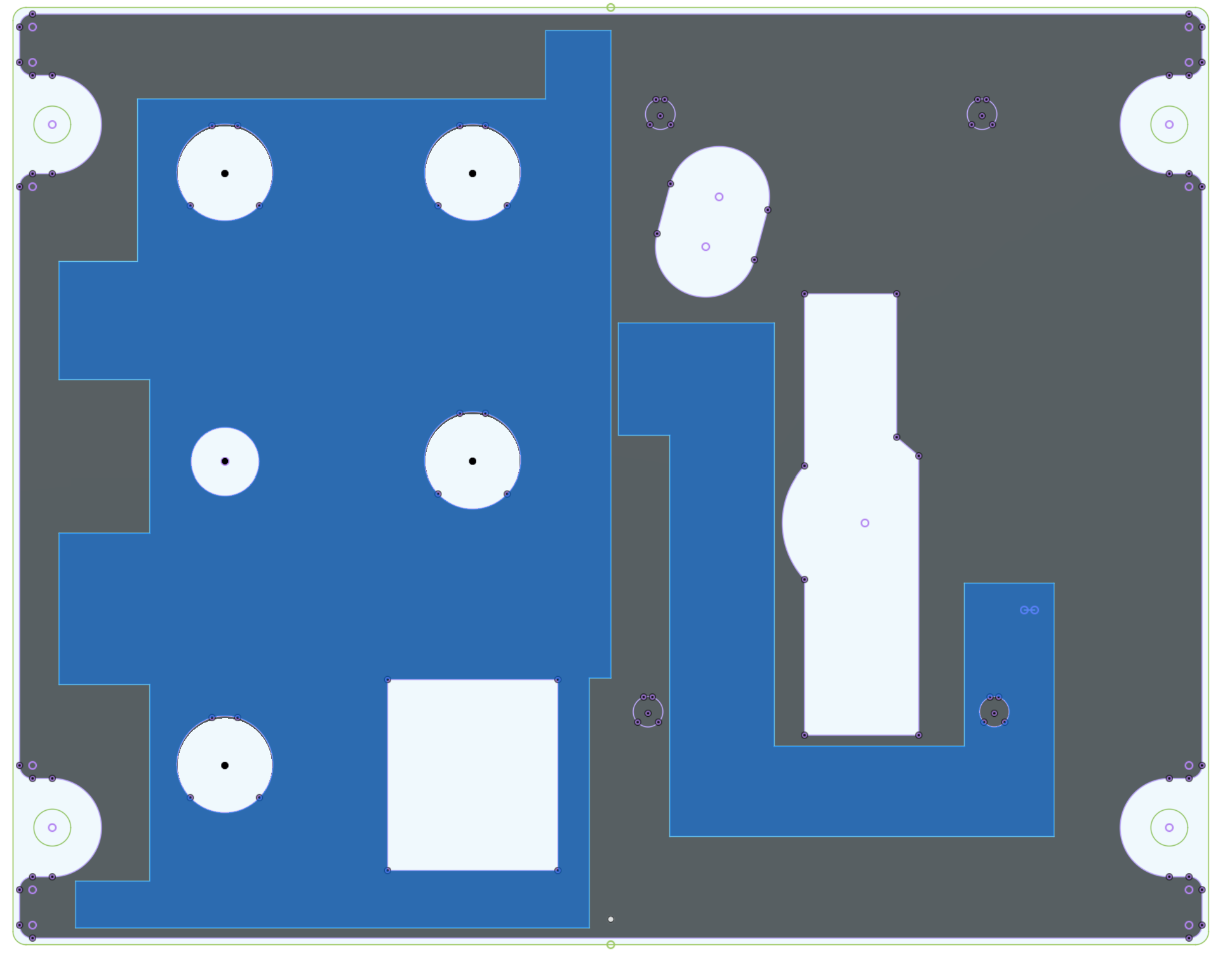 Sorry for the lack of clarity – I’m still trying to learn what’s relevant and what’s not. My main goal here was to use the small cutter reach areas the larger cutter can’t get into (which includes the tight corners). I don’t have CC Pro so rest machining isn’t available to me. From Michael’s post above, though, it sounds like I can approximate that by a pocket operation followed by a contour with the smaller tool. To see what I’m working on, see the attached image. The blue areas are the pockets. The panel itself (the gray area) will have previously been cut out with my CO2 laser cutter.