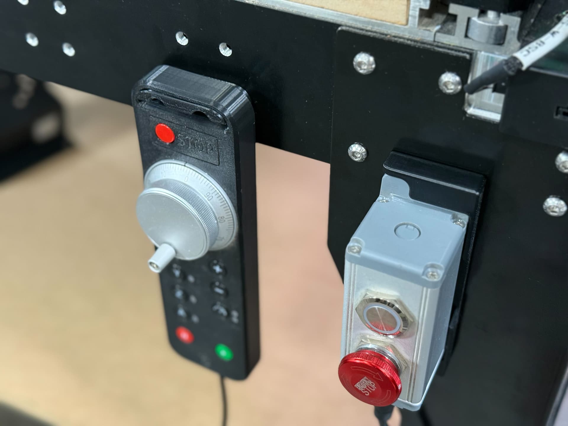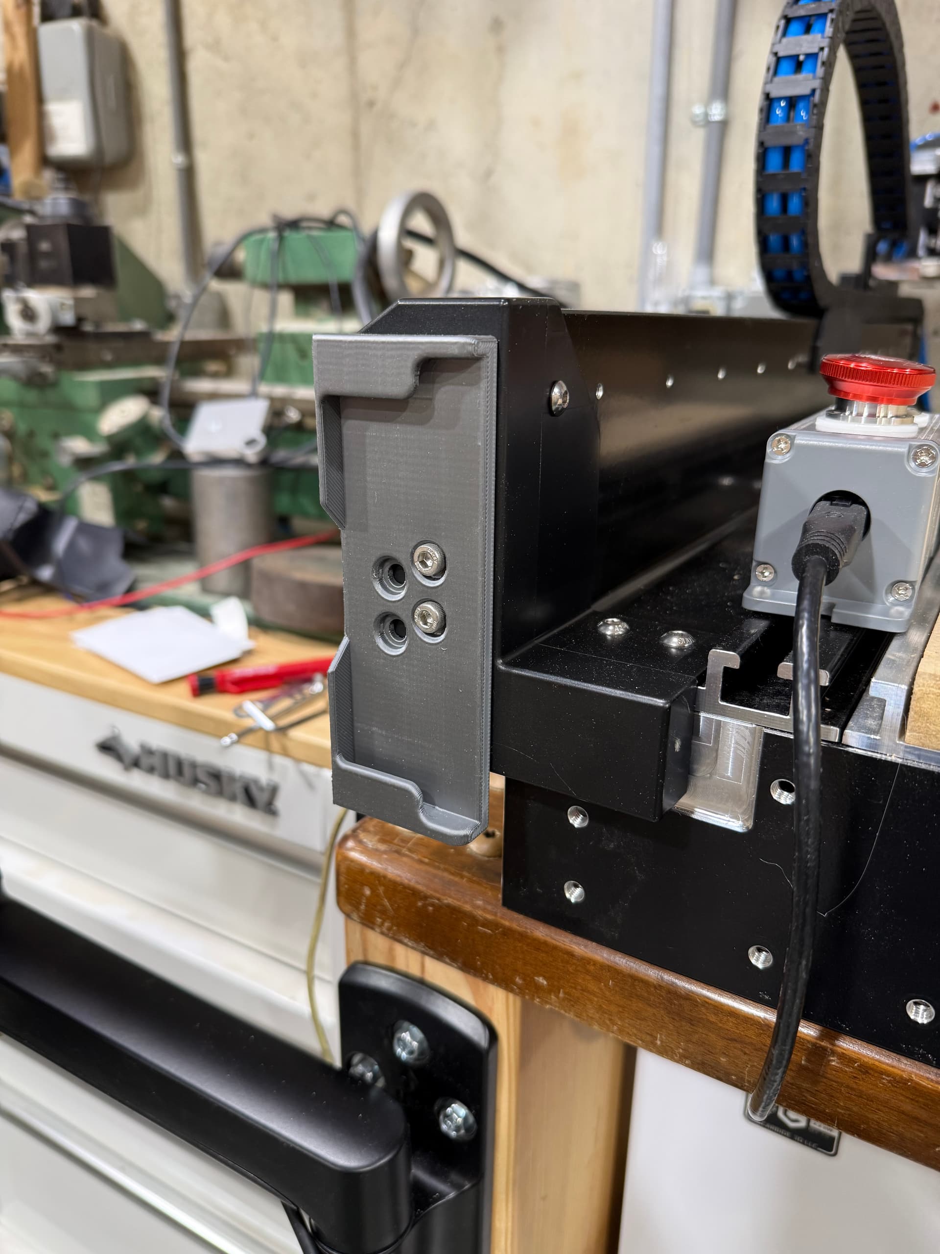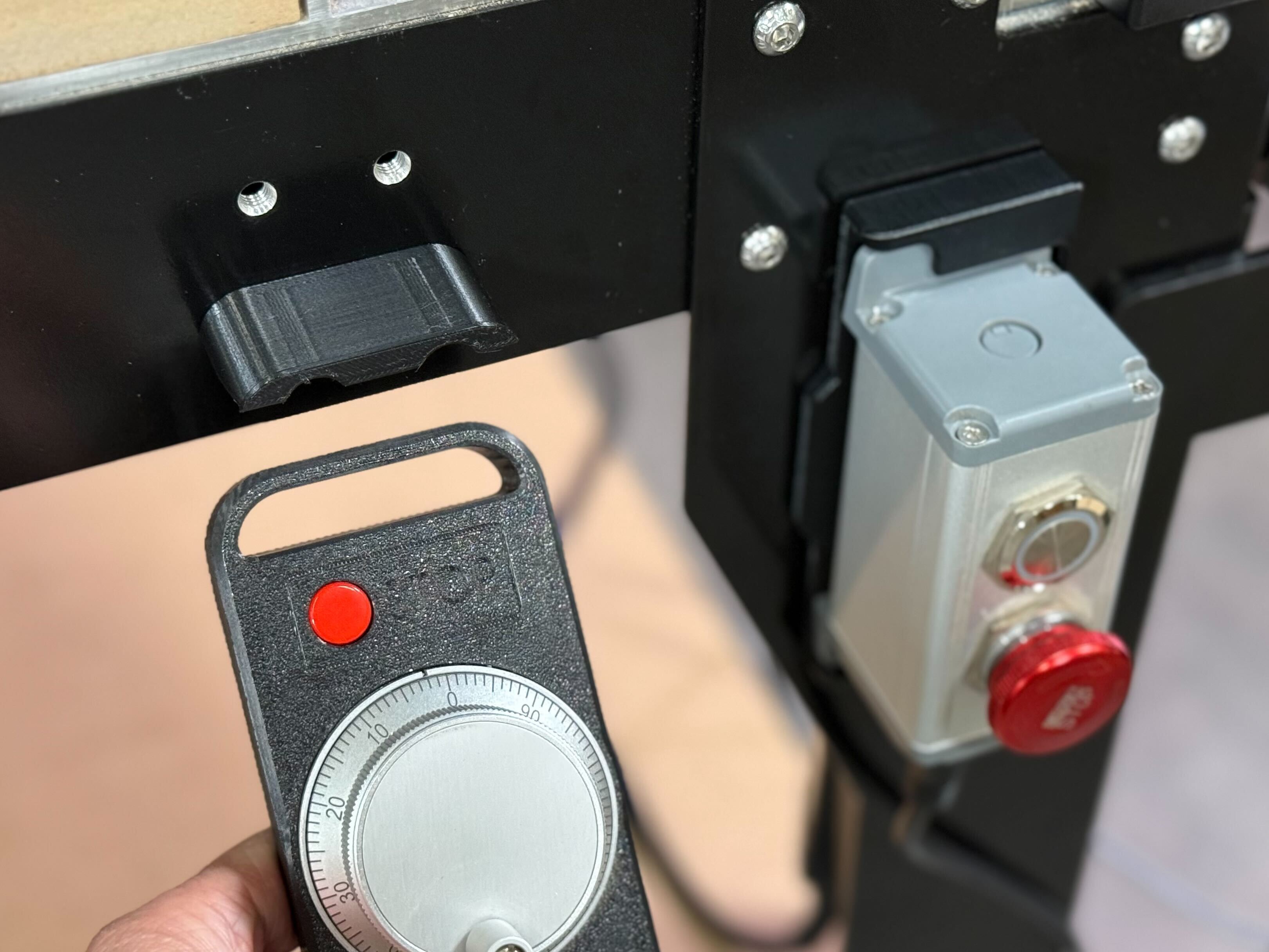 This dock (and hole pattern) is reversible, so you can position it in any orientation on the front-right corner of the machine. When I was working on this earlier, I would slap it on the side of the table, out of view. That position is also good if you don’t want to accidentally bump the e-stop button, but you do you.