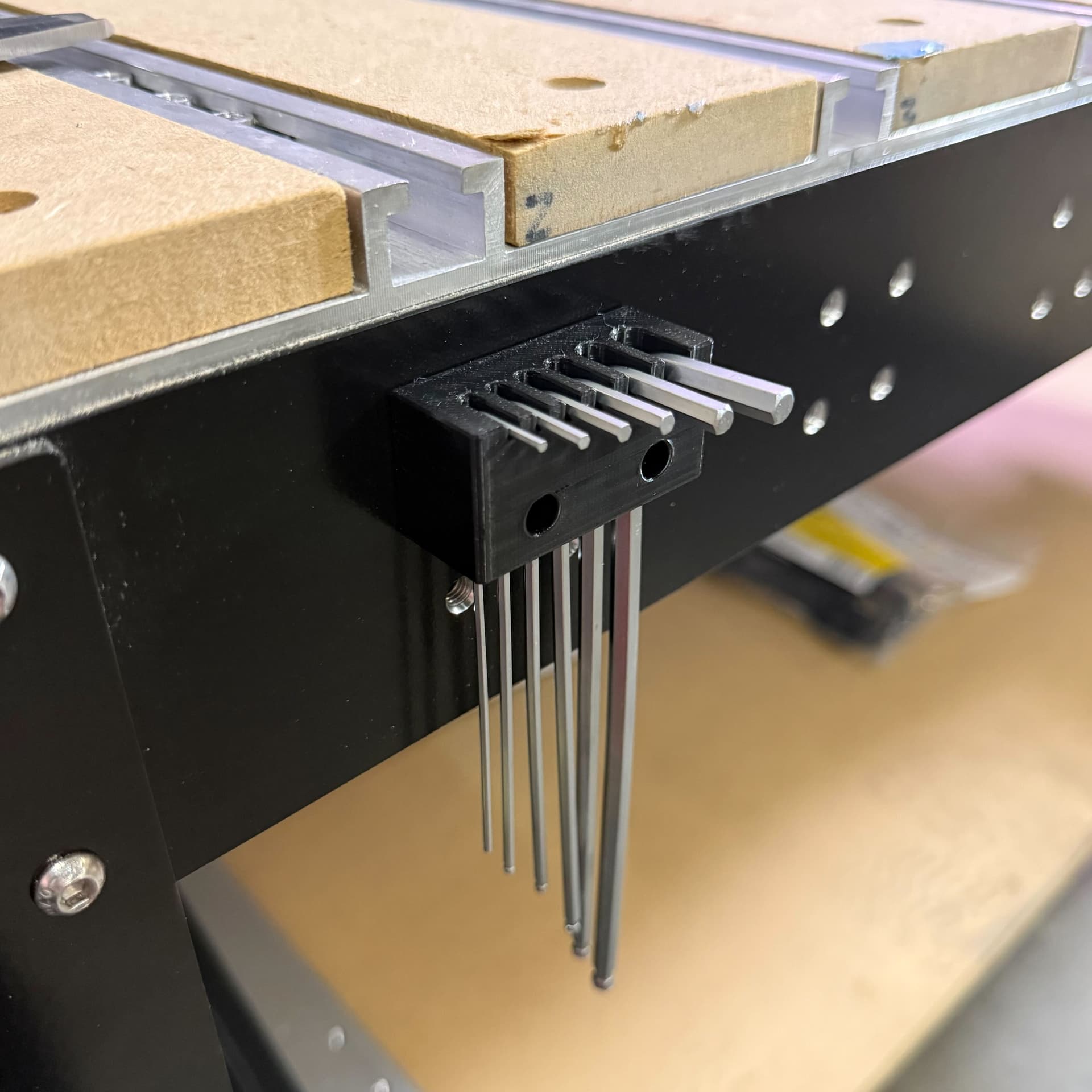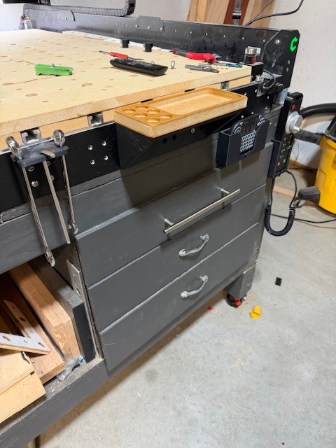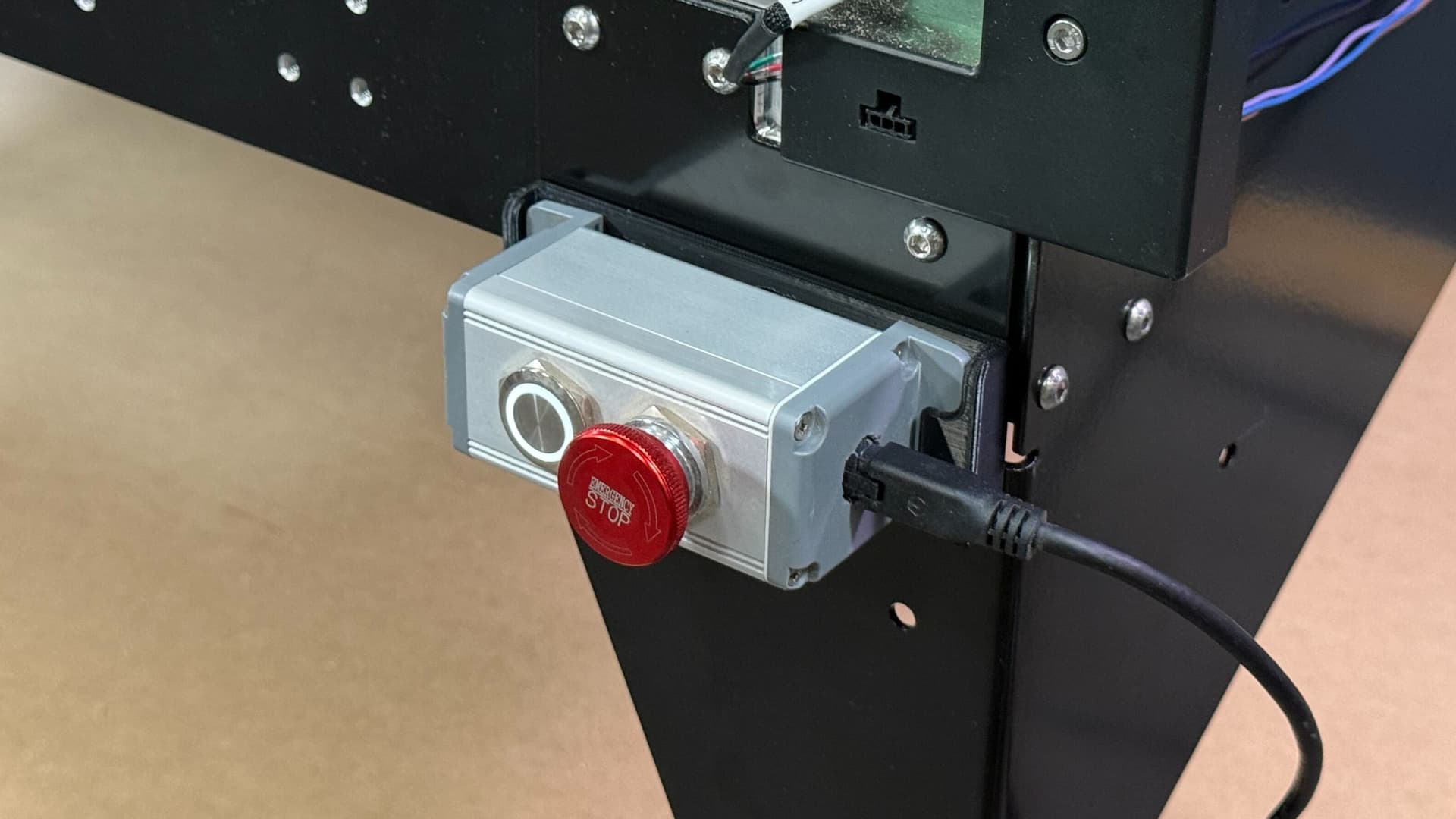 This dock (and hole pattern) is reversible, so you can position it in any orientation on the front-right corner of the machine. When I was working on this earlier, I would slap it on the side of the table, out of view. That position is also good if you don’t want to accidentally bump the e-stop button, but you do you.