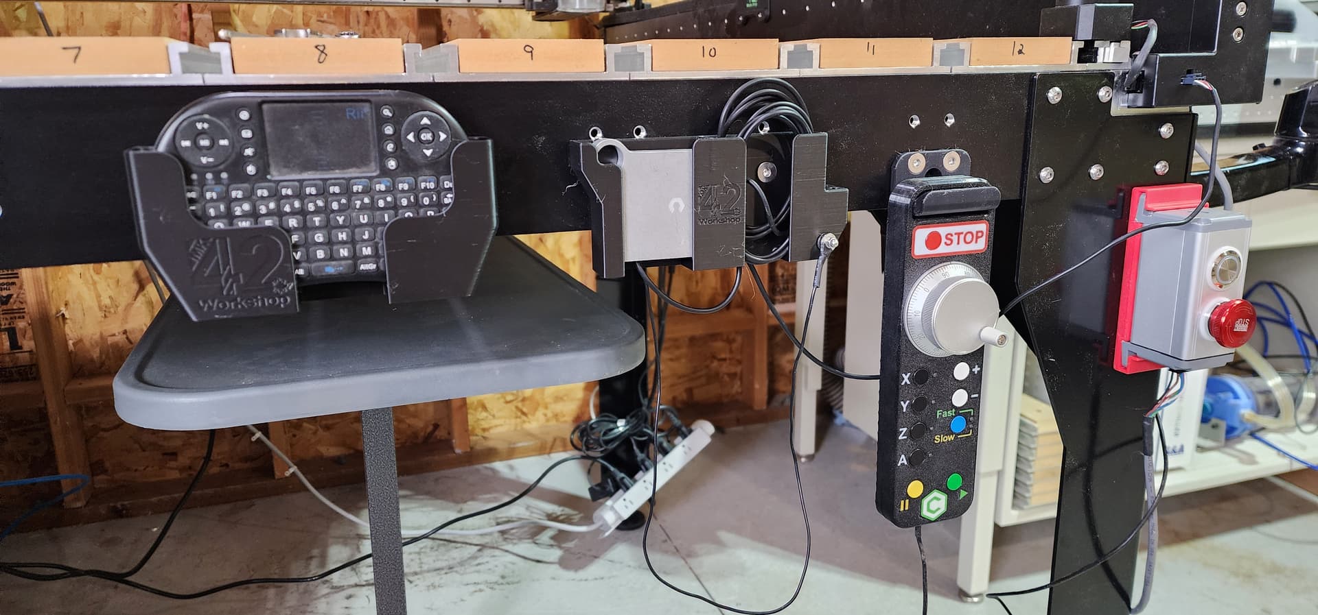 Slowly updating models to be compatible with the 5.1 front frame rail and the available holes on the legs. Also iterating on the Jog Pendant Hanger. A few revising to make things fit multiple places. Added a VESA 100mm pattern to the Rii Mini Kepad holder so I can place it behind my monitor. Since I got the Jog Pendant I don’t use it quite as much.