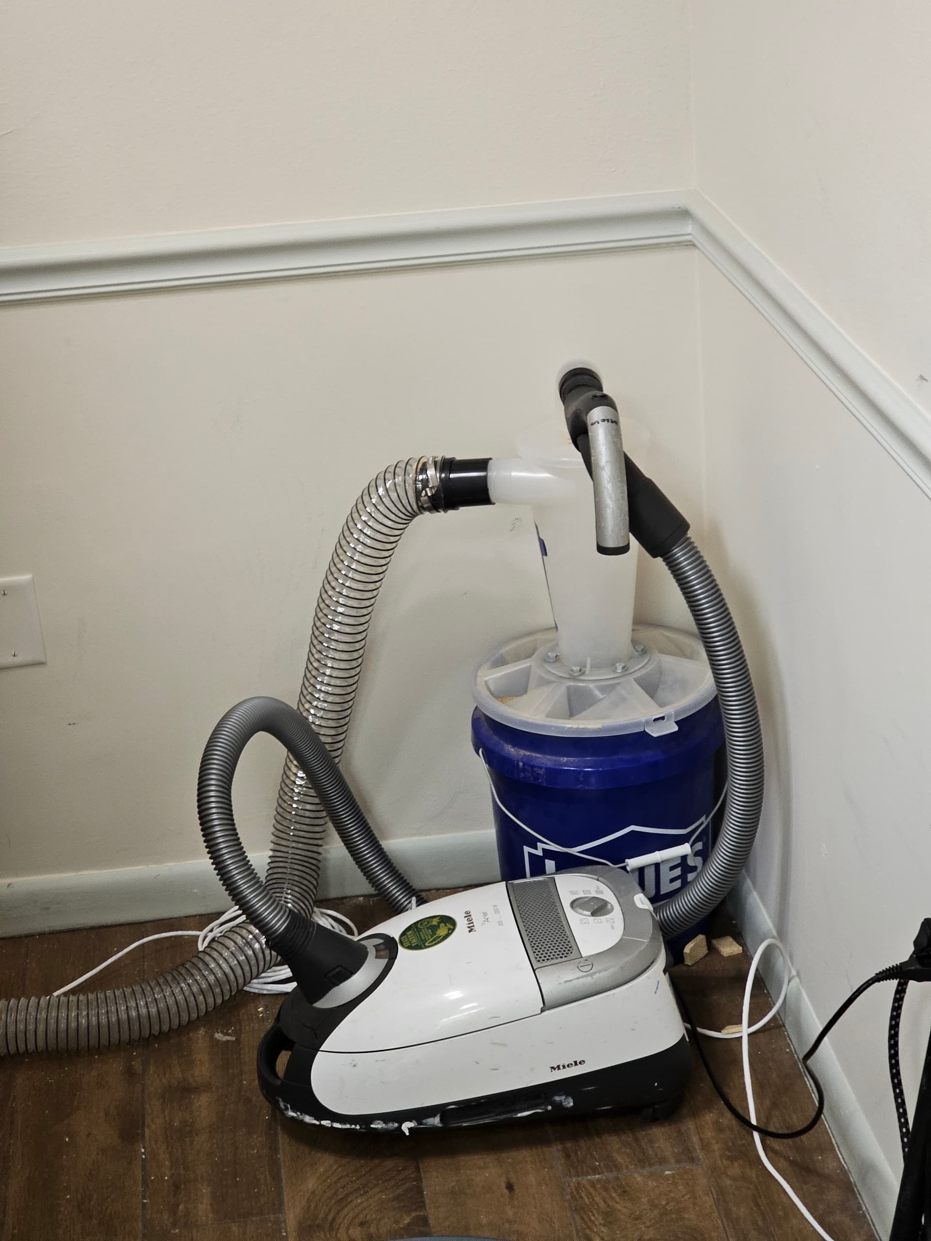 Dust collection is just an Oneida Deputy Cyclone on a 5 gallon bucket for now. That is probably going to get upgraded to a 55 gallon drum when I have time. I am using an old Miele vacuum with that. Miele vacuums are quiet by design. They have a second impeller on their exhaust that bumps the frequencies up into the ultrasound range. You can get them used on ebay for like $150 dollars. They also have a suction adjustment on them so you can dial in the amount of suction you use. Their lowest setting is still enough to clear saw dust and it is super quiet. They are also considered a high end vacuum, they last a very long time, and are designed to be serviced.